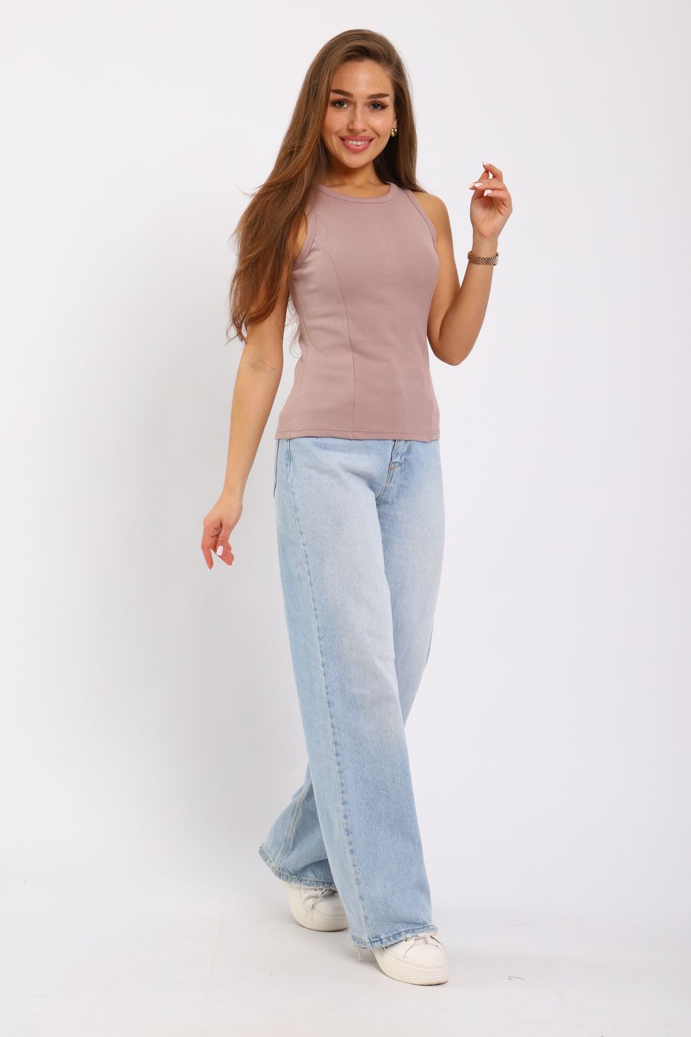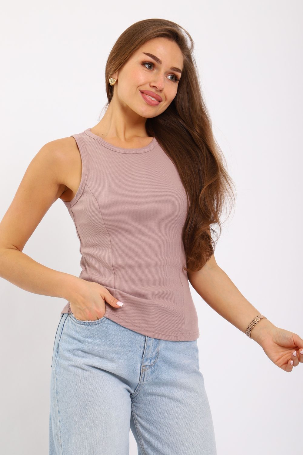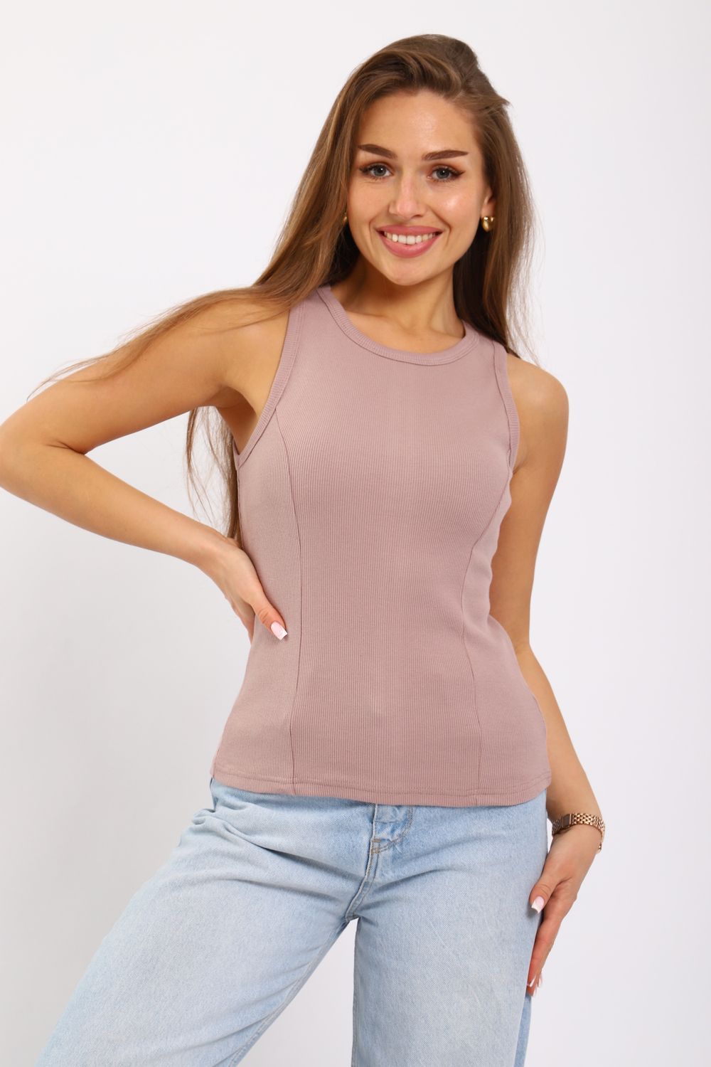 Майка женская из кашкорсе с отрезными бочками. Пройма и горловина майки обработаны окантовкой, низ подогнут на плоскошовной машине. Идеальный вариант для повседневной носки.