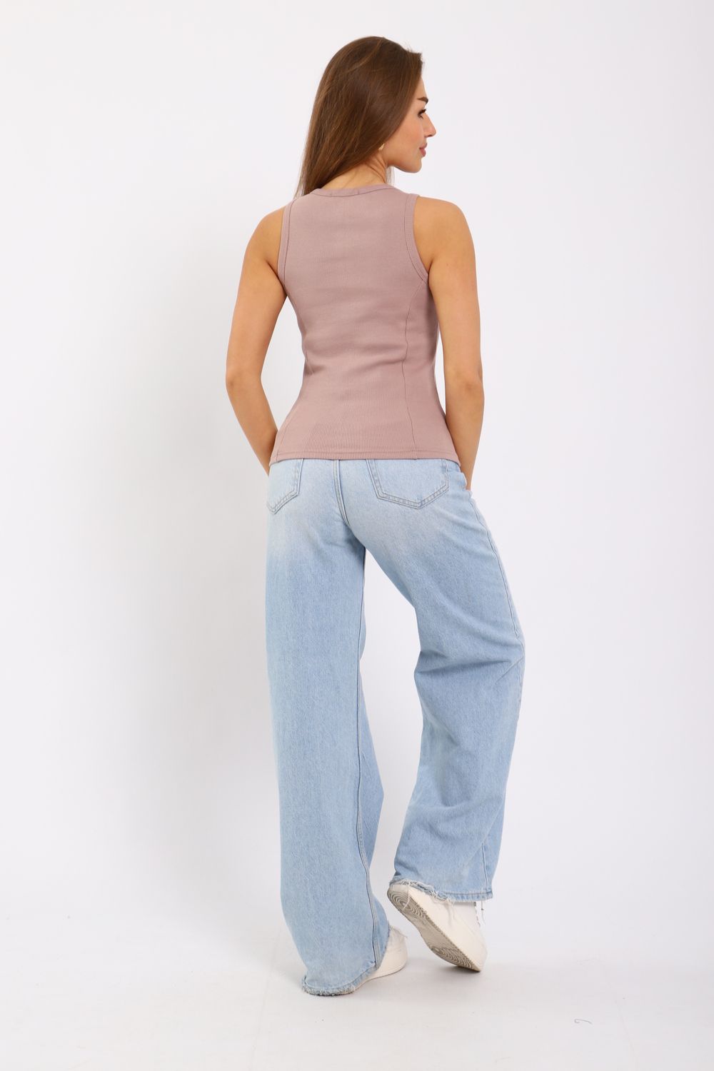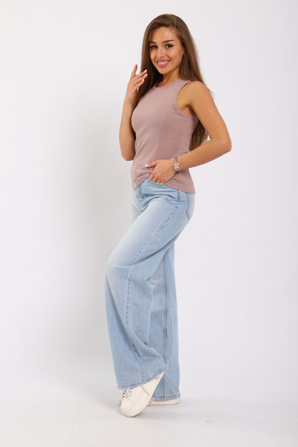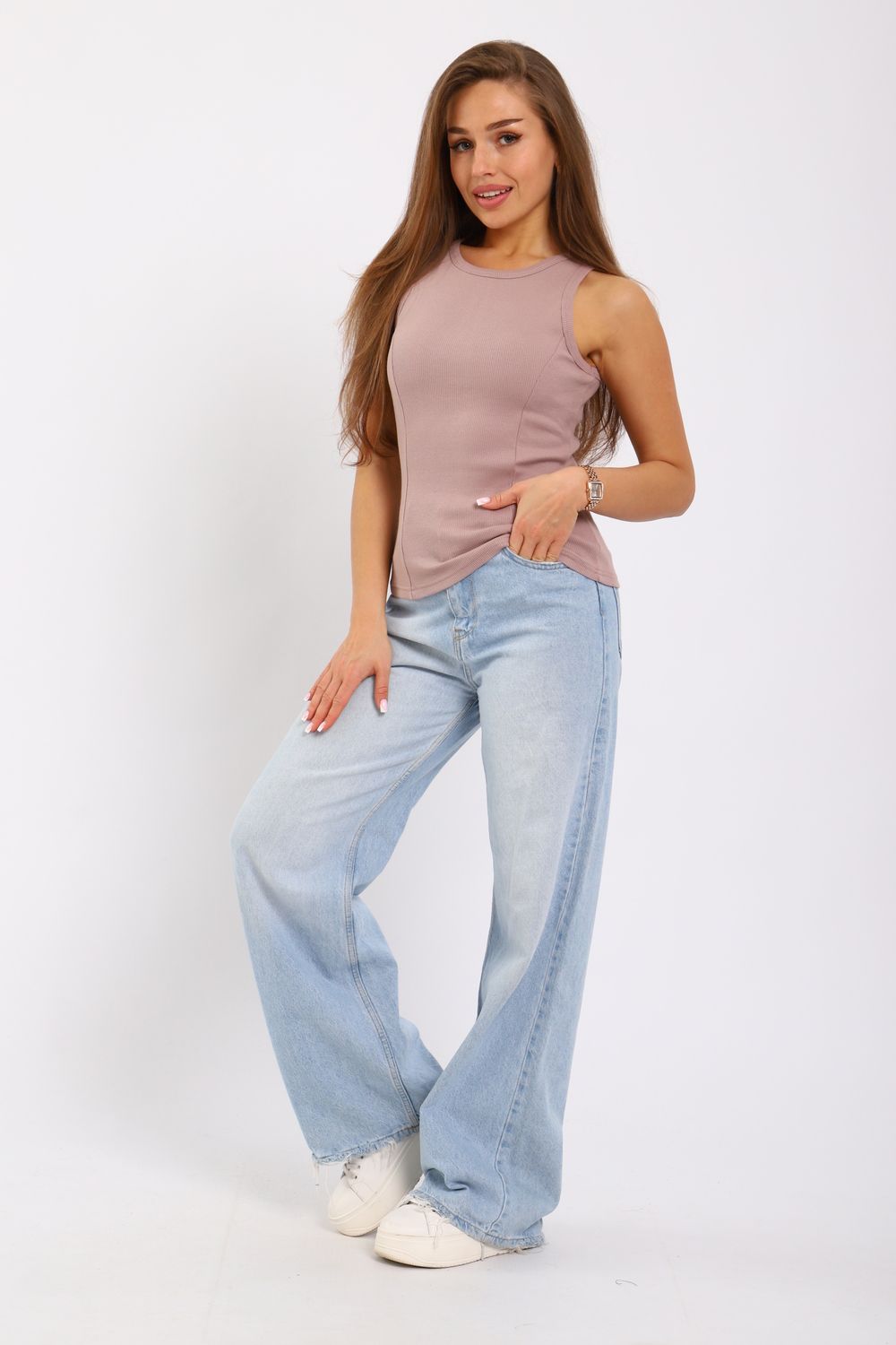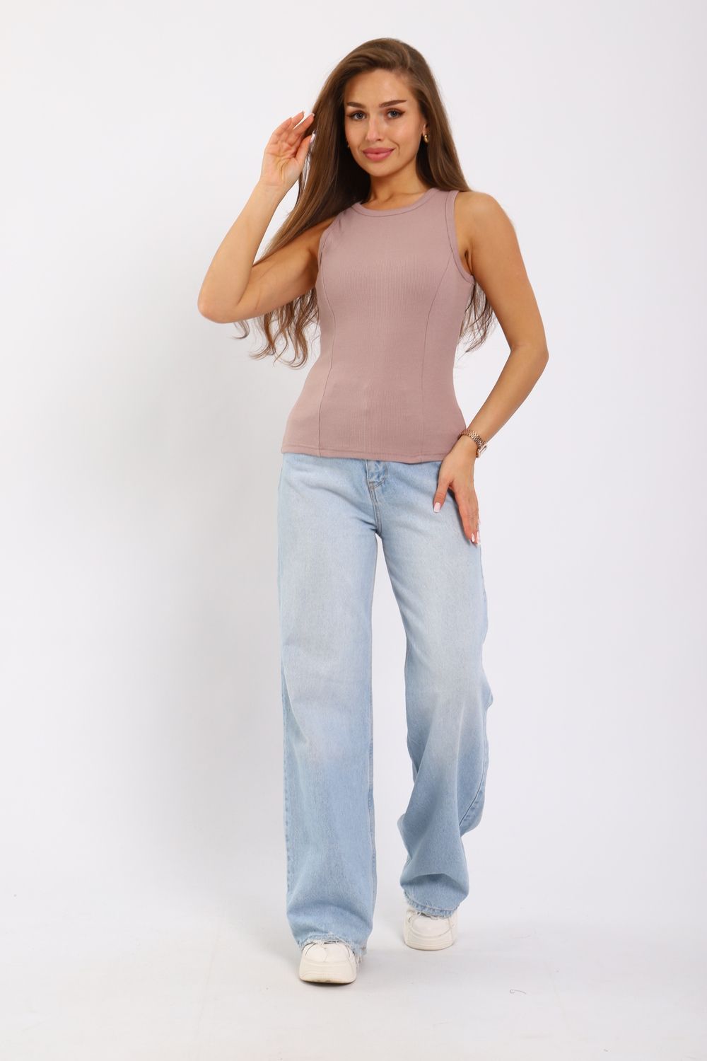 Майка женская из кашкорсе с отрезными бочками. Пройма и горловина майки обработаны окантовкой, низ подогнут на плоскошовной машине. Идеальный вариант для повседневной носки.