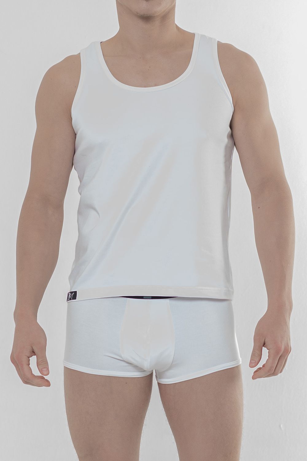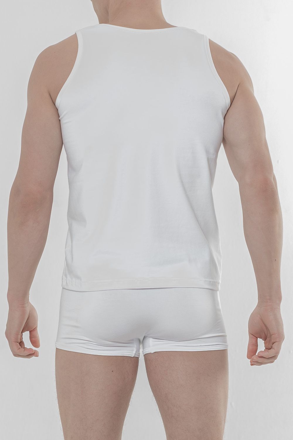 Майка мужская изготовлена из мягкого хлопкового трикотажа качества пенье. Майка однотонная полуприлегающего силуэта, длиной до середины линии бедер, с углубленным вырезом горловины и пройм, полочка и спинка майки прямые цельнокроеные.