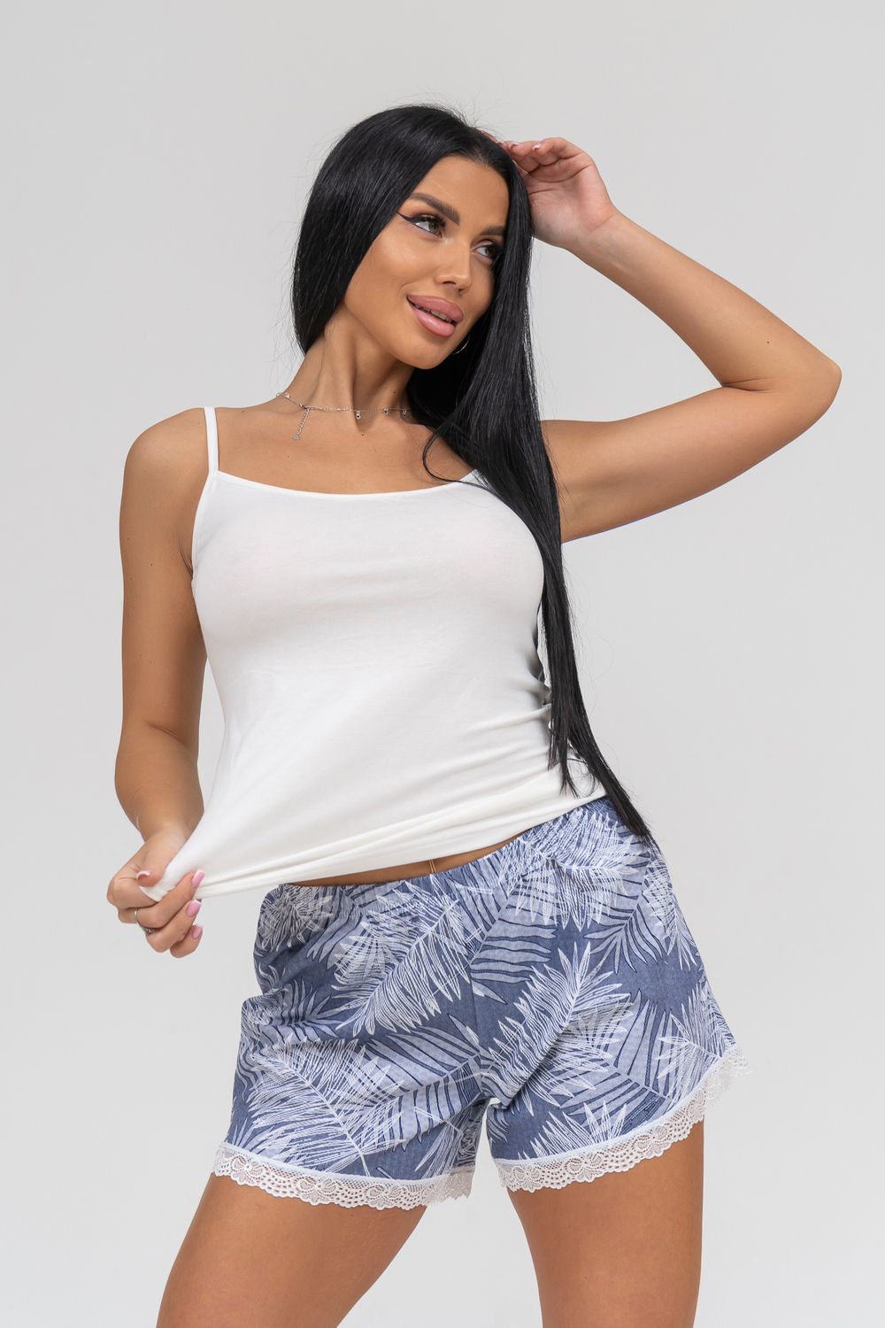 Комплект из топа и шорт. Удлиненный топ на бретелях из вискозы (95% вискоза, 5% лайкра), низ шорт из кулирки (100% хлопок) украшен ажурным кружевом.