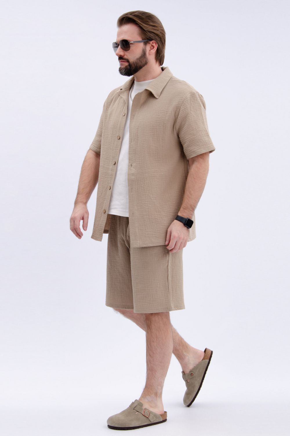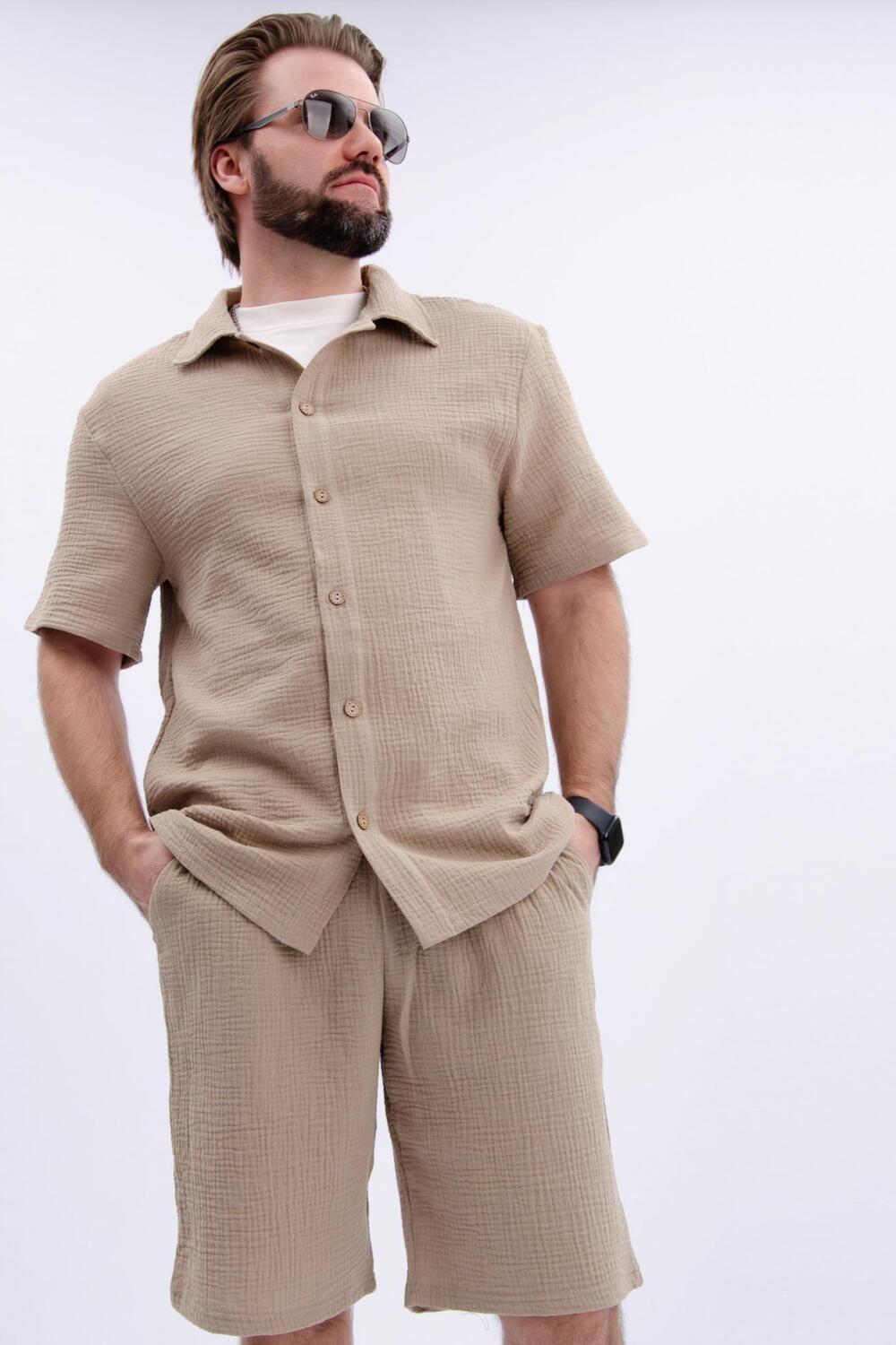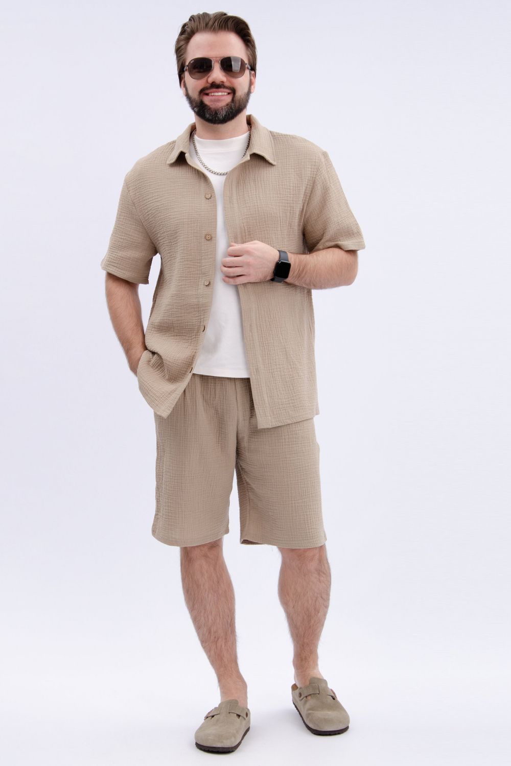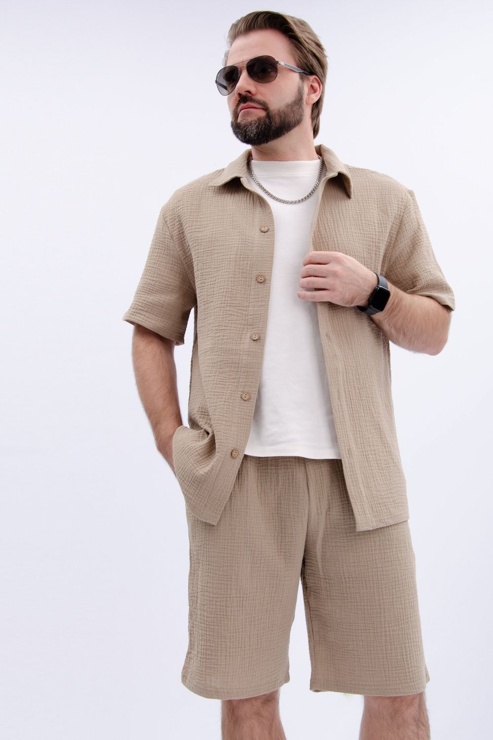 Костюм мужской с шортами и рубашкой Мэтью - это идеальный выбор для тех, кто ценит качество и стиль. Этот комплект одежды изготовлен из высококачественного материала муслин-100% хлопок, который обеспечивает комфорт и долгую службу.