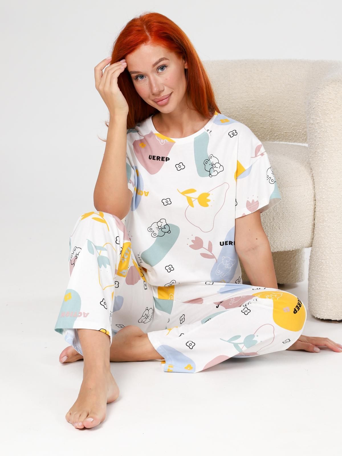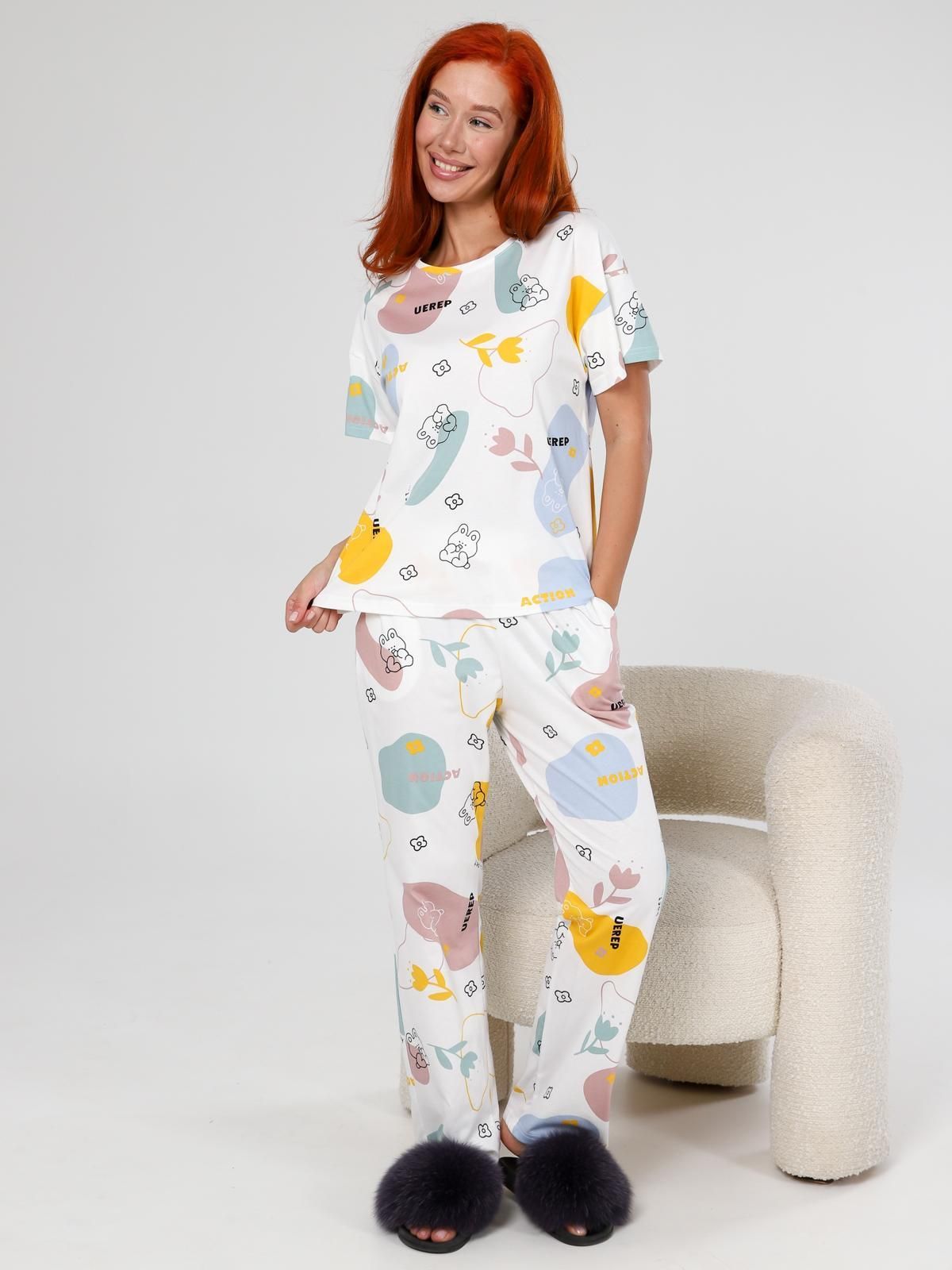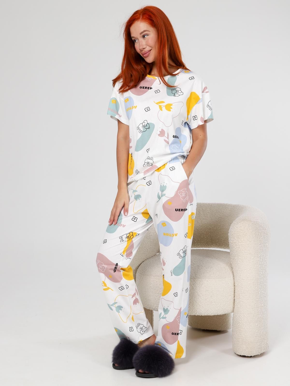 Пижама "Мирин" из набивного трикотажного полотна "кулирка" состоит из футболки и брюк. Футболка свободного покроя со спущенной линией плеча, короткими втачными рукавами, горловиной овальной формы, обработанной втачной планкой. Брюки длинные, свободного покроя, на притачном поясе с эластичной лентой и карманами в боковых швах.