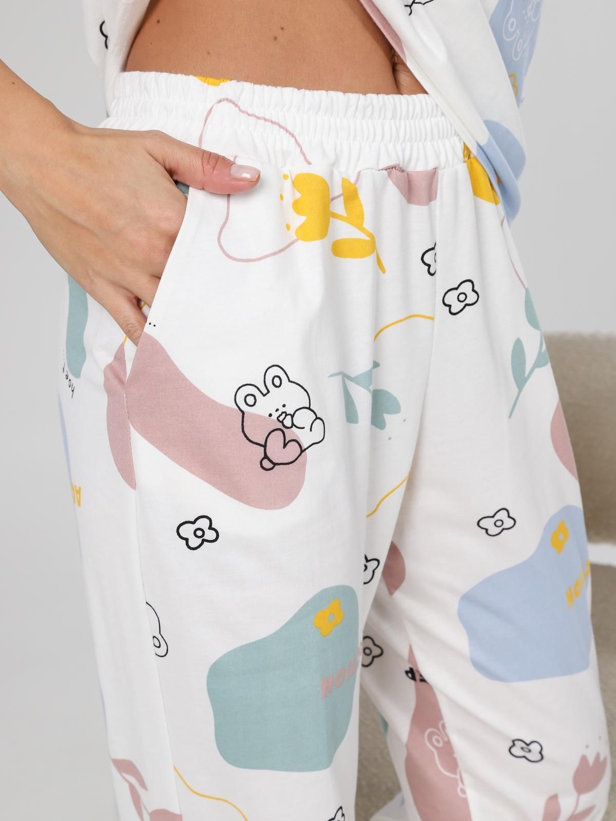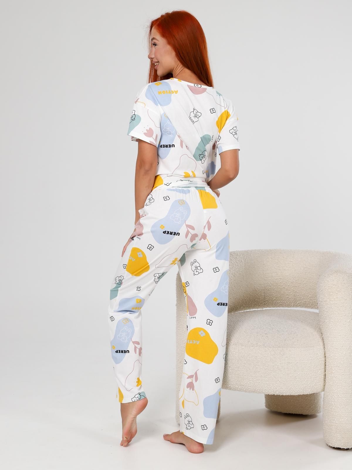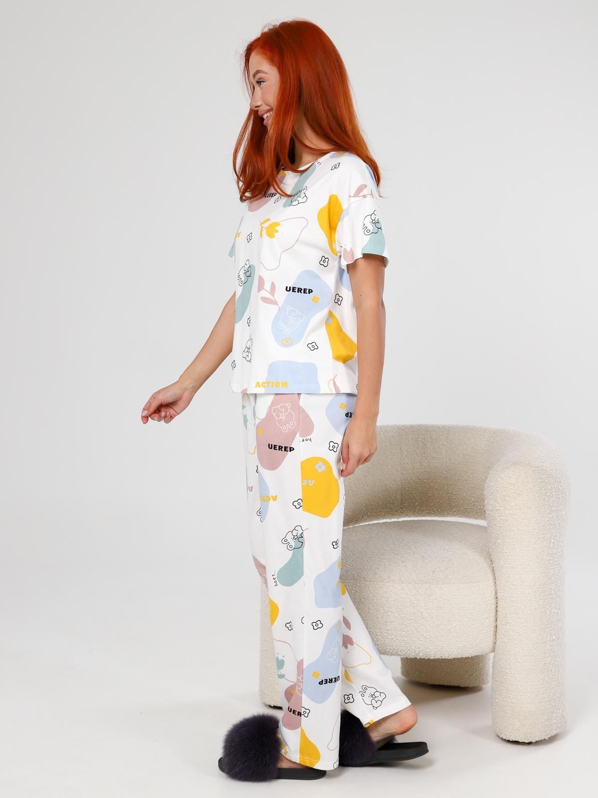 Пижама "Мирин" из набивного трикотажного полотна "кулирка" состоит из футболки и брюк. Футболка свободного покроя со спущенной линией плеча, короткими втачными рукавами, горловиной овальной формы, обработанной втачной планкой. Брюки длинные, свободного покроя, на притачном поясе с эластичной лентой и карманами в боковых швах.