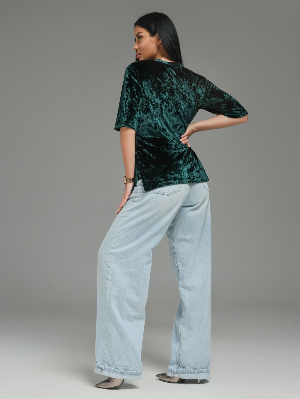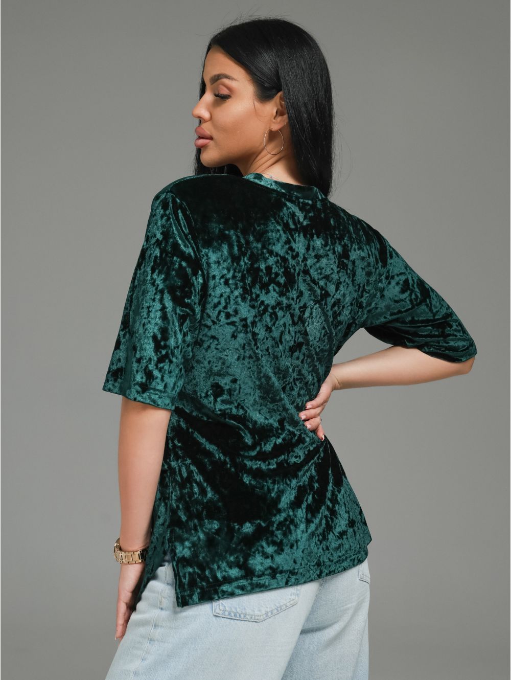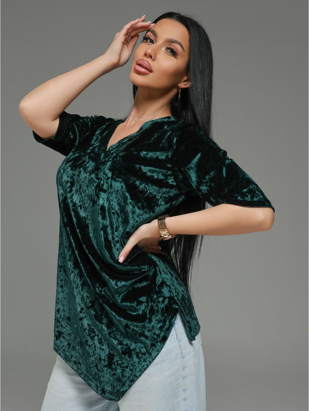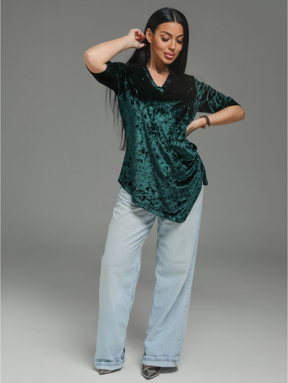 Вышли за рамки обыденного. Мия- то не просто футболка. Это архитектурный объект для вашего тела, где роскошь бархата встречается со смелым дизайном.