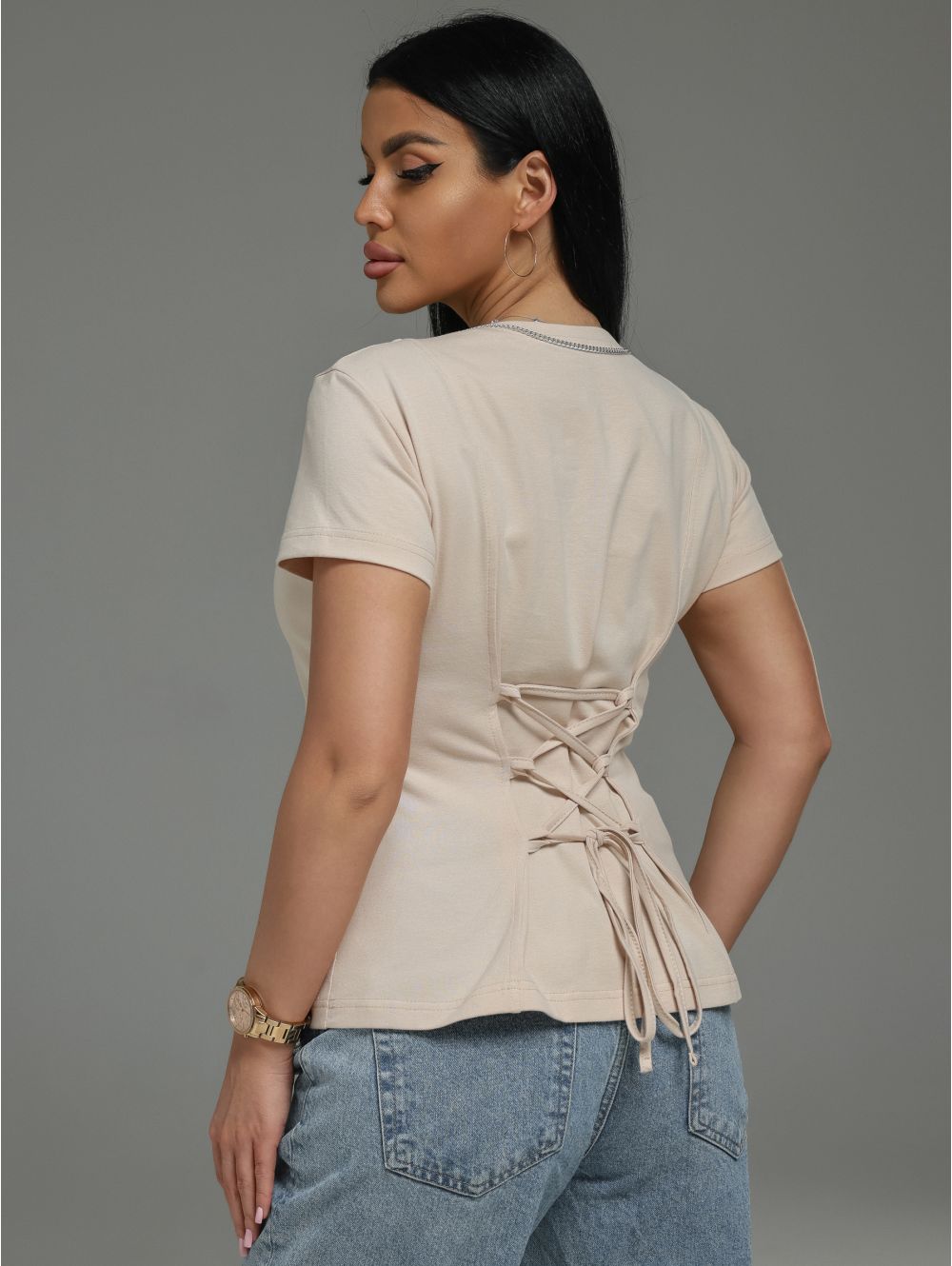 Характер модели:Идеальный баланс между строгой архитектурой (вертикальные рельефы, приталенный крой) и игривой неожиданностью (регулируемая драпировка на спинке). Футболка подойдёт как для офиса (с брюками или юбкой-карандаш), так и для романтического свидания или встречи с подругами. Премиальная ткань говорит о вашем безупречном вкусе, а деталь на спинке станет тем самым «вау-эффектом», когда вы повернётесь спиной.