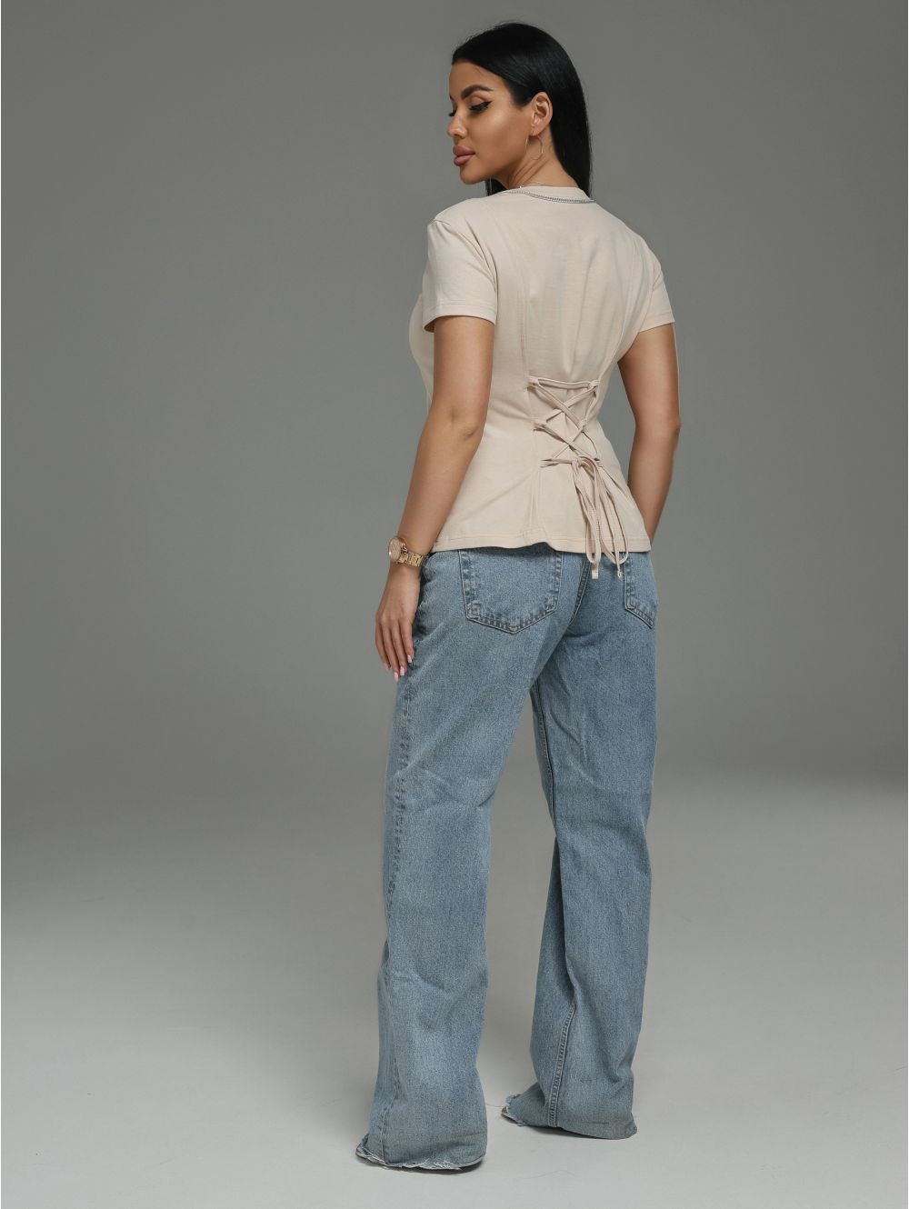 Как это работает: Затягивая или ослабляя шнур, вы создаёте мягкую, элегантную драпировку на спинке. Можно оставить лёгкую сборку, а можно затянуть плотнее — каждый раз силуэт будет выглядеть по-новому. Это превращает лаконичную с виду футболку в настоящую трансформер.