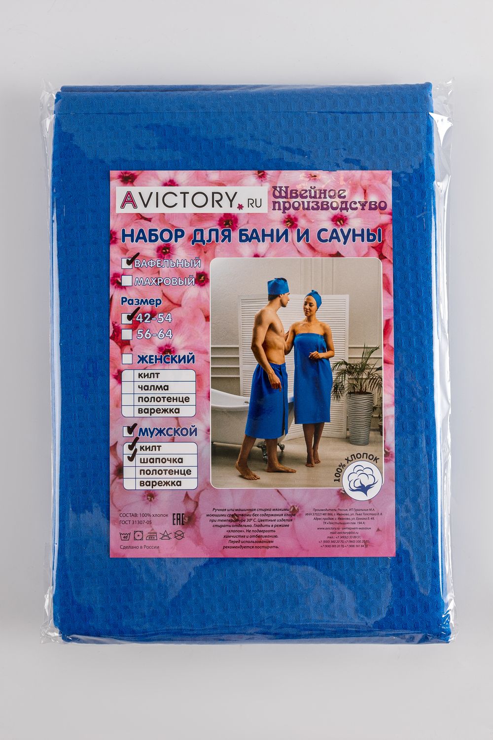 Ну кто не любит попариться в настоящей бане, или насладиться отдыхом и спа-процедурами? Если вы частый посетитель саун и бань, то вам непременно необходим этот великолепный килт банный мужской. Этот набор банный заменит все для бани и сауны, при этом в комплект входит стильная чалма в подарок. Этот килт и тюрбан будут служить как халат и банная одежда для мужчин, для детей и для мальчиков, как полотенце банное на резинке и даже как парео для пляжа. Текстиль банный вафельный - это чистый хлопок, вафельное полотно высокой плотности 240 г/м2 прекрасно впитывает влагу. Поэтому вафельные килты на резинке намного лучше впитывают влагу, чем махровый халат или полотенце и при этом он намного компактнее и занимает немного места. Килт вафельный размером 75х150 см идеально и надежно держится на поясе. Комфортные и удобные накидка и шапочка станут вашим незаменимым спутником в бане, сауне, спа-салоне и просто в душевой спортивного клуба.