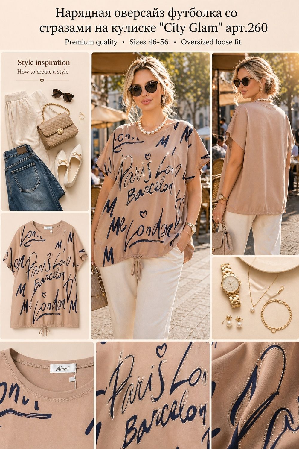 Нарядная оверсайз футболка со стразами на кулиске "City Glam" арт.260 — это идеальное сочетание городского стиля и вечернего гламура. Модель создана для современных женщин, которые ценят комфорт, и не готовы жертвовать яркостью образа.