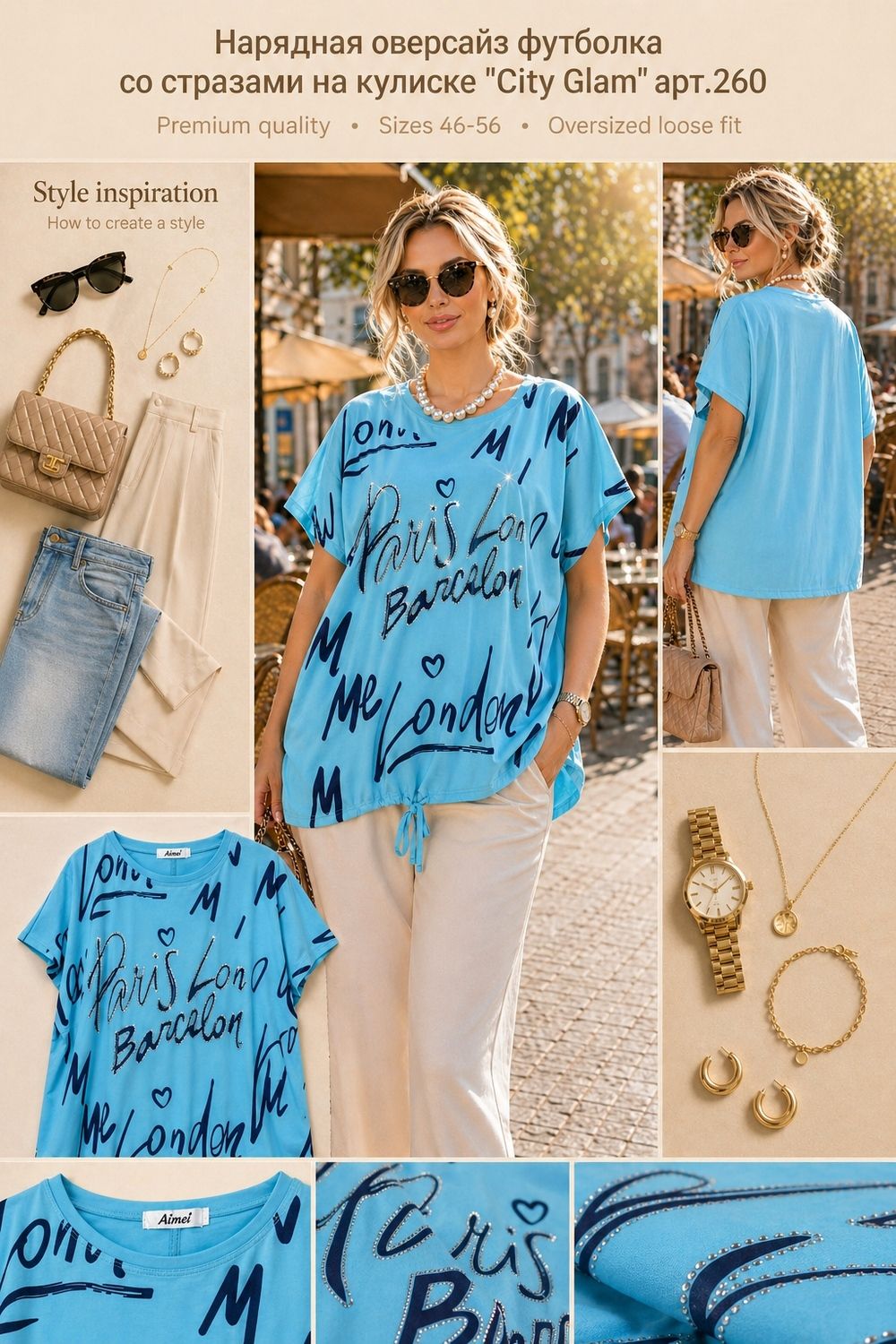 Нарядная оверсайз футболка со стразами на кулиске "City Glam" арт.260 — это идеальное сочетание городского стиля и вечернего гламура. Модель создана для современных женщин, которые ценят комфорт, и не готовы жертвовать яркостью образа.