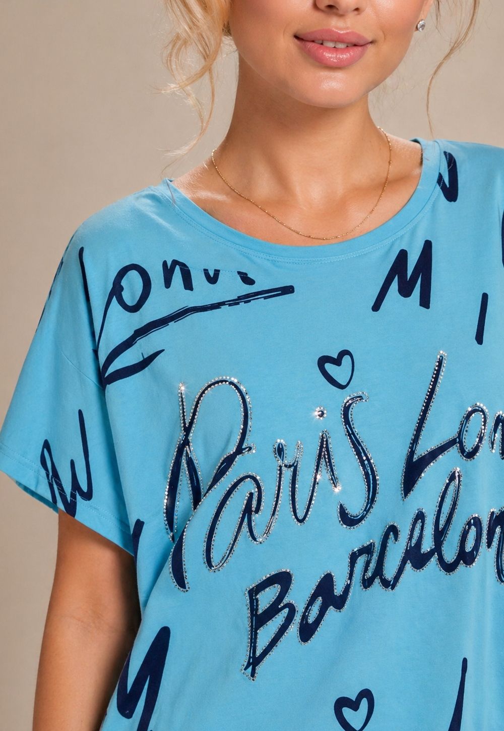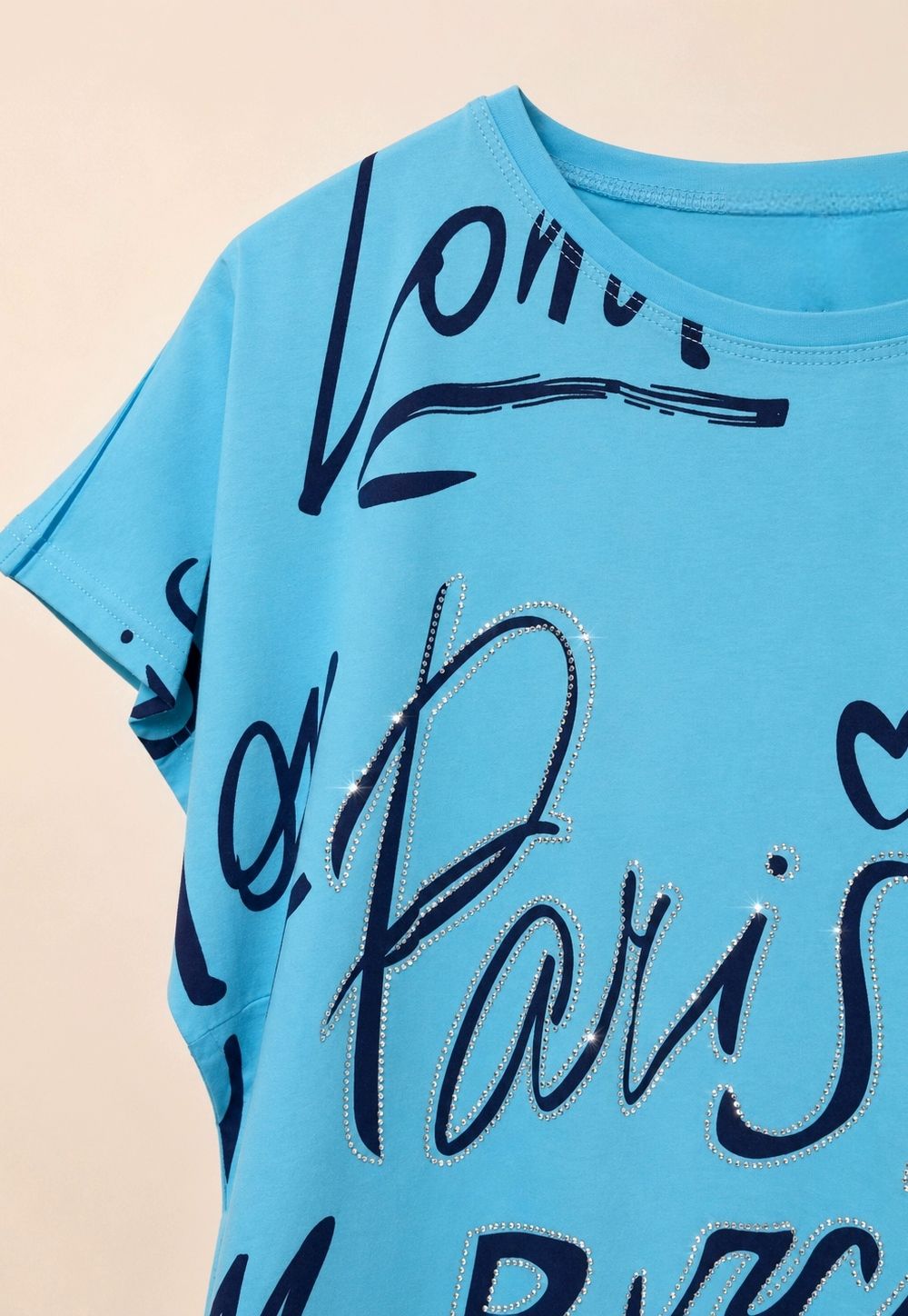 Роскошный дизайн и принт: Лицевая сторона украшена стильным принтом с названиями городов (Париж, Барселона, Лондон). Ключевая деталь — буквы выложены качественными стразами. Они не просто напечатаны, а надежно закреплены: стразы останутся на месте, не отклеятся после стирки и будут радовать вас долгое время. На солнце или при свете софитов композиция особенно красиво переливается, создавая эффект «бриллиантового» сияния.