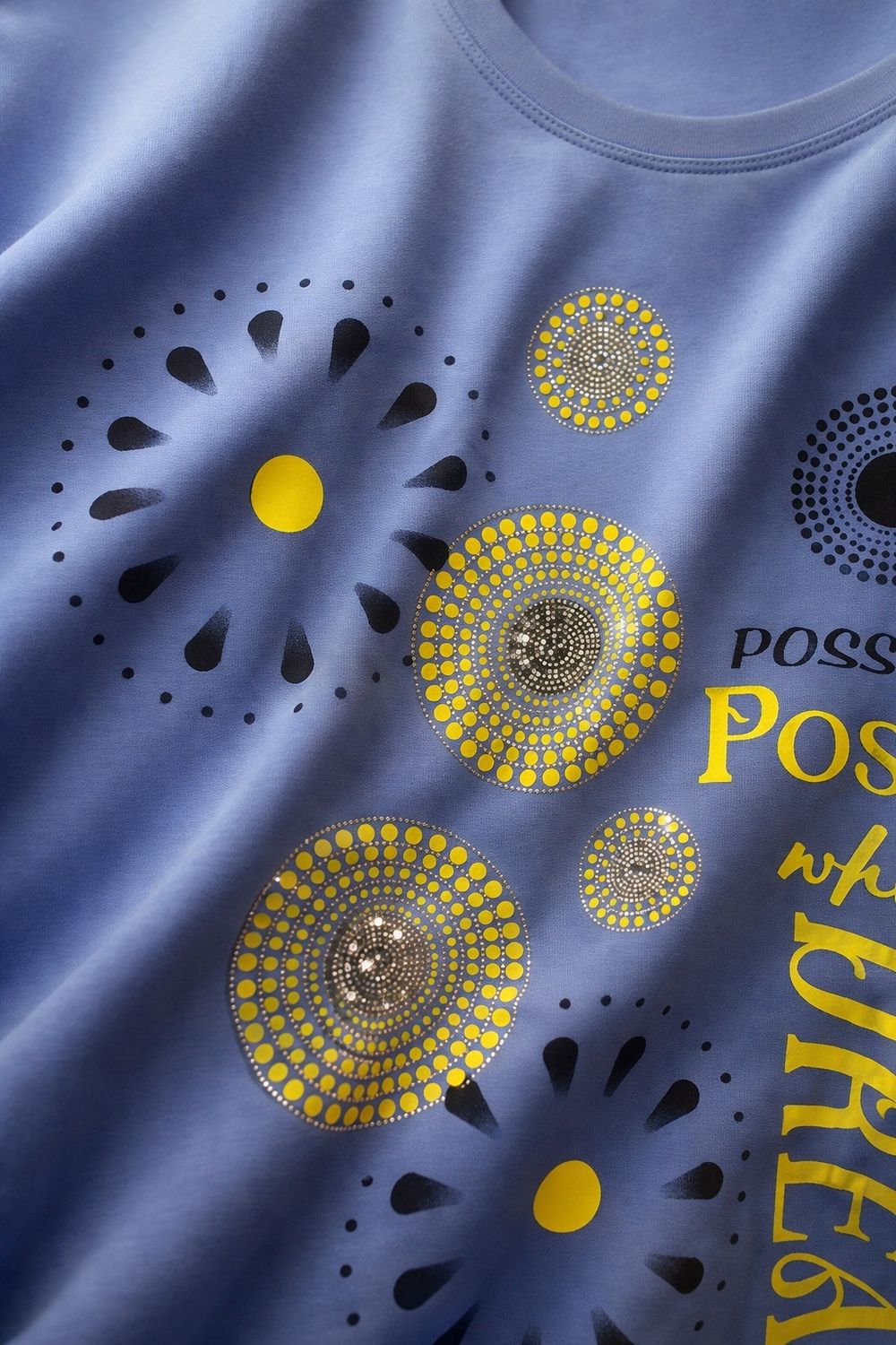 Сияющее впечатление — эффект «солнечного блеска»: по передней части расположены композиции из страз в виде абстрактных цветов и кругов. Стразы переливаются в свете — особенно красиво на солнце, создавая ощущение легкости, радости и внутреннего сияния. Это не просто декор — это энергия, которую вы несёте с собой.
