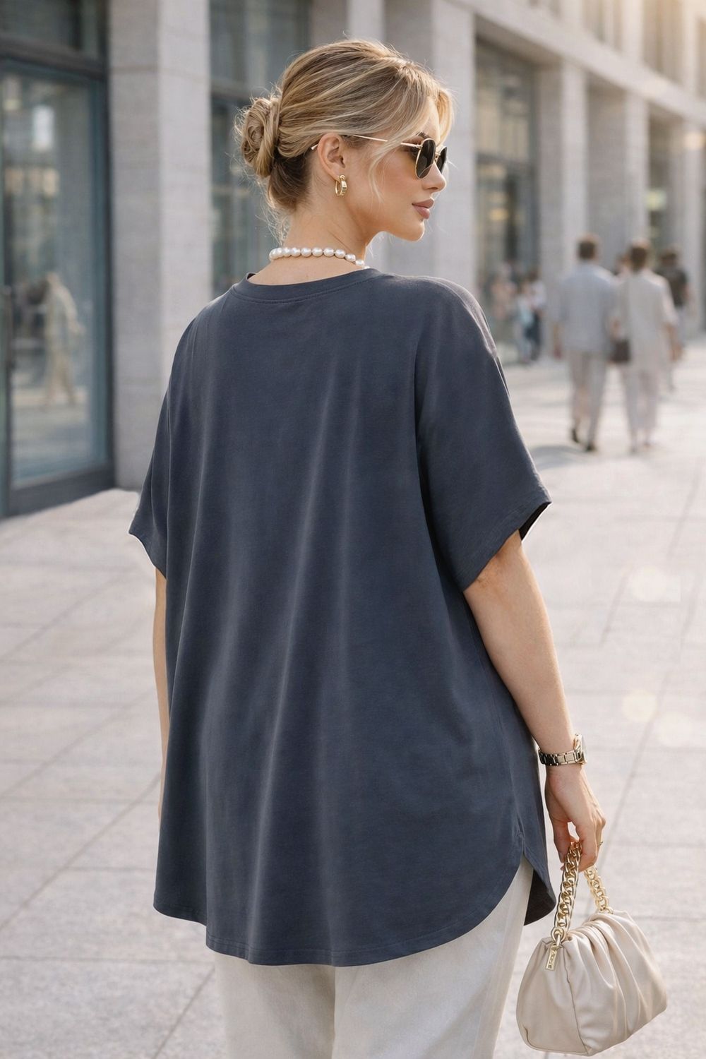 Крой — оверсайз с опущенной линией плеча, что придаёт модели современный, расслабленный силуэт и визуально удлиняет корпус. Такой крой особенно комфортен в повседневной носке и подходит для фигур размеров 58–68 — универсальный размер, который работает благодаря свободному крою и эластичности ткани.