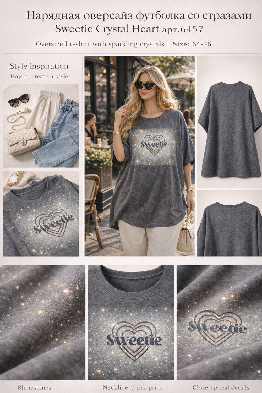 Нарядная оверсайз футболка со стразами Sweetie Crystal Heart арт.6457 — Главный Must-Have Сезона (Размеры 64–76). Эта футболка — не просто базовая вещь, это настоящий манифест современной моды для пышных форм. Если вы хотите выглядеть стильно, дорого и следовать последним веяниям фешн-индустрии, модель Crystal Flow Luxe создана специально для вас.