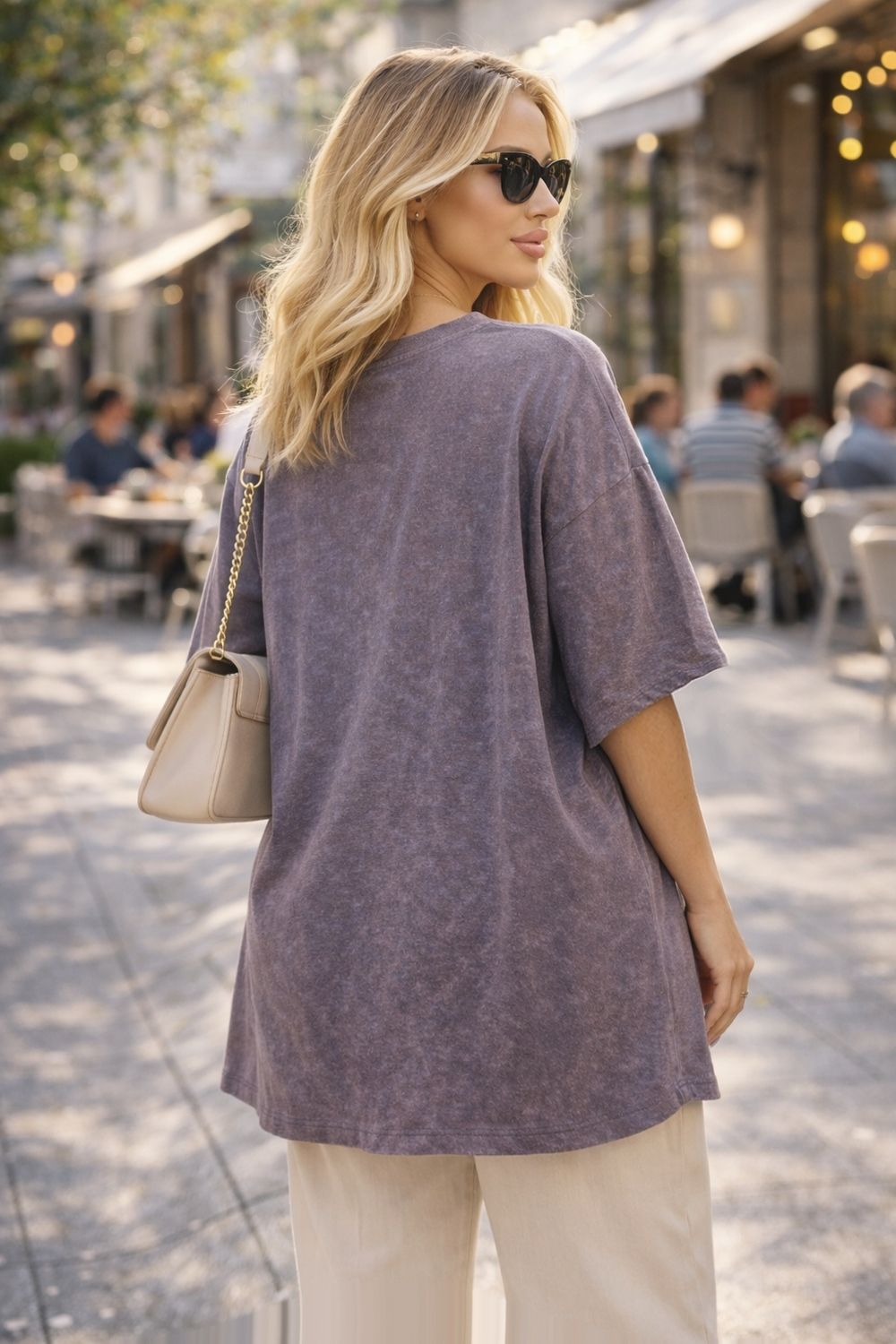 ✨ Тренд, который нельзя пропустить: Эффект «Варенки» и Винтажный Шик Забудьте о скучных однотонных тканях! В этом сезоне бал правит сложная обработка материала. Наша футболка выполнена в технике acid-wash (вареный хлопок), которая придает изделию невероятную визуальную глубину и текстуру.