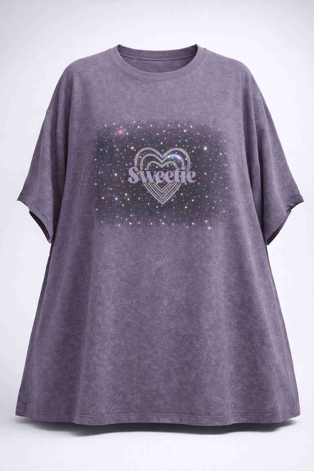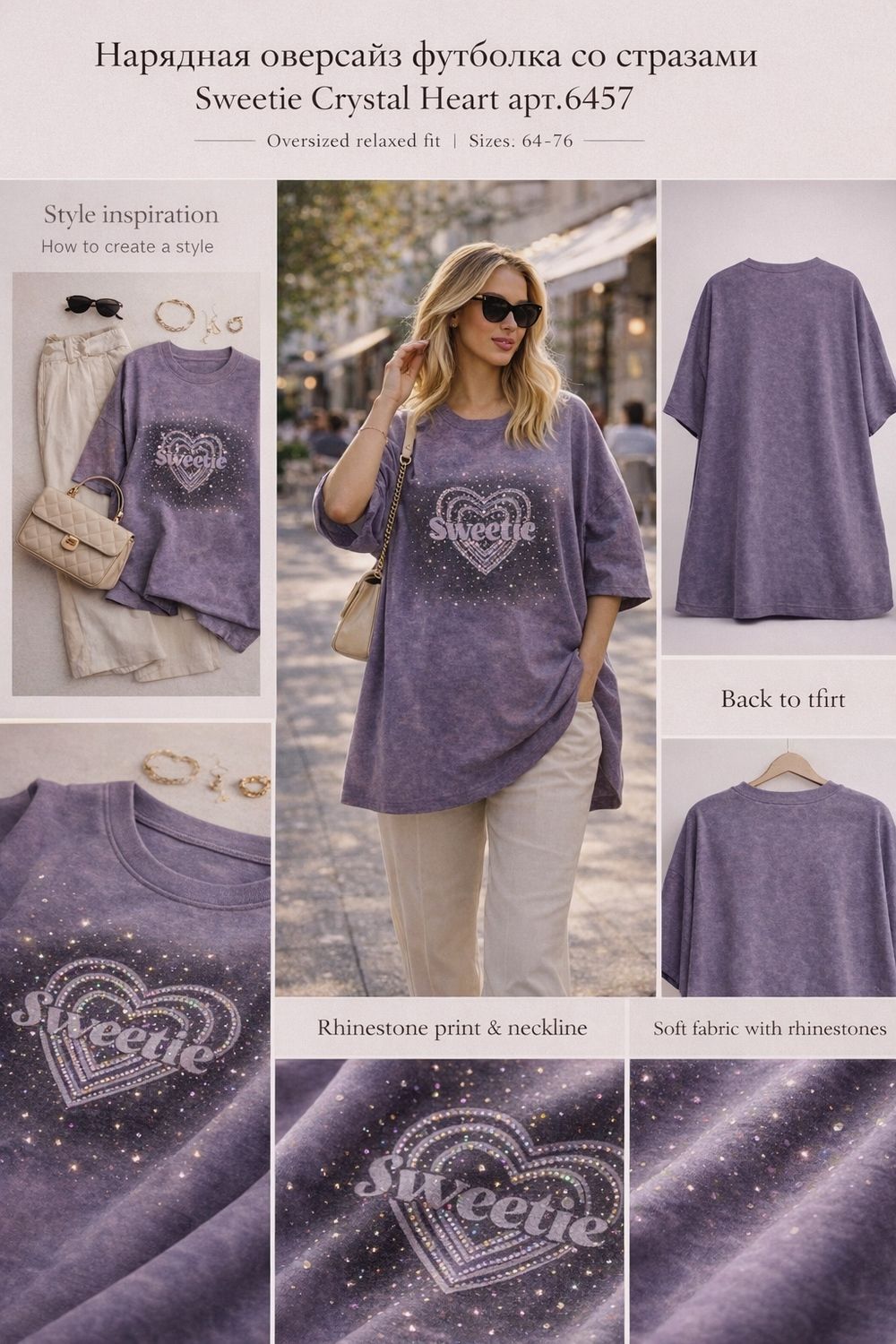 Нарядная оверсайз футболка со стразами Sweetie Crystal Heart арт.6457 — Главный Must-Have Сезона (Размеры 64–76). Эта футболка — не просто базовая вещь, это настоящий манифест современной моды для пышных форм. Если вы хотите выглядеть стильно, дорого и следовать последним веяниям фешн-индустрии, модель Crystal Flow Luxe создана специально для вас.