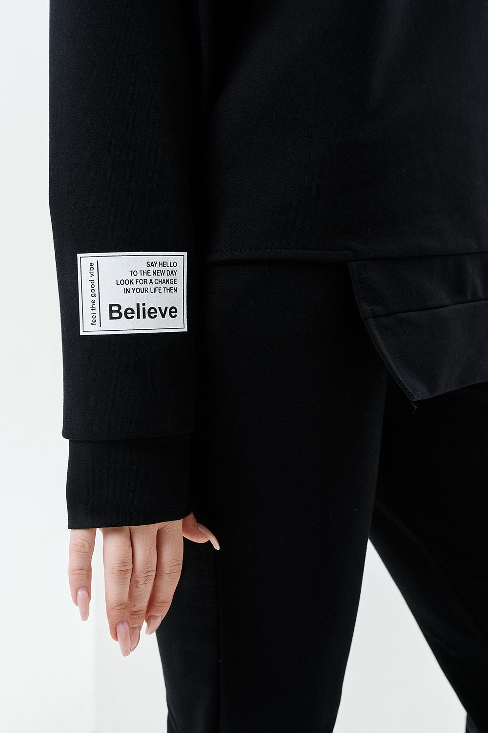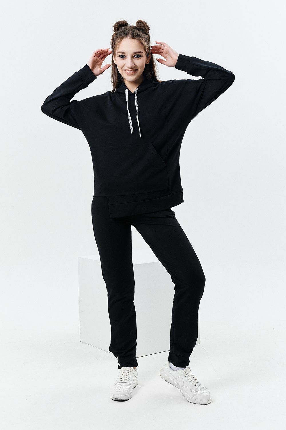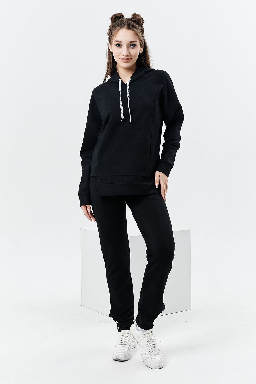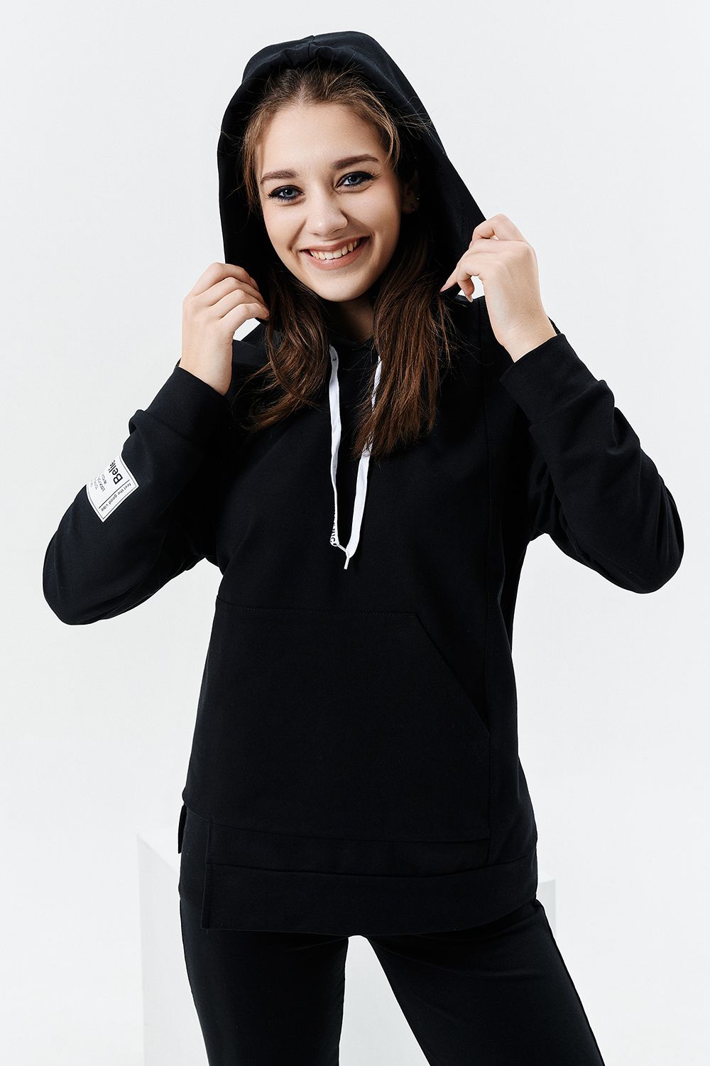 Толстовка прямая, свободная, с капюшоном, с фигурной линией низа на полочке. Рукав длинный, на манжете. На полочке расположен асимметричный карман "кенгуру".