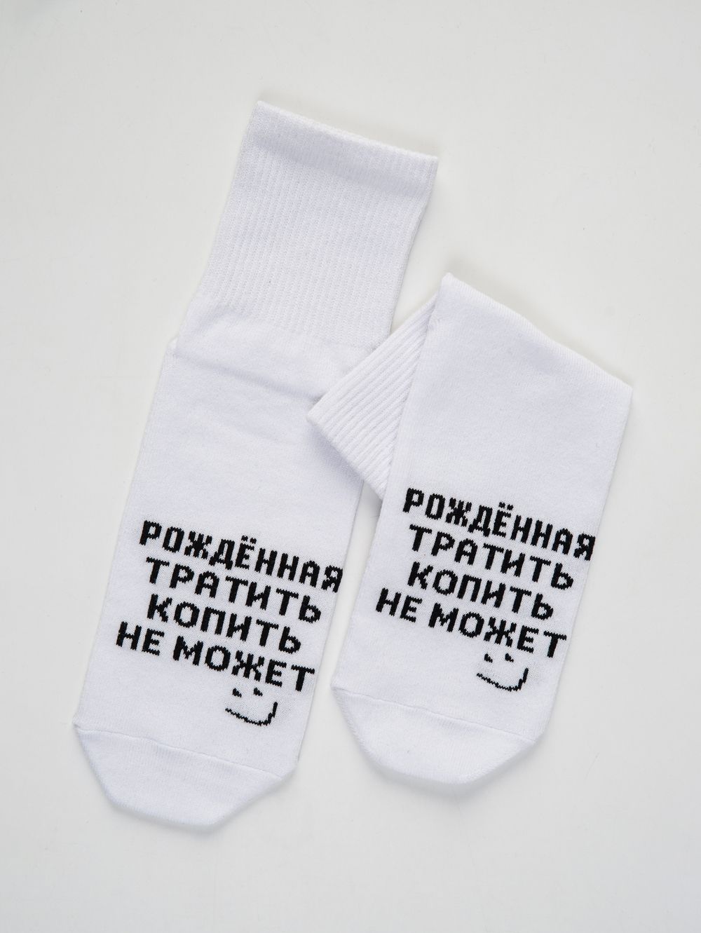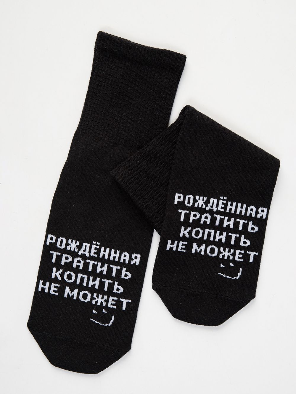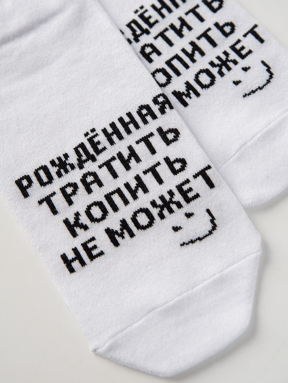 Выбери носки для тех, кто знает: жизнь одна, а удовольствие — в каждой покупке! Яркий принт “Рождённая тратить, копить не может” поднимет настроение тебе и всем вокруг. Мягкий хлопок, отличная посадка, долговечность и нескучный дизайн — именно то, что нужно для максимального комфорта и самовыражения.