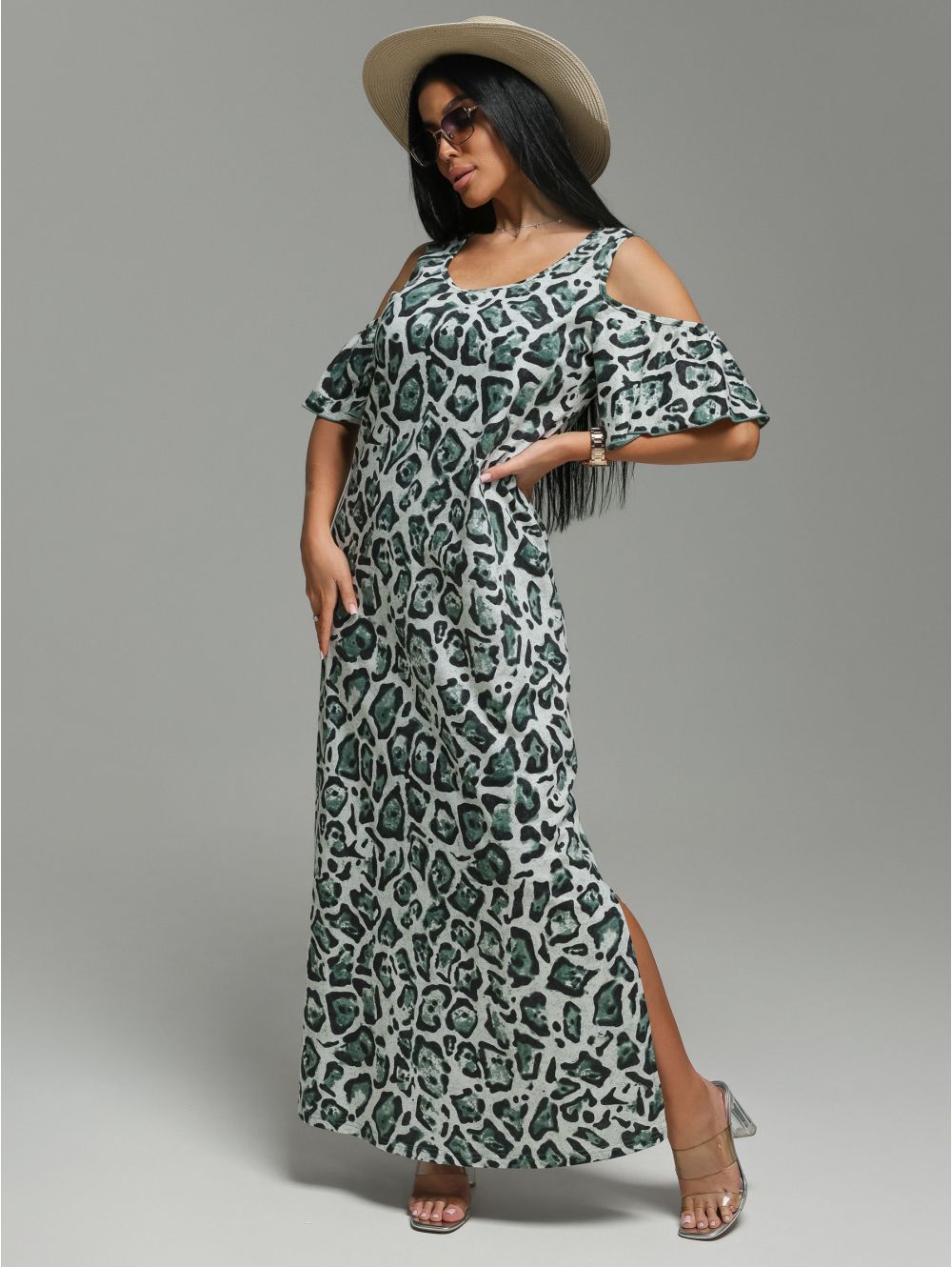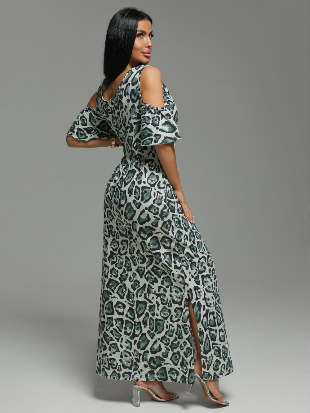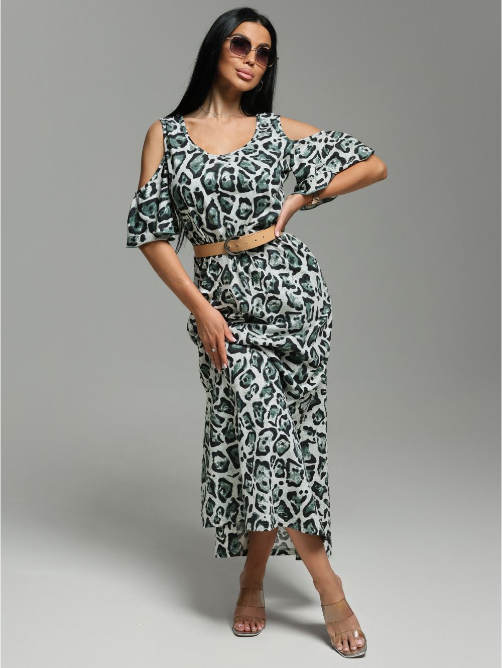 Длинное с разрезами по бокам платье в форме трапеции дополняет рукав-волан с открытым плечом.