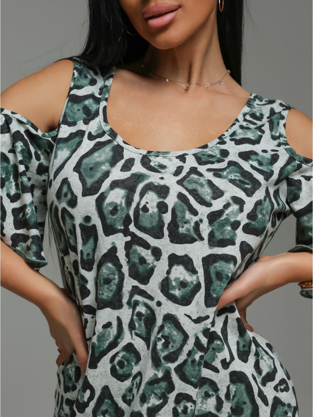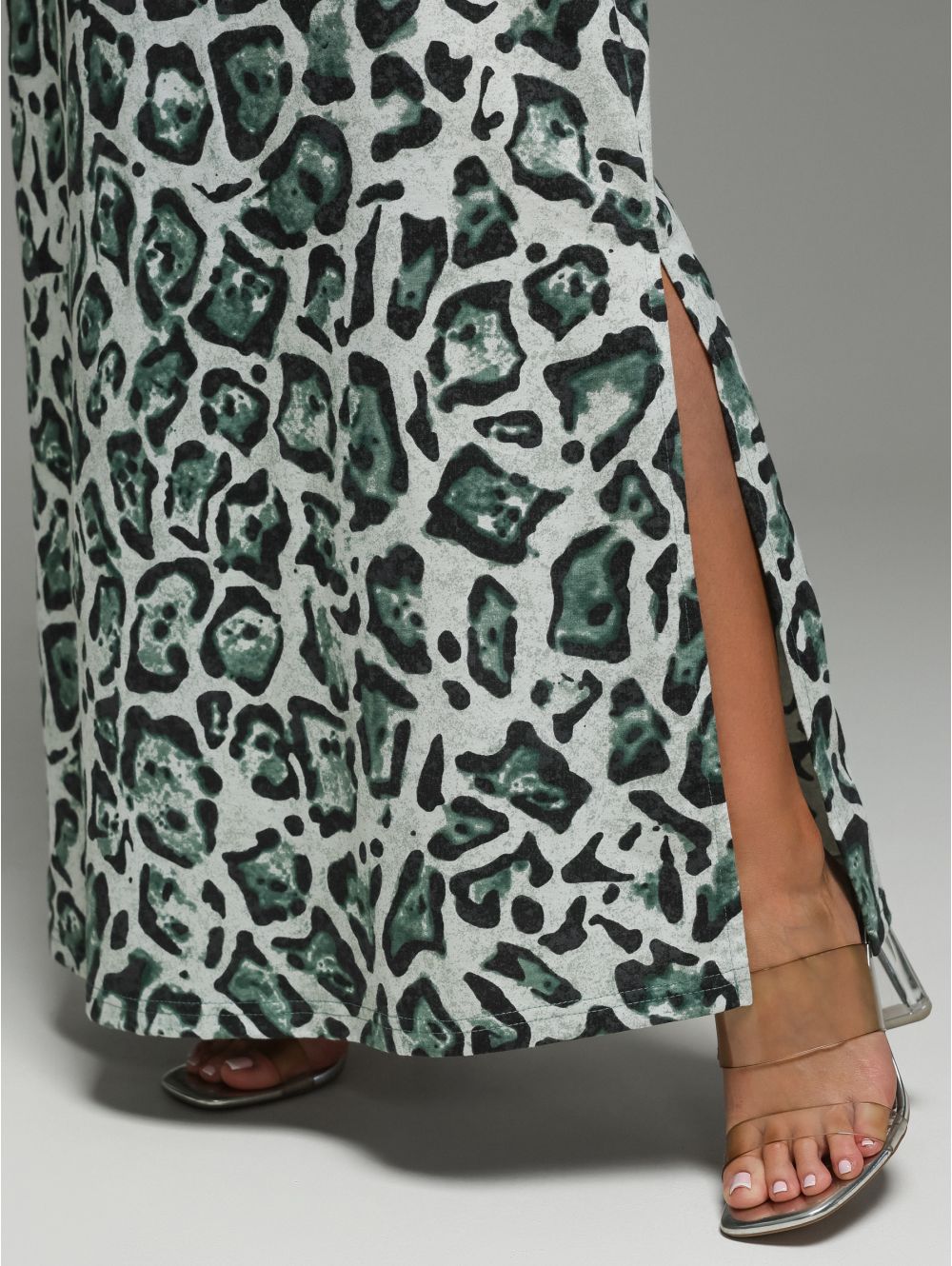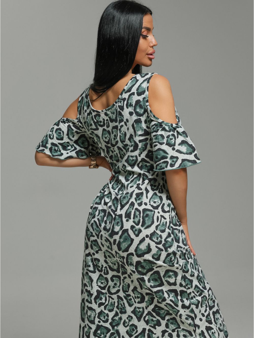 Длинное с разрезами по бокам платье в форме трапеции дополняет рукав-волан с открытым плечом.