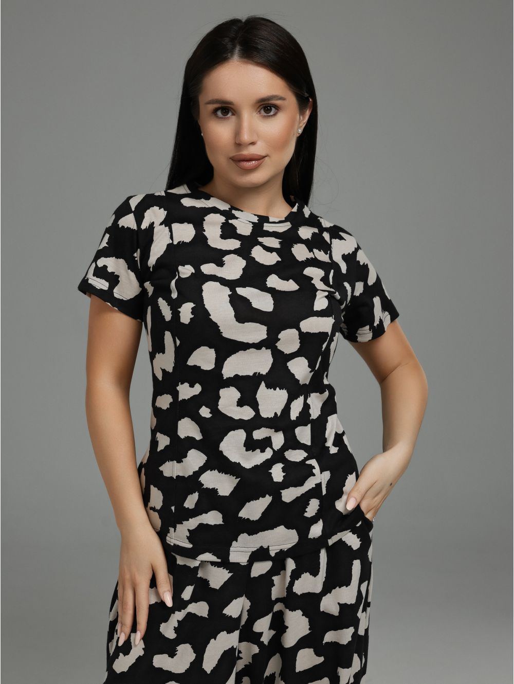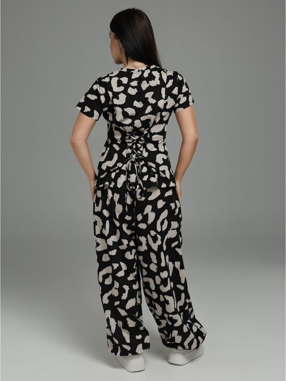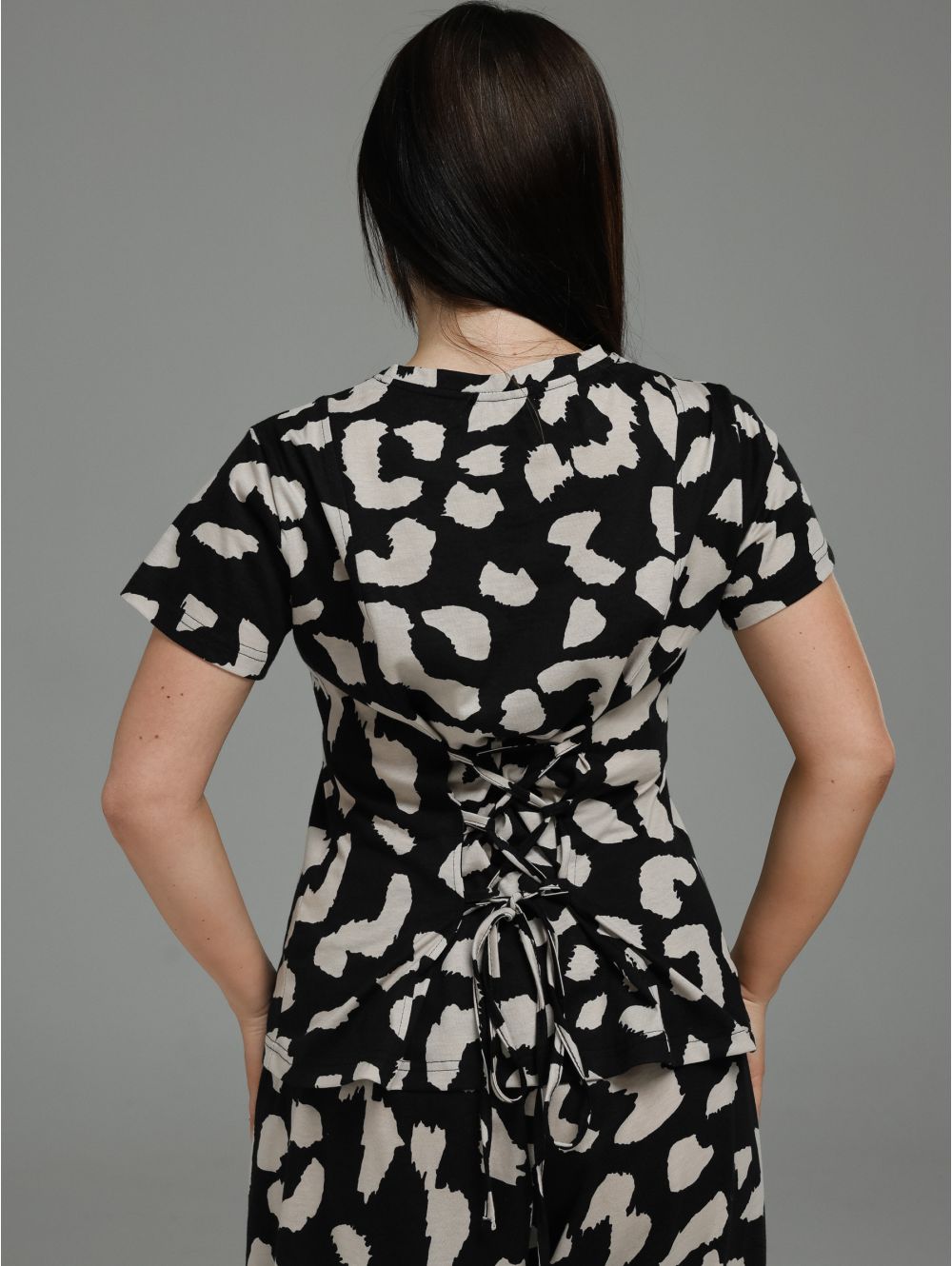 Женский костюм-двойка (футболка + брюки) с регулируемой деталью на спинке.