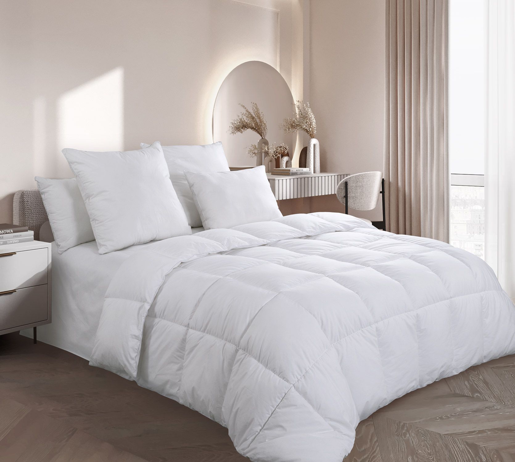 Наполнитель из искусственного лебяжьего пуха - За счёт своего инновационного состава он не накапливает запахов и не вызывает аллергии, поэтому его можно использовать как взрослым, так и детям. Он также обладает способностью сохранять объем и форму даже после многократной стирки.