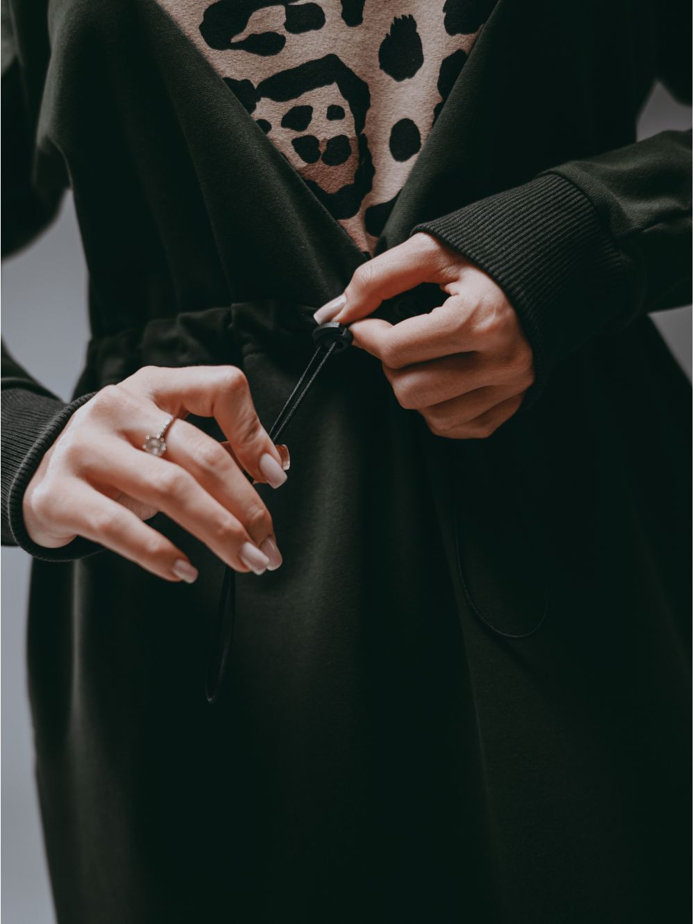 Силуэт, который вы создаете сами: Отрезной крой по талии с кулиской и шляпной резинкой внутри! Затяните шнур для выразительной талии или ослабьте для расслабленного прямого силуэта. Фиксаторы не дадут ему развязаться.