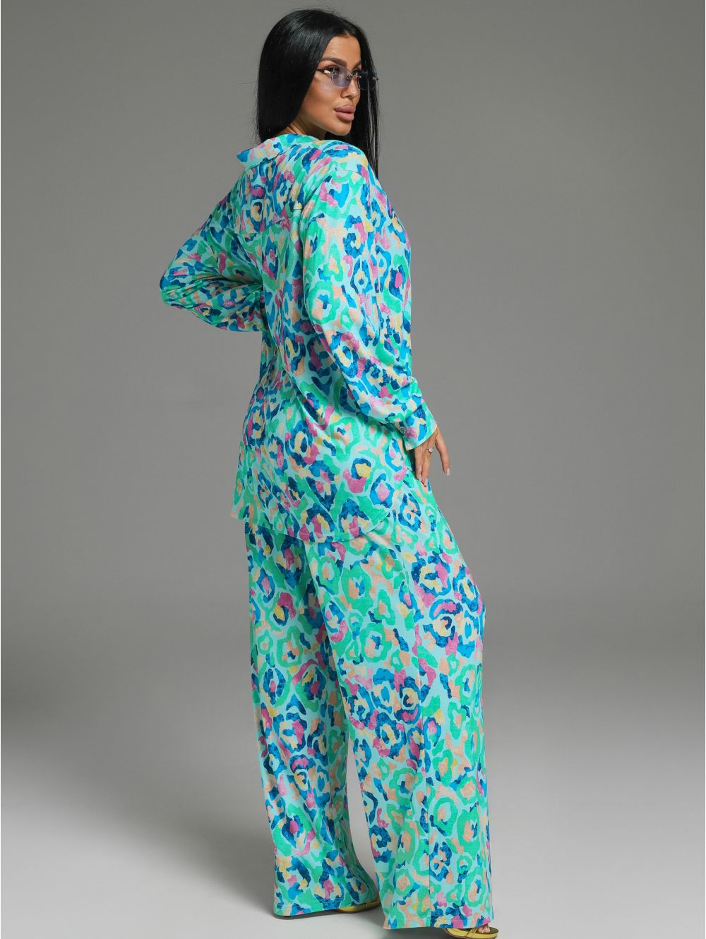 с длинным втачным рукавом с манжетой. Брюки прямые от бедра с отрезным поясом.