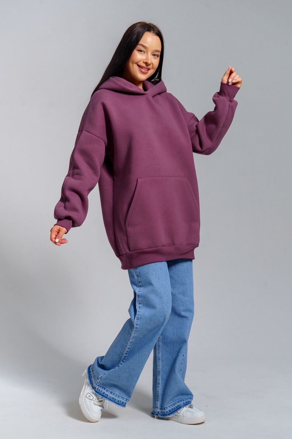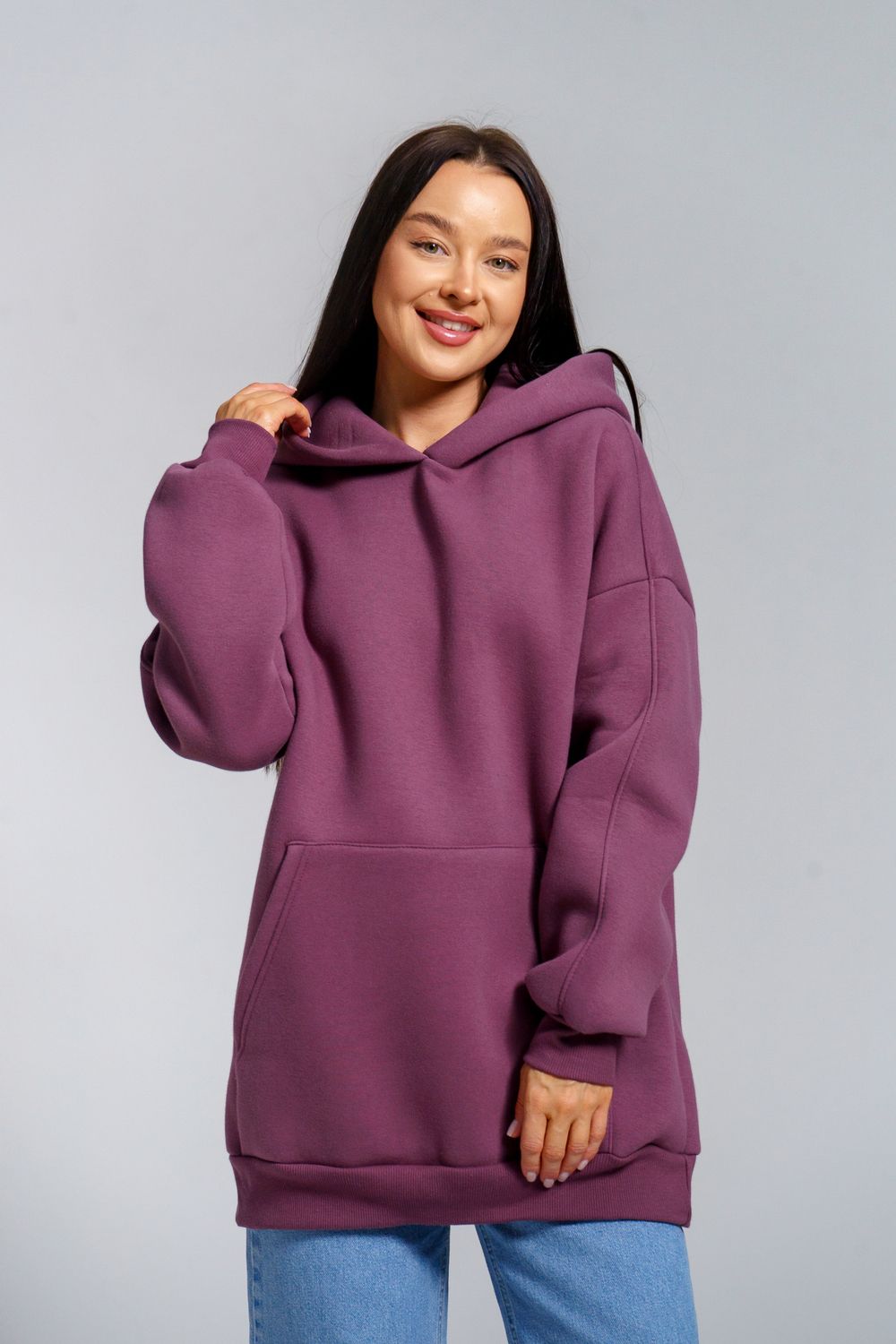 Толстовка из футера с начесом объемного покроя. Двойной капюшон, карман-кенгуру. Срезы обработаны кашкорсе в цвет основной ткани.