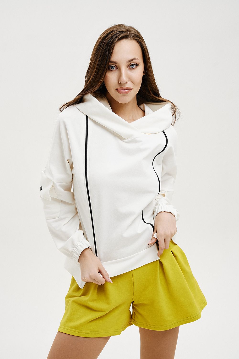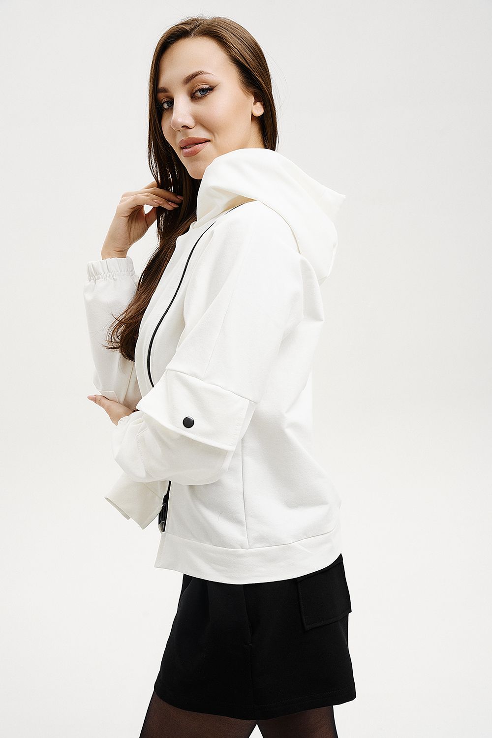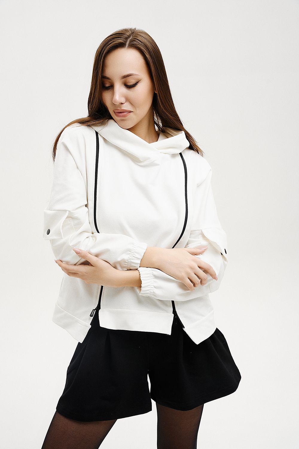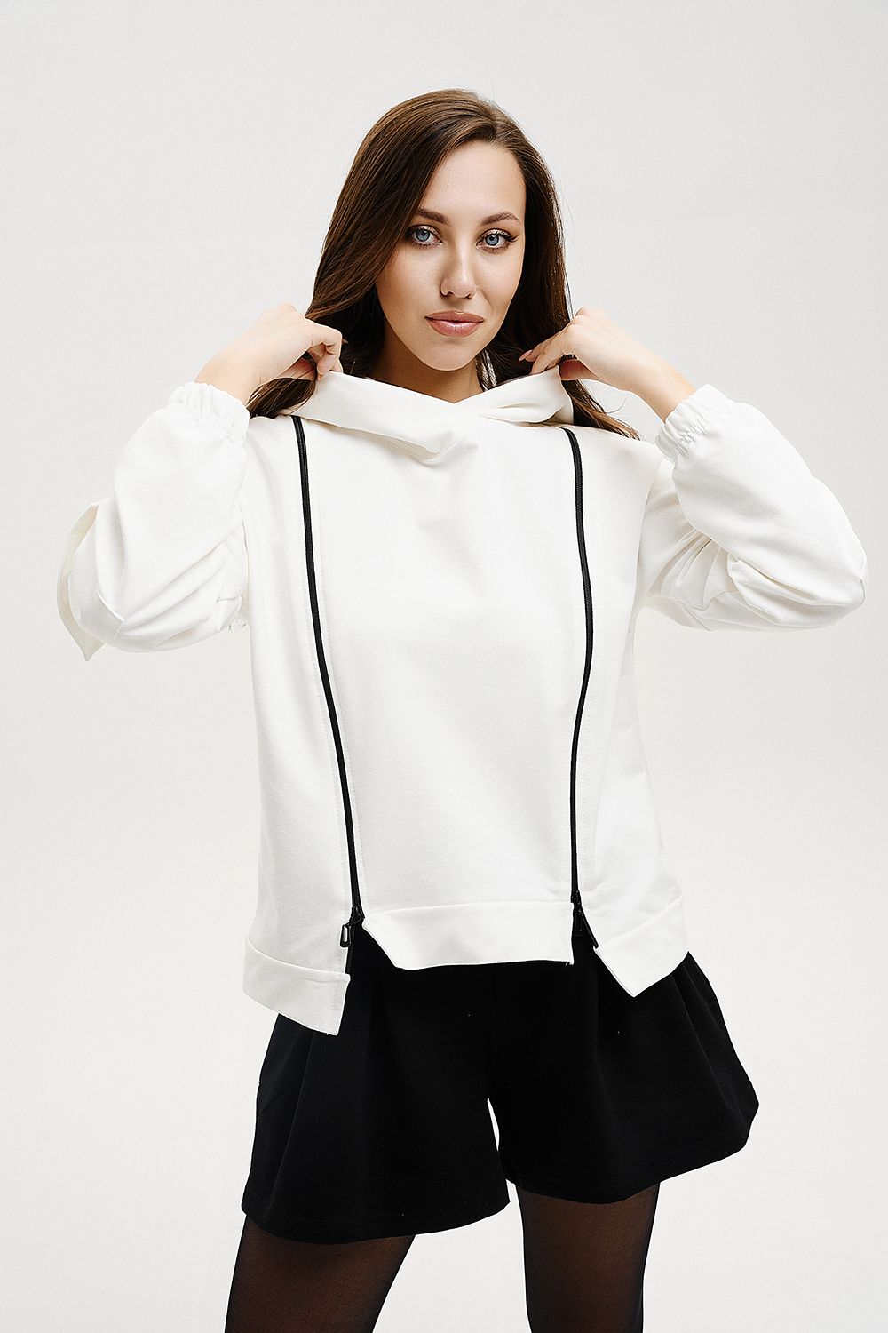 Женская толстовка с двумя молниями, капюшоном, карманами на рукавах. Свободного силуэта для тех, кто ценит комфорт.