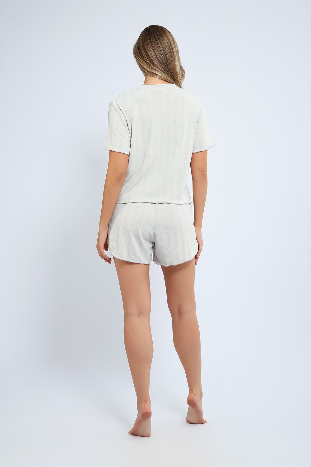 Пижама состоит из футболки и шорт. Футболка свободная, укороченная с короткими рукавами и удлиненной спинкой. Шорты свободные с запахом по бокам.