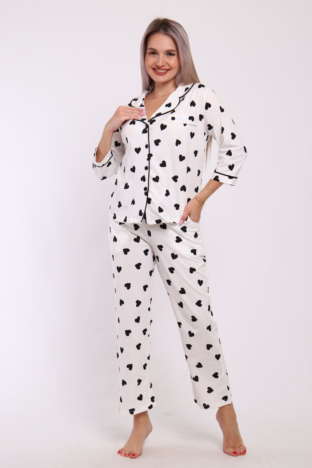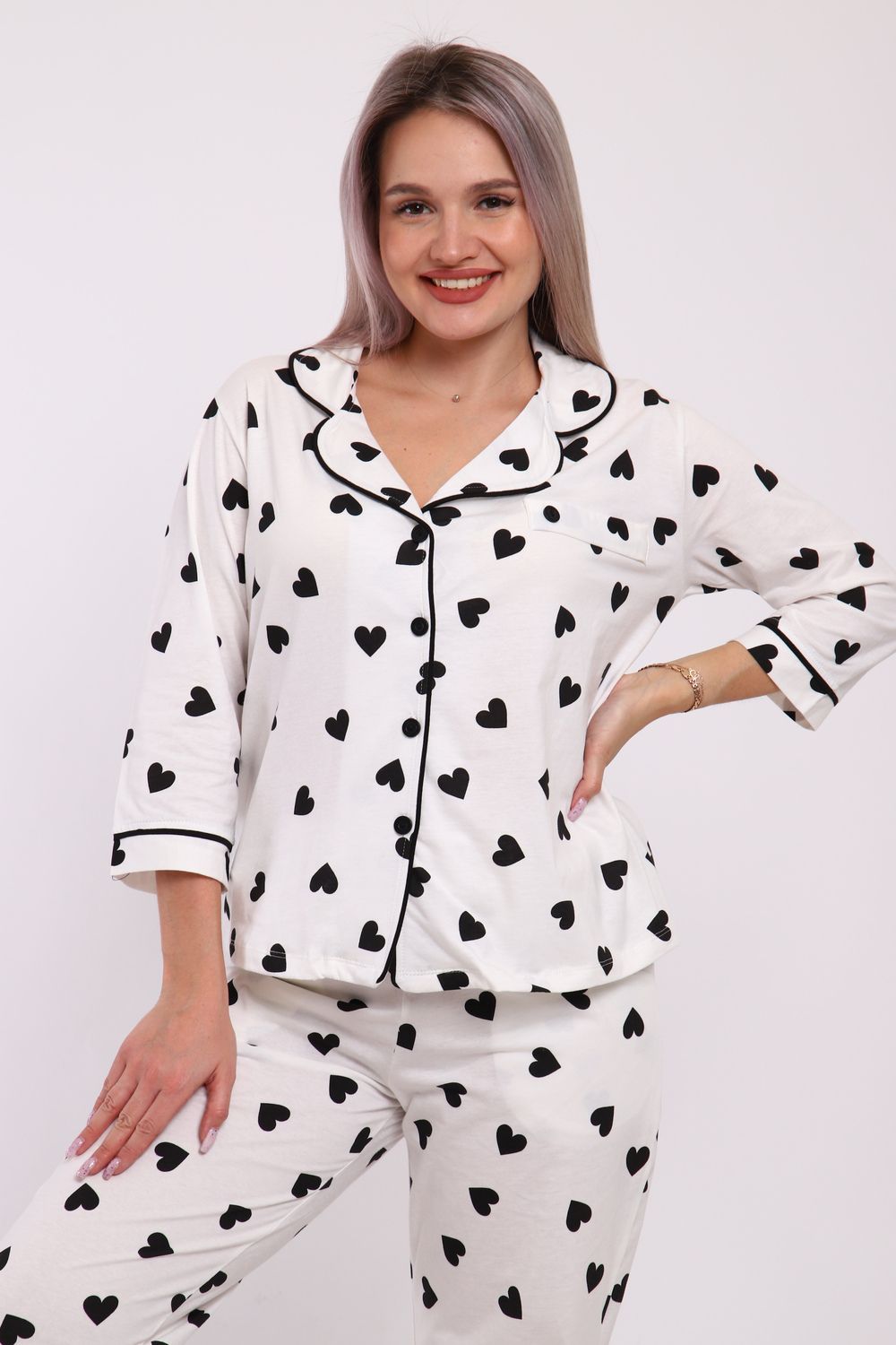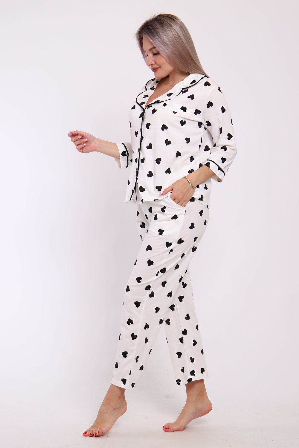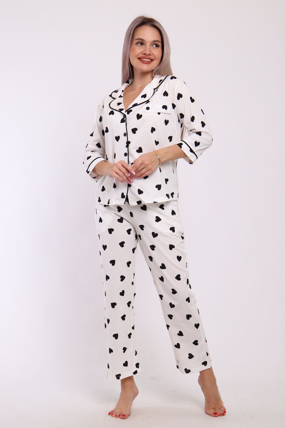 Пижама женская с брюками. Рубашка прямого, свободного кроя на пуговицах с имитацией кармана на груди. Воротник фигурный. Кроя полочки, рукав и воротник обработан внутренней окантовкой. Брюки с карманами, длина по щиколотку.