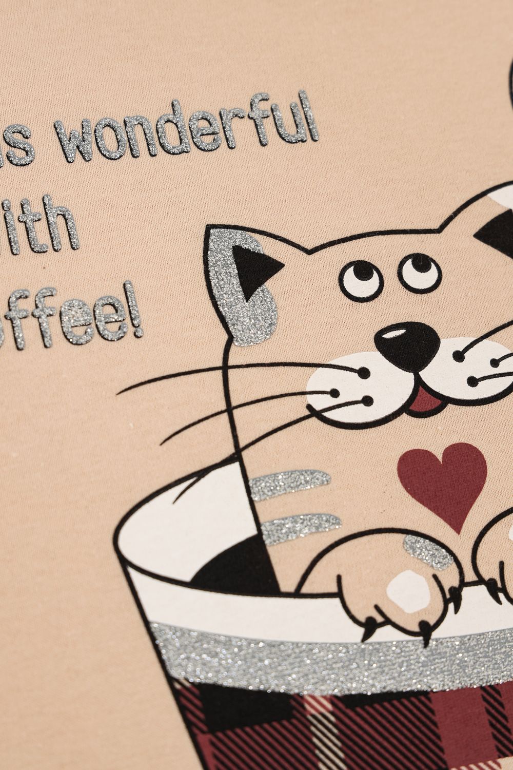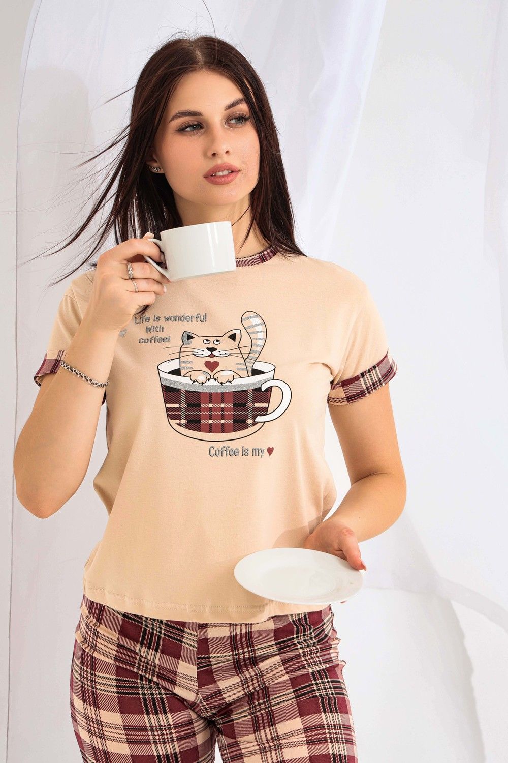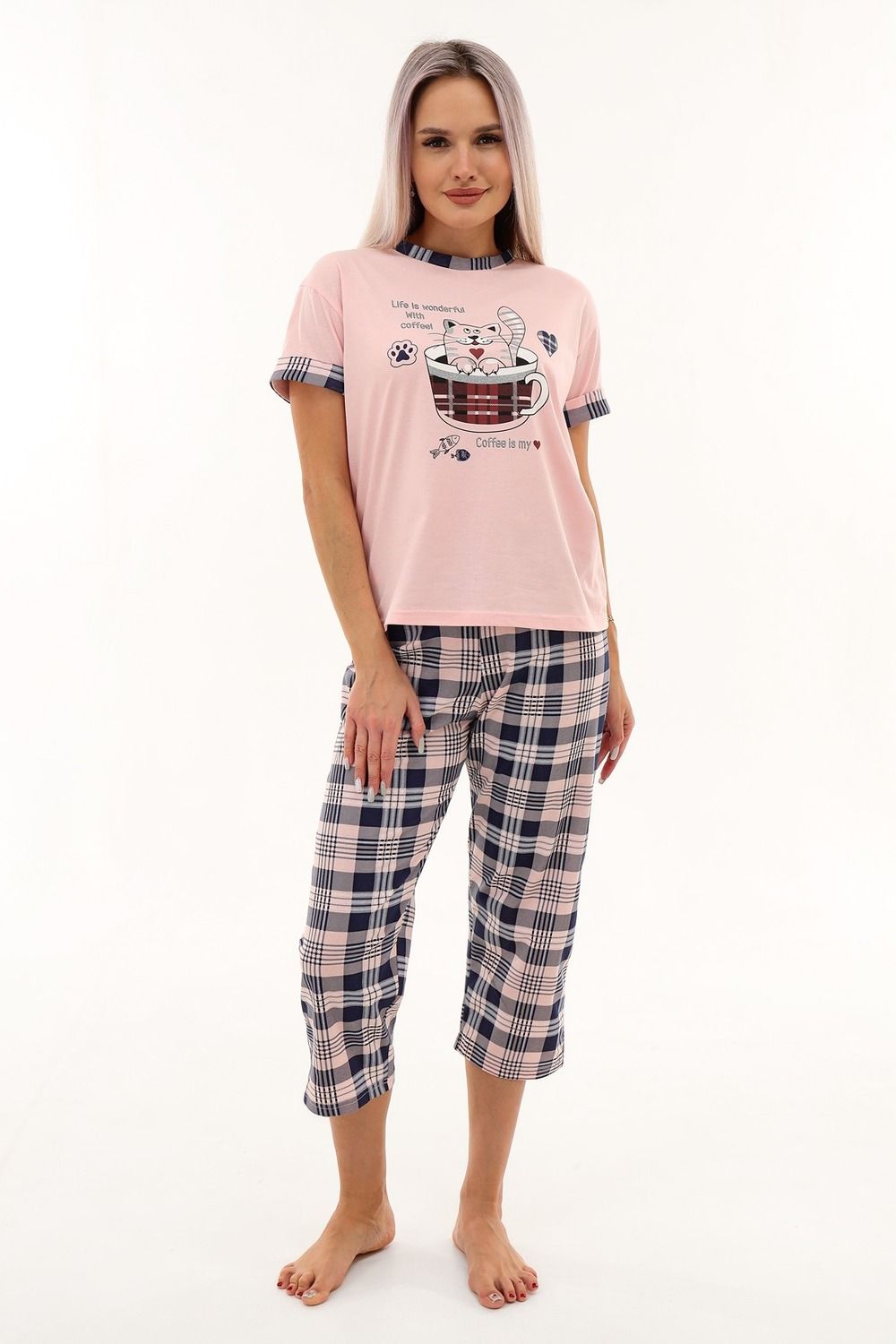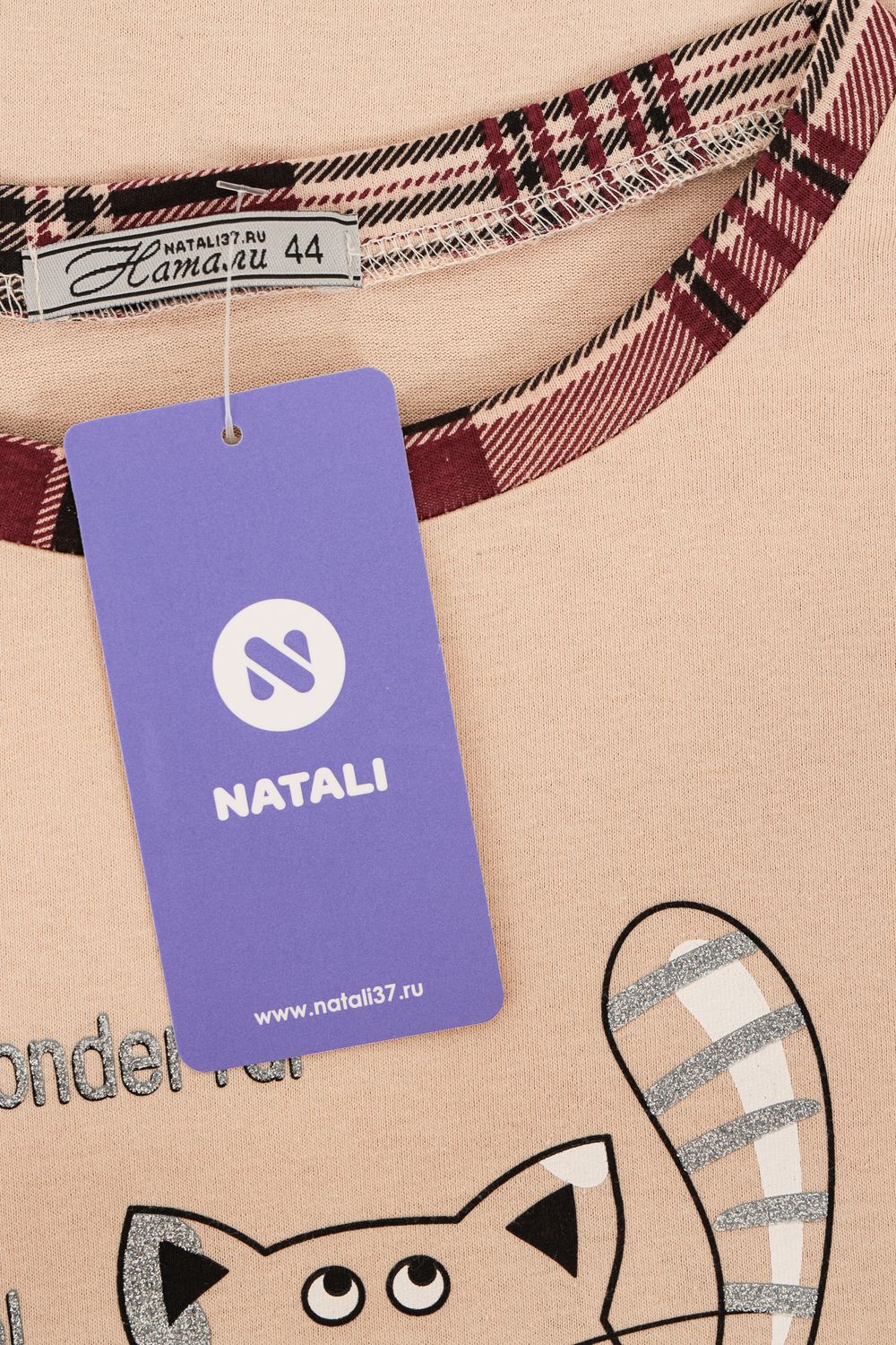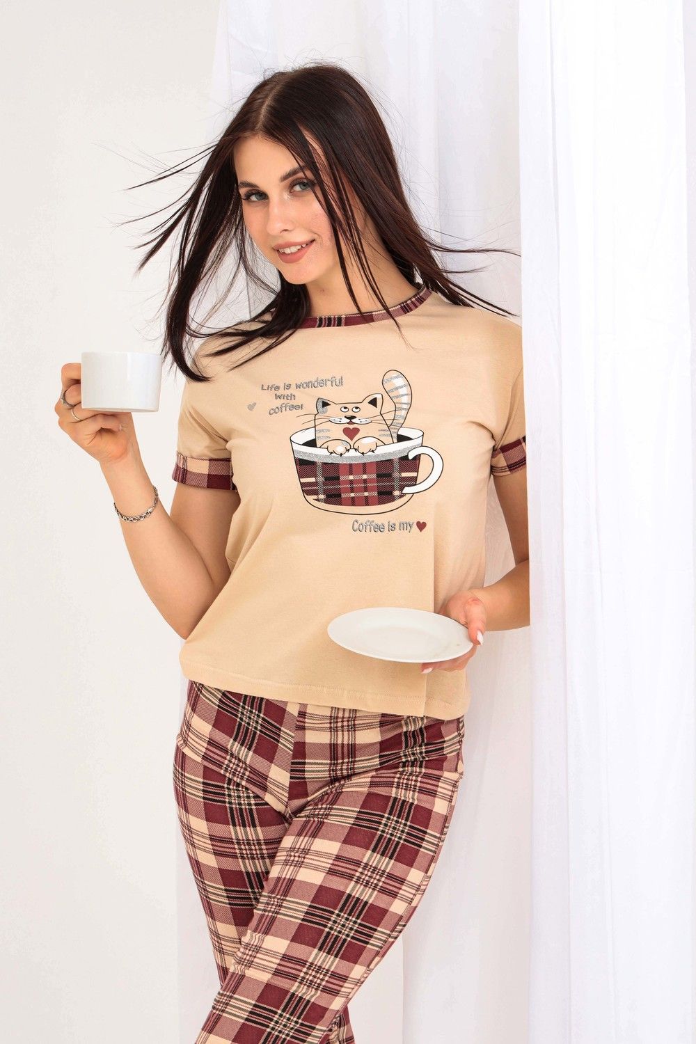 Уютная пижама с оригинальным принтом из очень мягкой, приятной к телу ткани. Футболка с спущенной линией плеча. Бриджи свободного кроя. В измерениях в обхвате талии указана длина резинки. Может использоваться как домашний костюм.