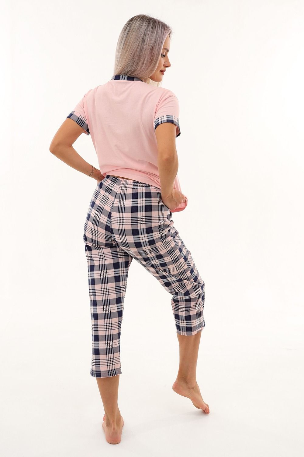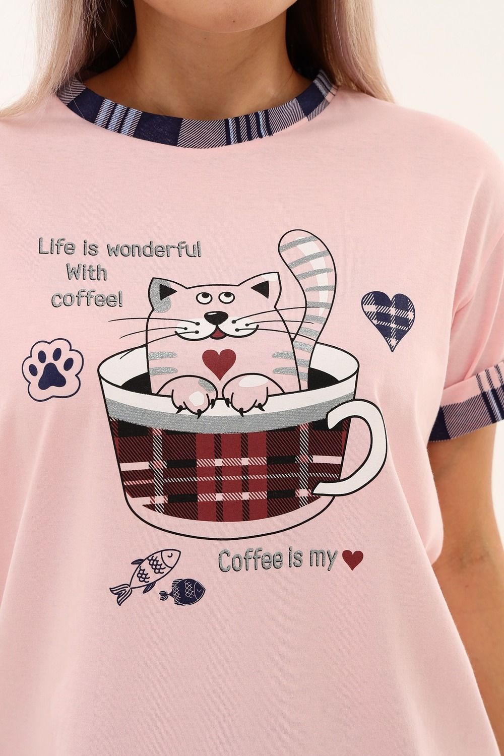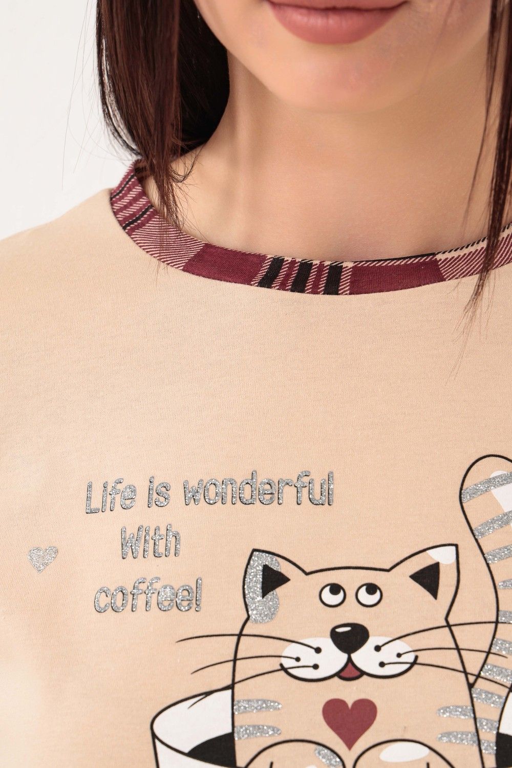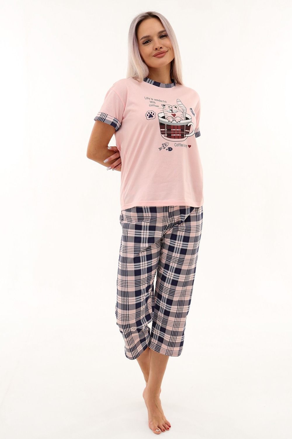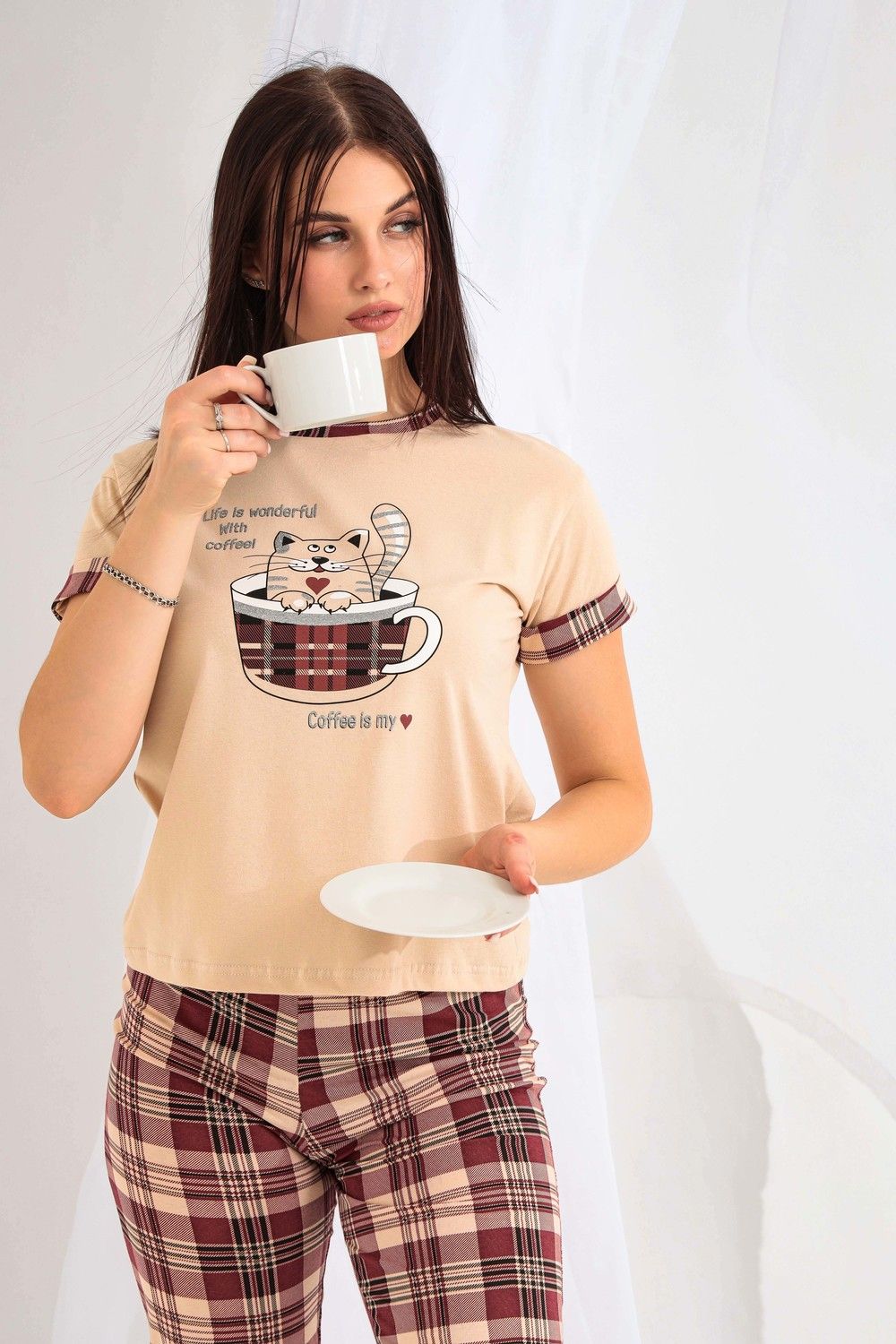Уютная пижама с оригинальным принтом из очень мягкой, приятной к телу ткани. Футболка с спущенной линией плеча. Бриджи свободного кроя. В измерениях в обхвате талии указана длина резинки. Может использоваться как домашний костюм.