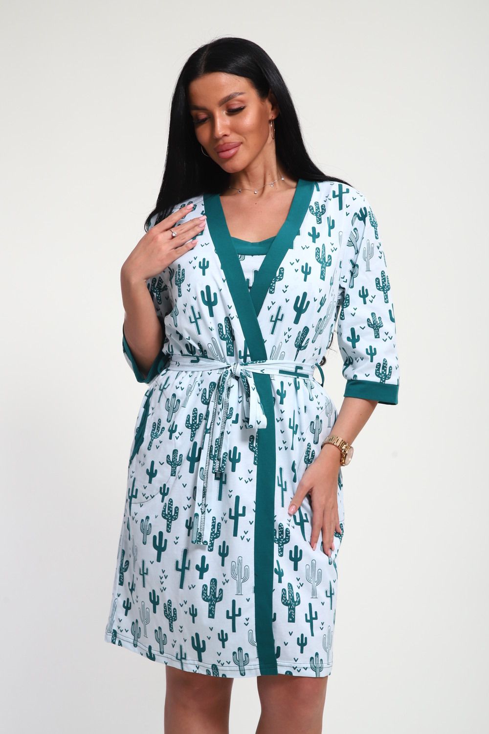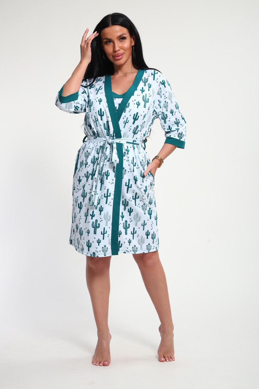 Пижамный костюм из кулирки халат + майка + шорты. Запашной халат с поясом, рукава чуть ниже локтей. Однотонная майка на узких лямках, цветочные вставки. Короткие шорты.