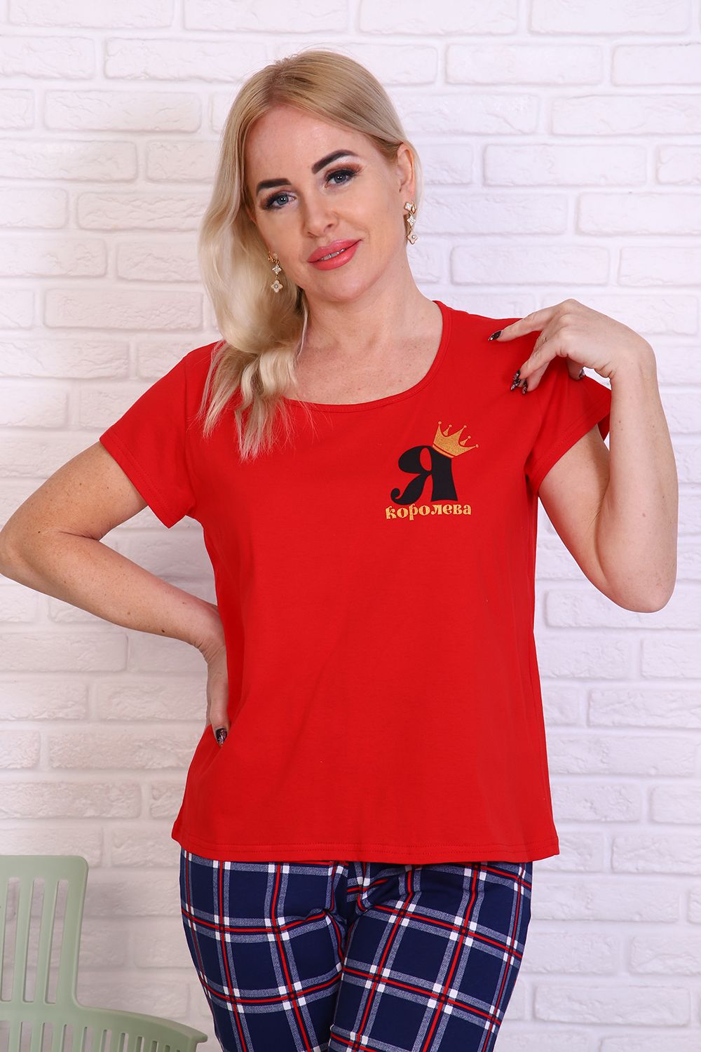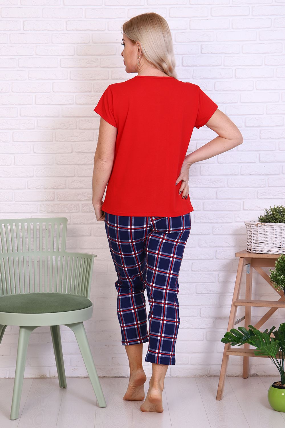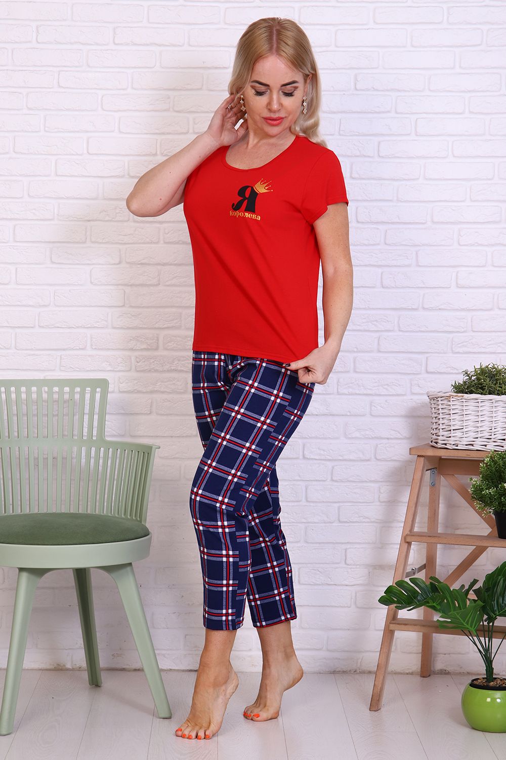 Женская пижама с укороченными брюками в клеточку. Футболка красного цвета с коротким рукавом, на полочке оригинальная печать в виде буквы с короной.