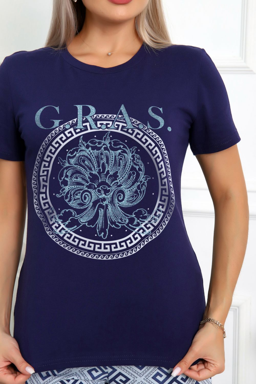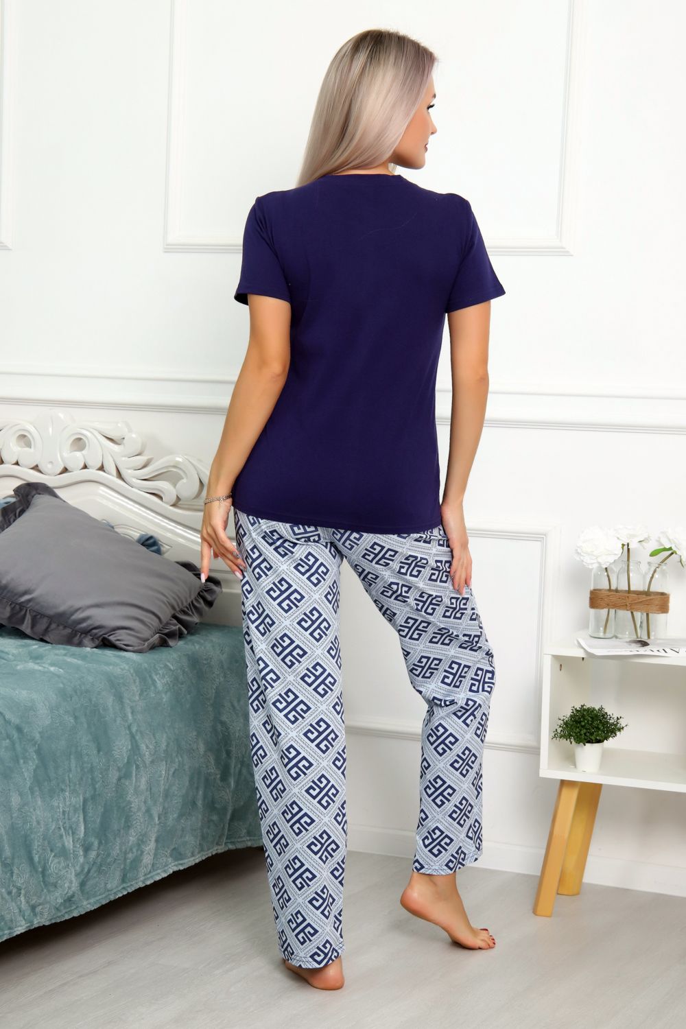 Женская домашняя пижама состоит из футболки и брюк. Футболка свободного кроя, длиной до линии бёдер, с опущенным плечом и коротким втачным рукавом. Горловину украшает обтачка. В центре переда расположен оригинальный принт. Брюки длинные и свободные, без карманов. Пояс на резинке.