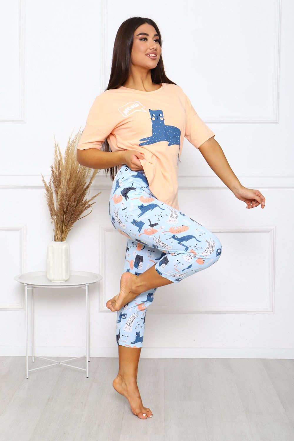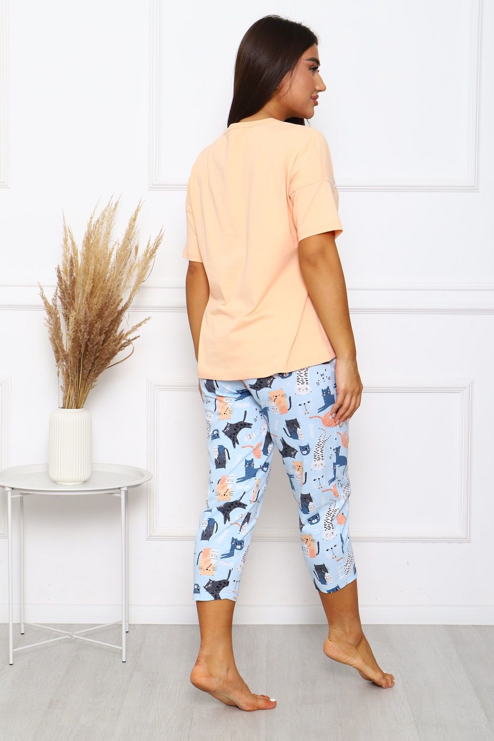 Пижама женская Коты, с брюками, в боках карманы, футболка с коротким рукавом, свободного кроя, с милым принтом на полочке.