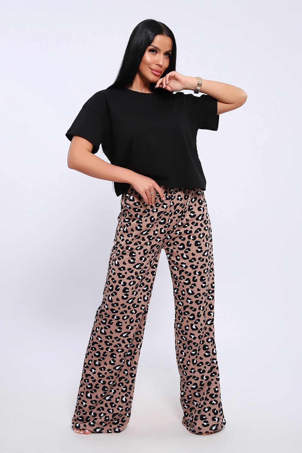 Домашняя женская пижама их мягкого хлопка. Свободная футболка прямого кроя, со смещенными плечевыми швами. Вырез горловины округлой формы с обтачкой. Длина футболки укорочена выше линии бедер, что является трендом сезона. Широкие брюки прямого кроя с высокой посадкой, с вместительными боковыми карманами, пояс на резинке с декоративной отстрочкой и атласным милым бантиком. Длина брюк стандартна, чуть ниже щиколотки.