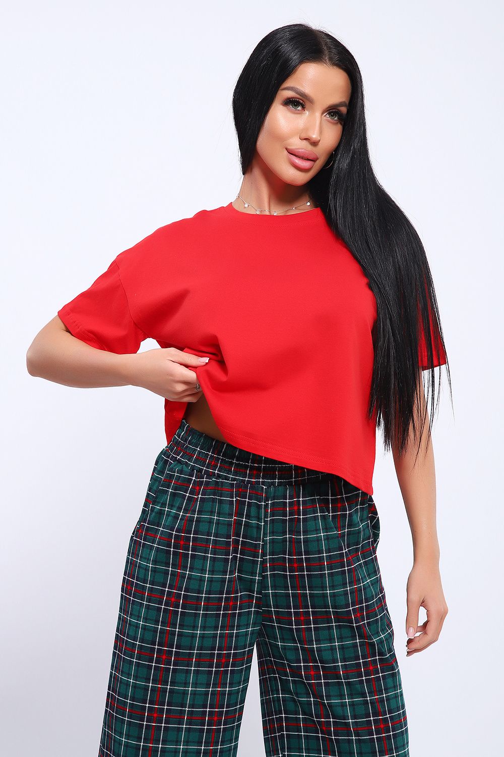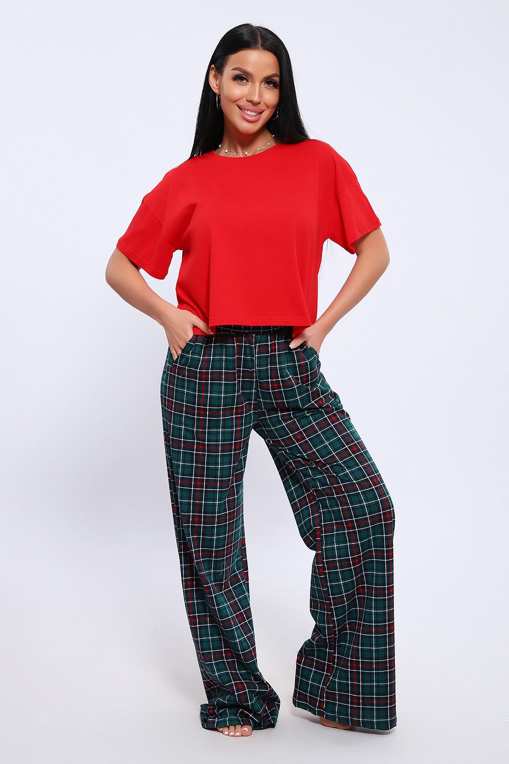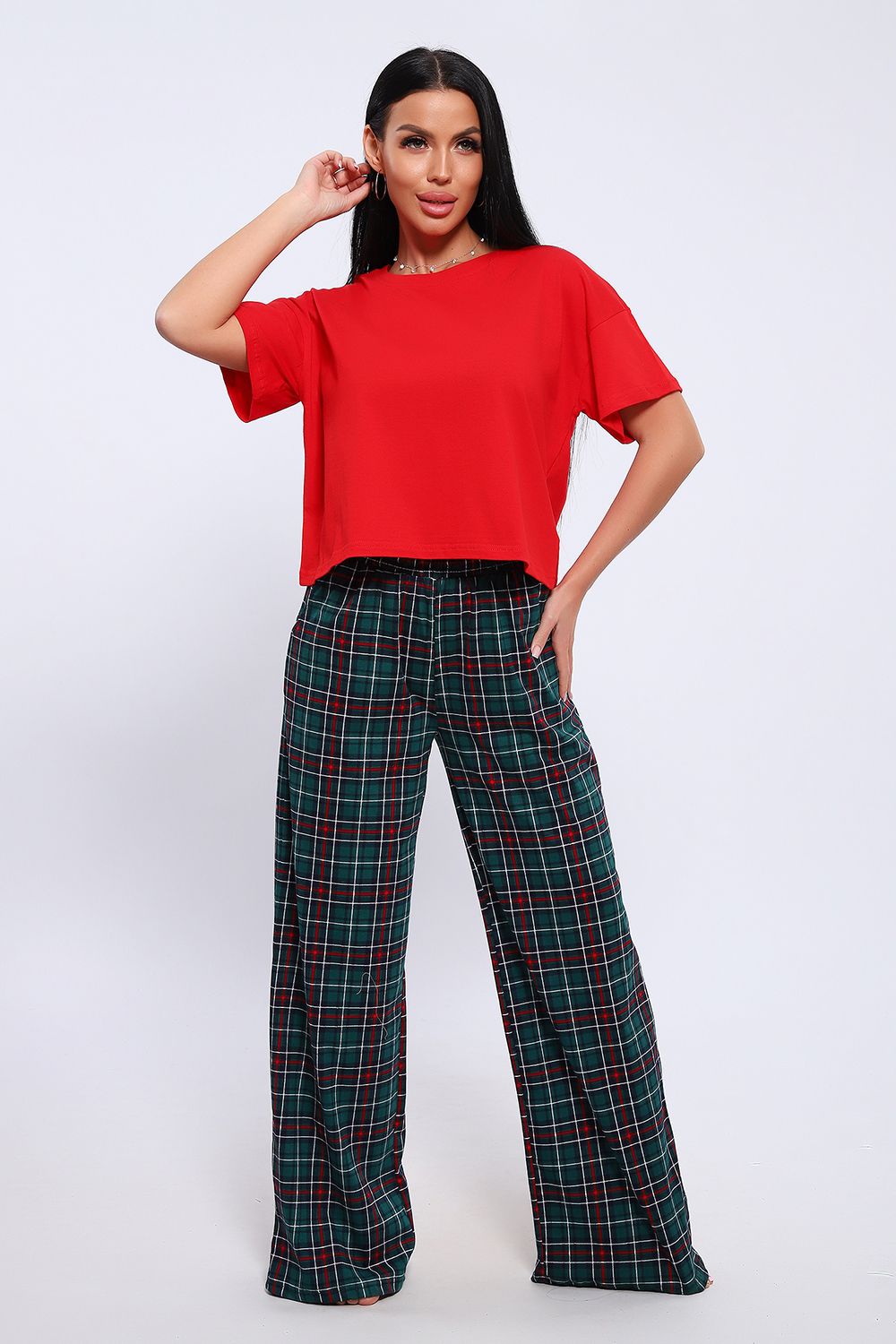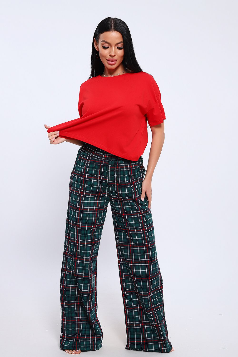 Домашняя женская пижама их мягкого хлопка. Свободная футболка прямого кроя, со смещенными плечевыми швами. Вырез горловины округлой формы с обтачкой. Длина футболки укорочена выше линии бедер, что является трендом сезона. Широкие брюки прямого кроя с высокой посадкой, с вместительными боковыми карманами, пояс на резинке с декоративной отстрочкой и атласным милым бантиком. Длина брюк стандартна, чуть ниже щиколотки.