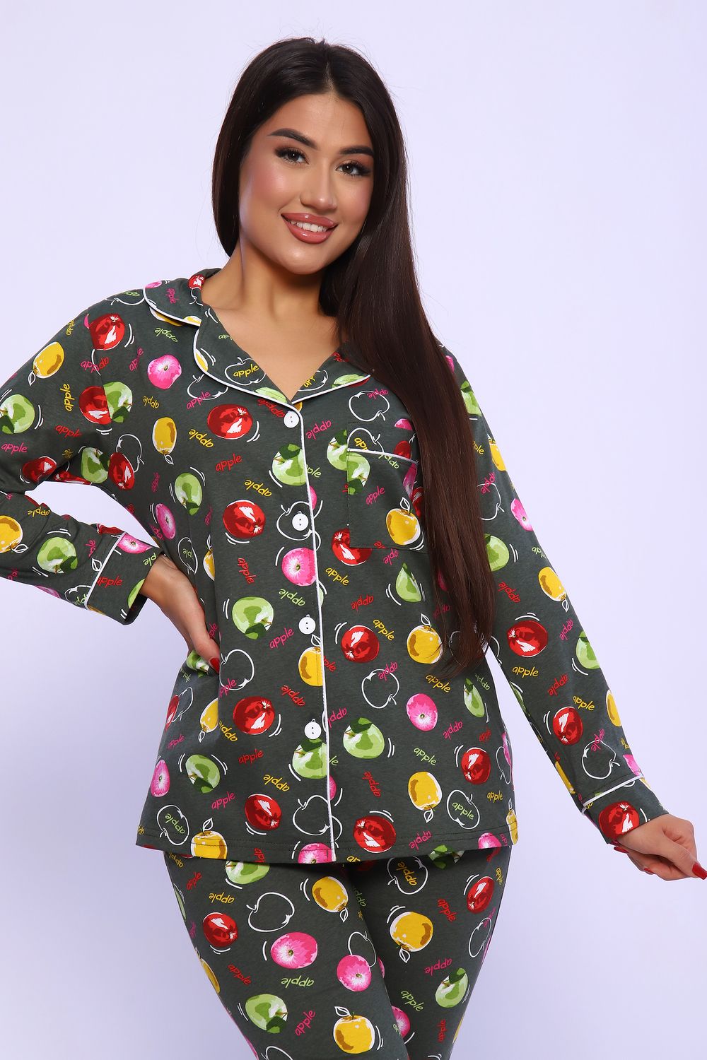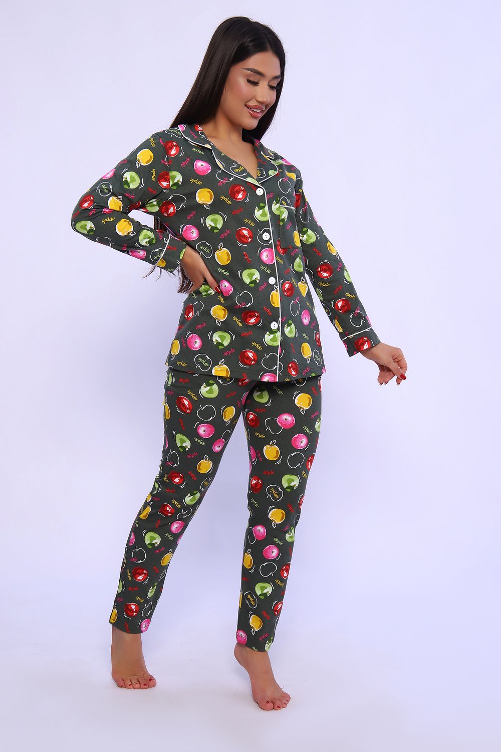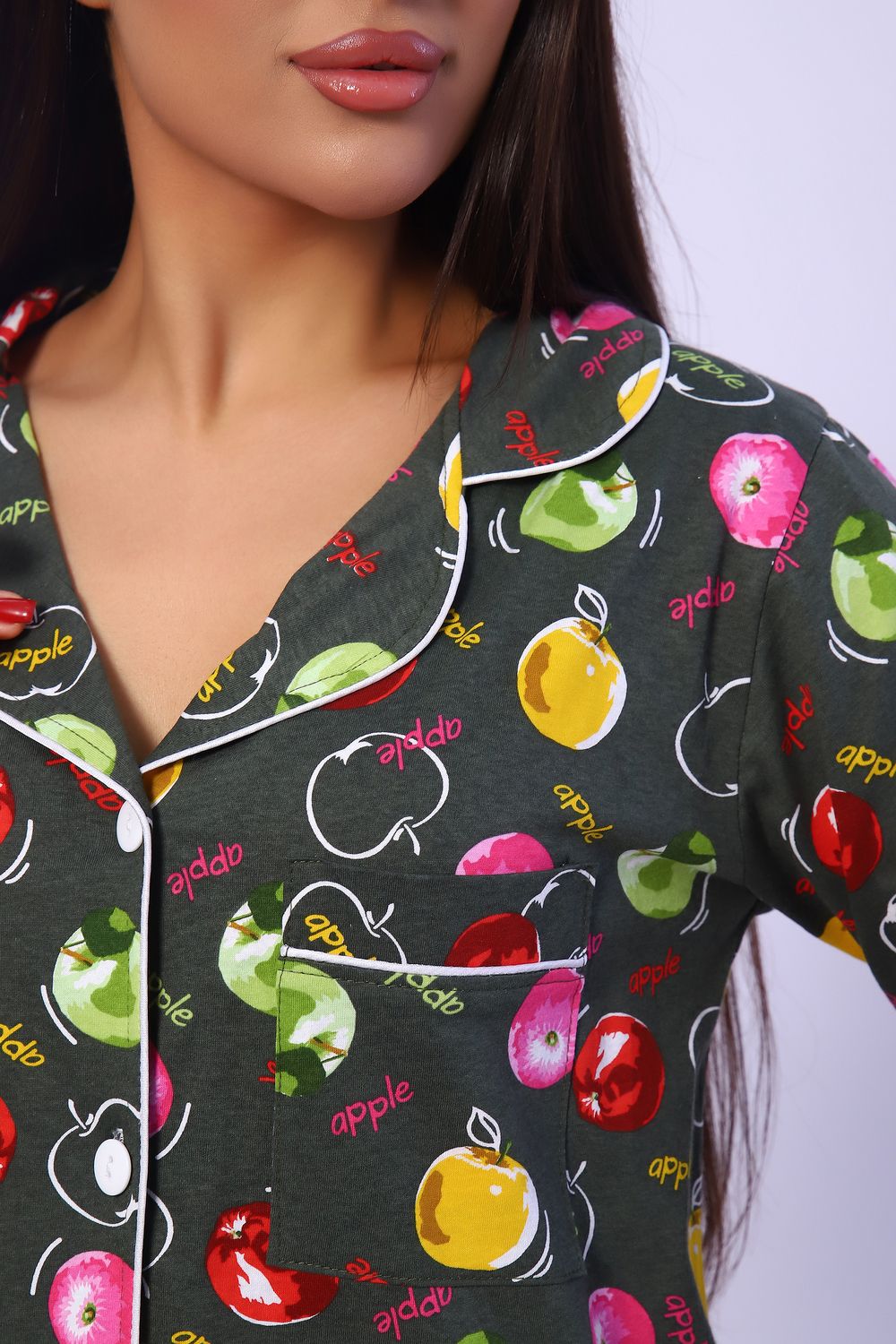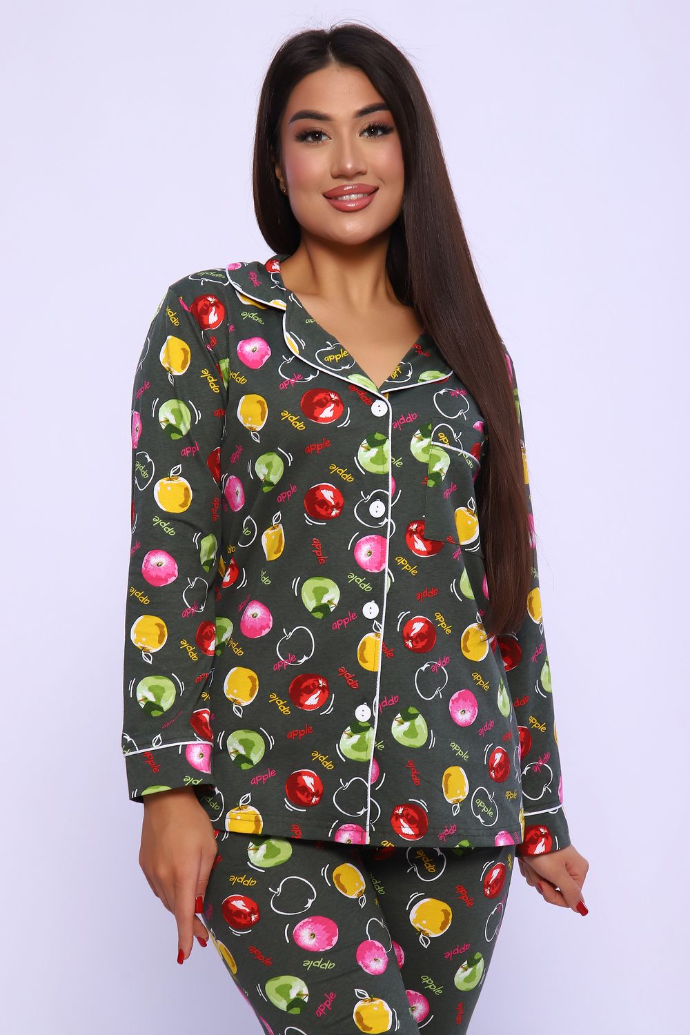 Пижама свободного кроя из мягкой хлопчатобумажной ткани. Комплект состоит из кофты и брюк. Кофта с длинным рукавом, на пуговках и с карманом на груди. Атласный кант по подборту, воротнику, карману и манжету. Брюки прямые с карманами. Эта пижама отлично подойдет как домашний костюм, так и для сна. А расцветка сочные яблоки поднимет настроение.