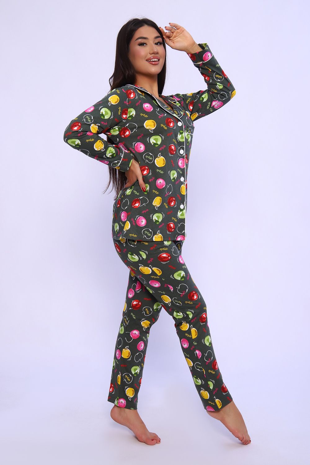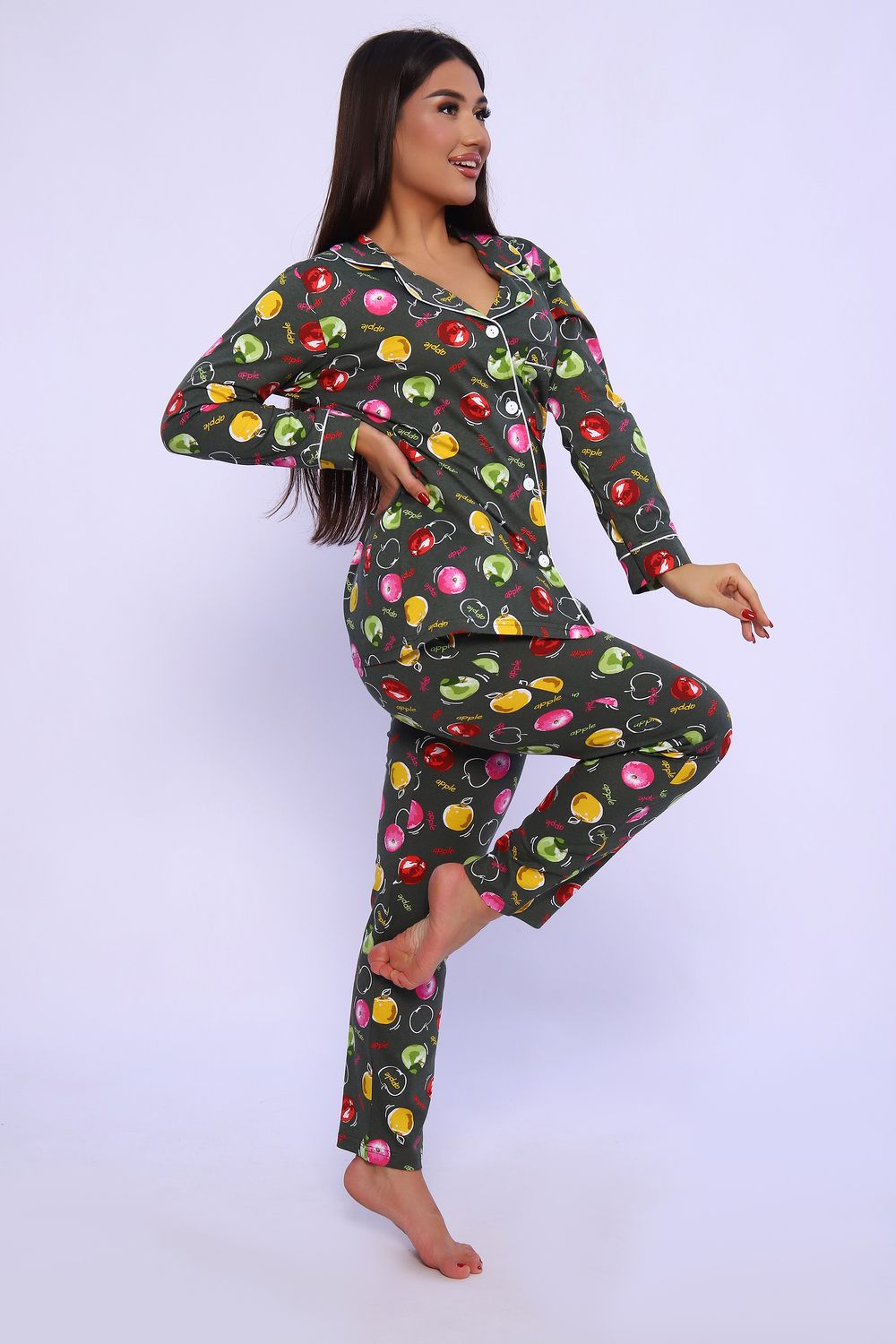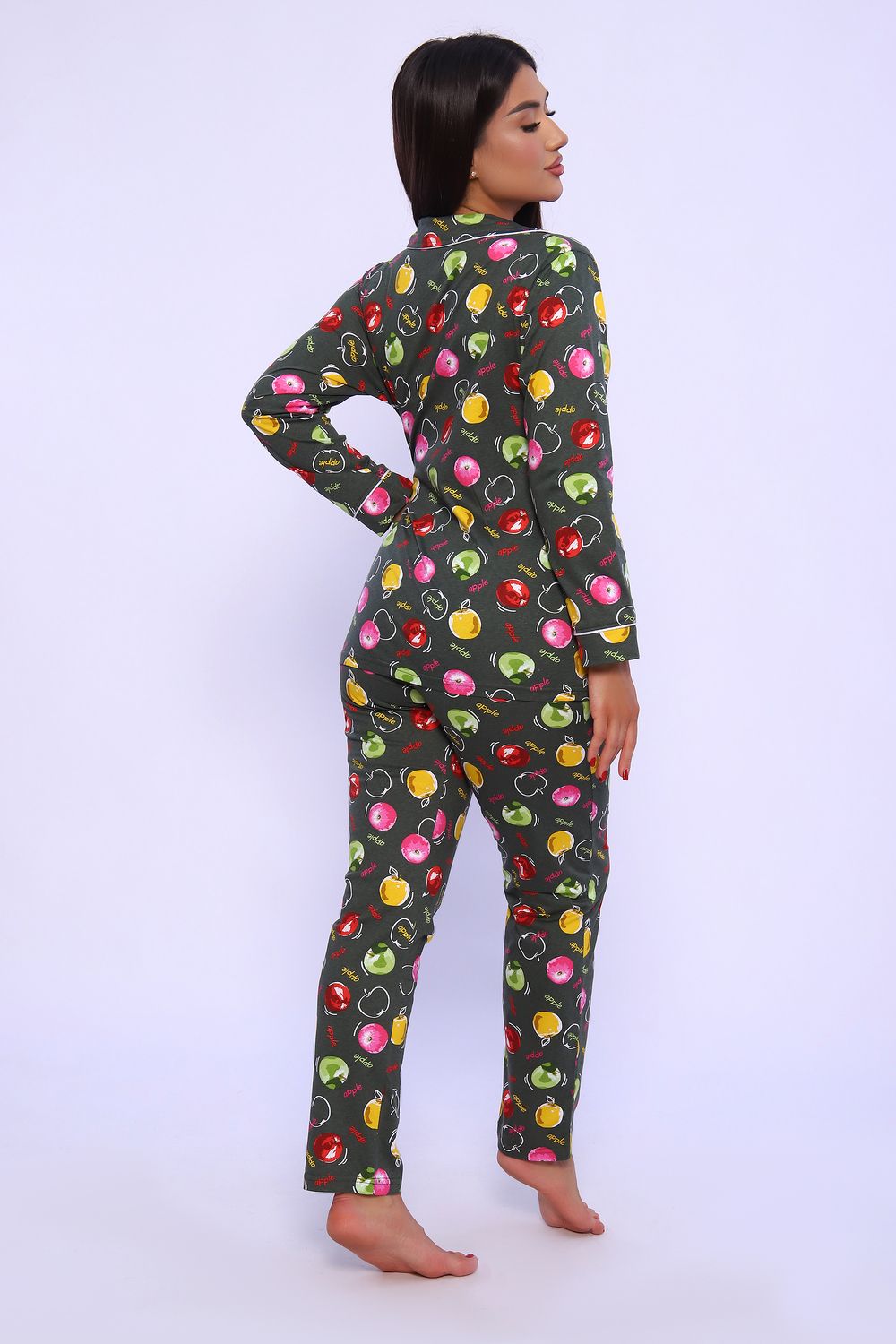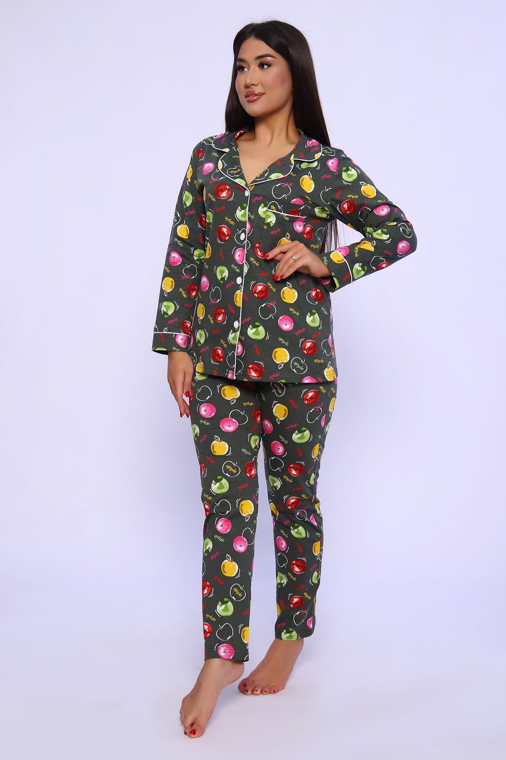 Пижама свободного кроя из мягкой хлопчатобумажной ткани. Комплект состоит из кофты и брюк. Кофта с длинным рукавом, на пуговках и с карманом на груди. Атласный кант по подборту, воротнику, карману и манжету. Брюки прямые с карманами. Эта пижама отлично подойдет как домашний костюм, так и для сна. А расцветка сочные яблоки поднимет настроение.