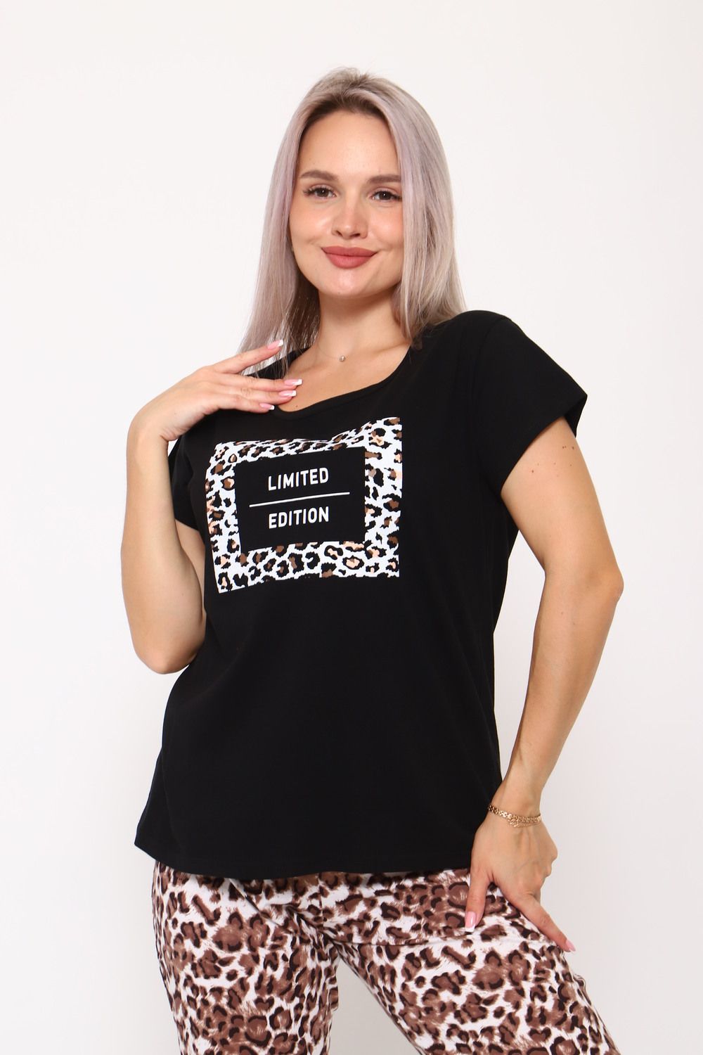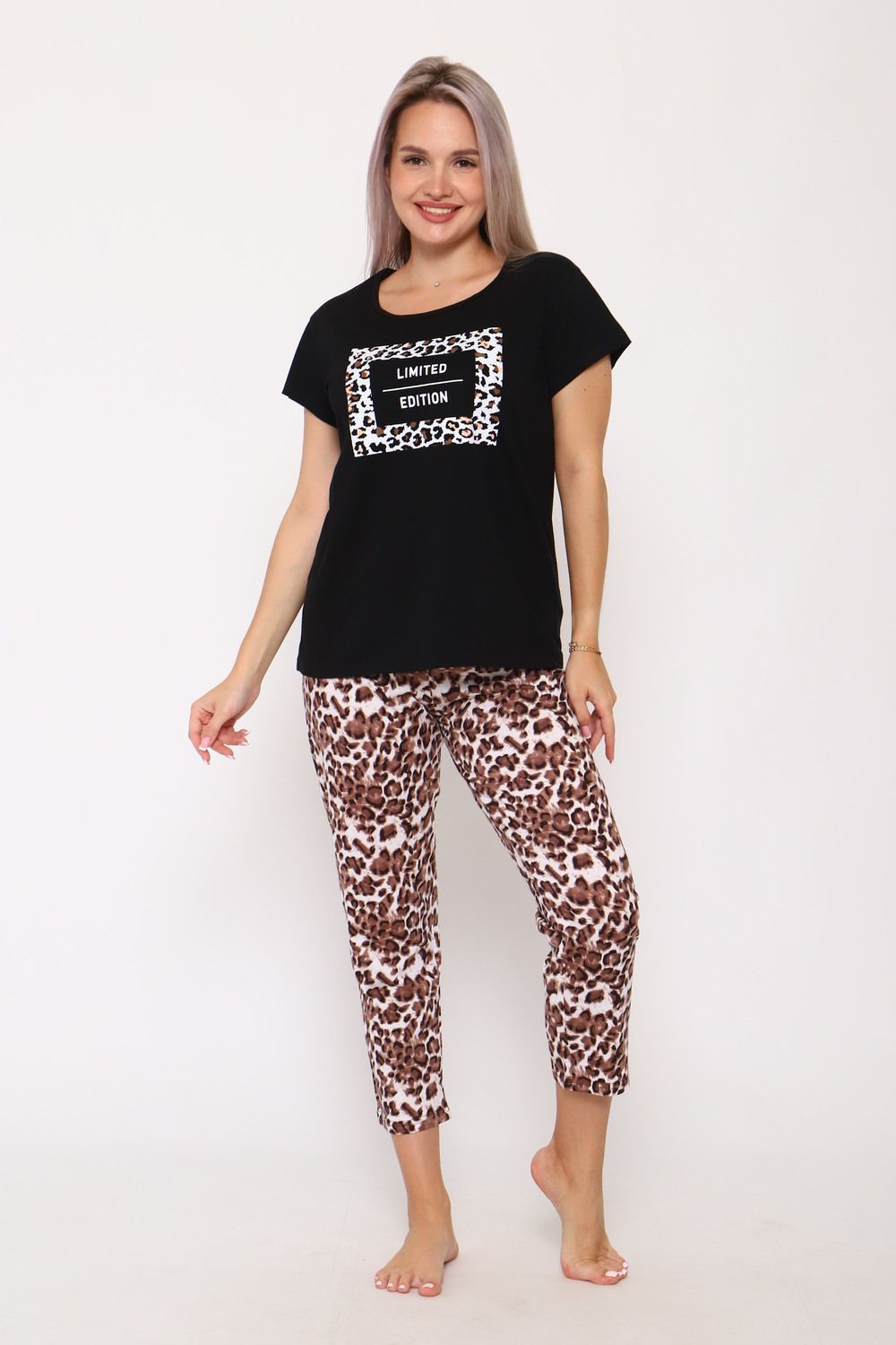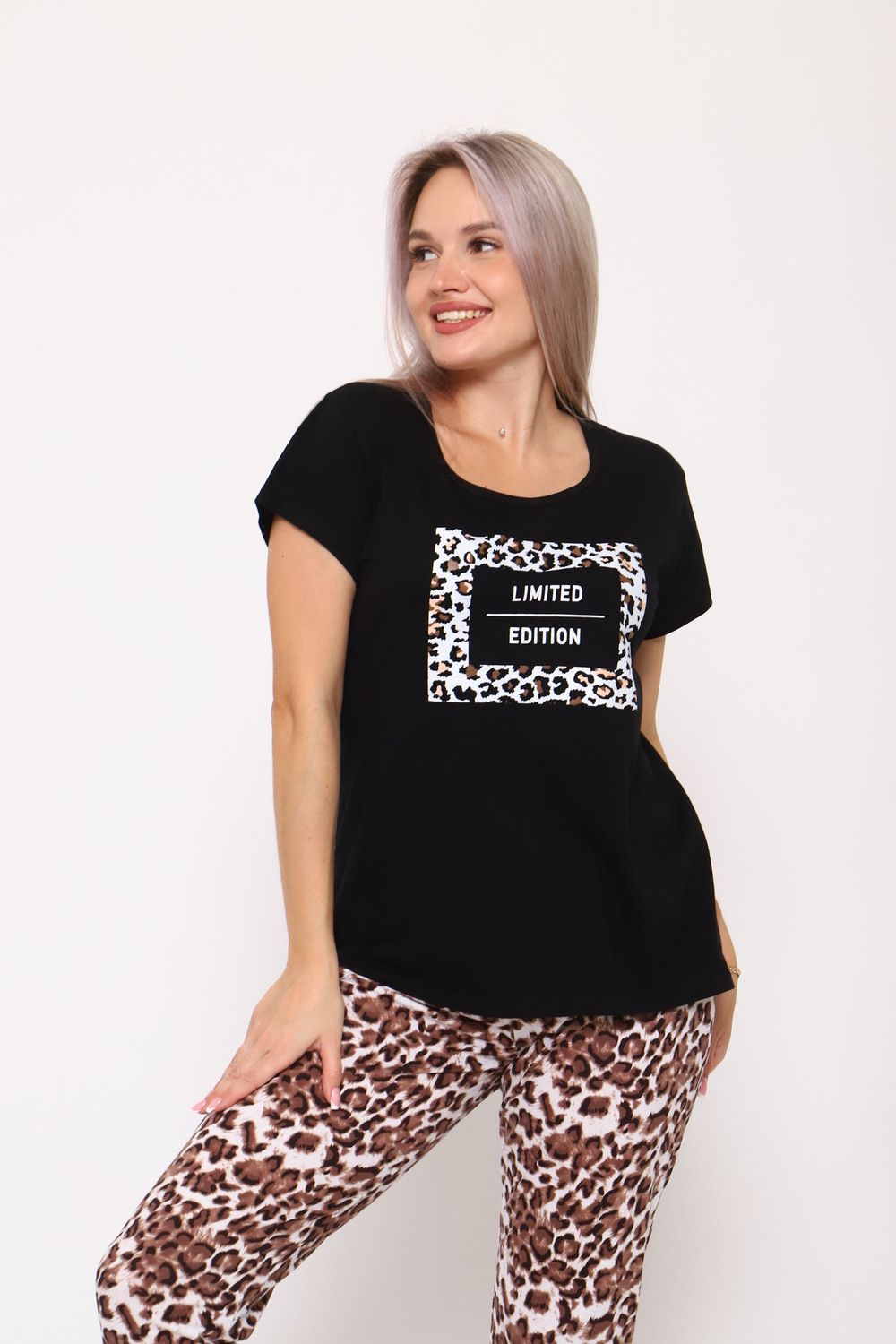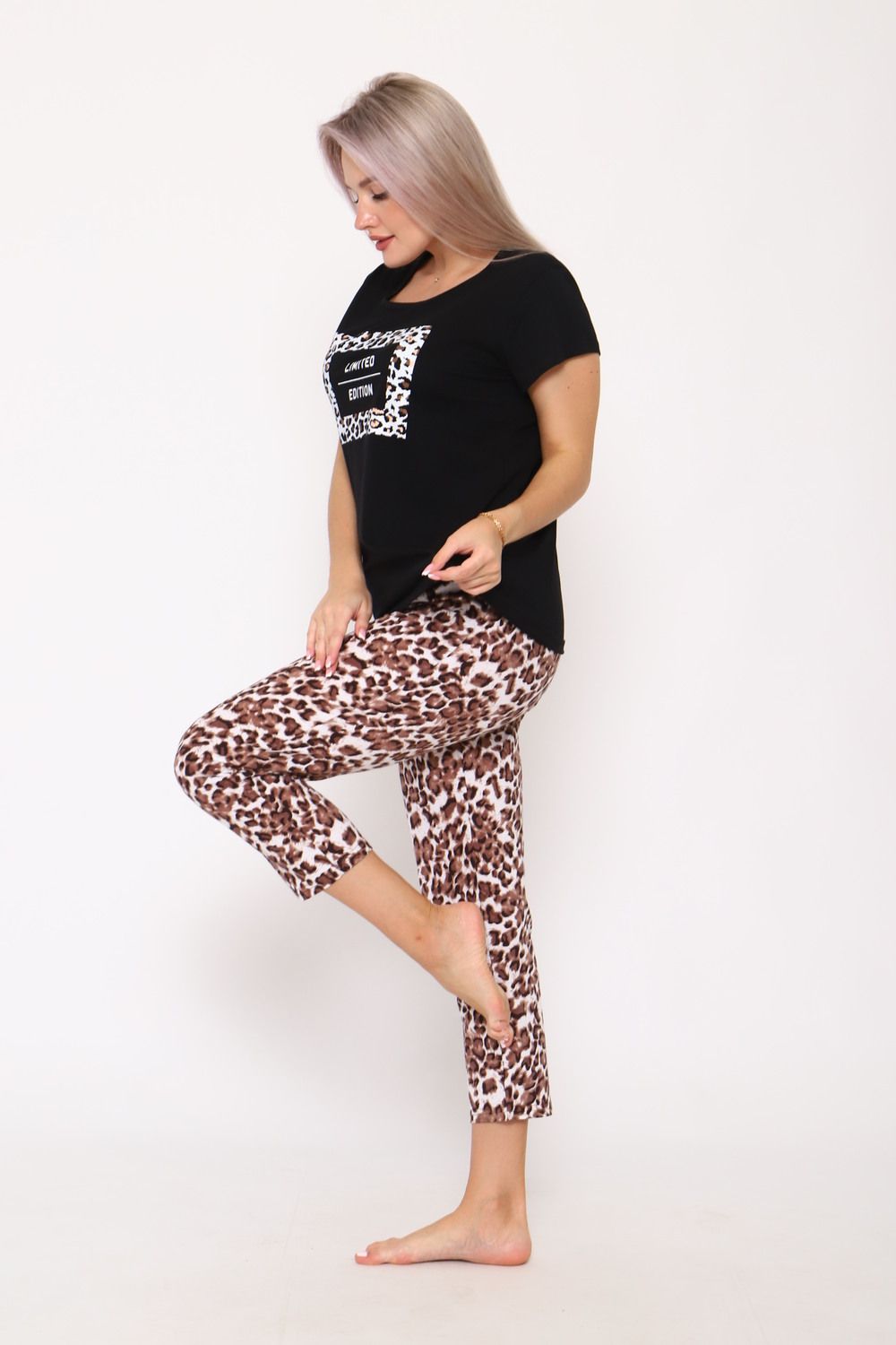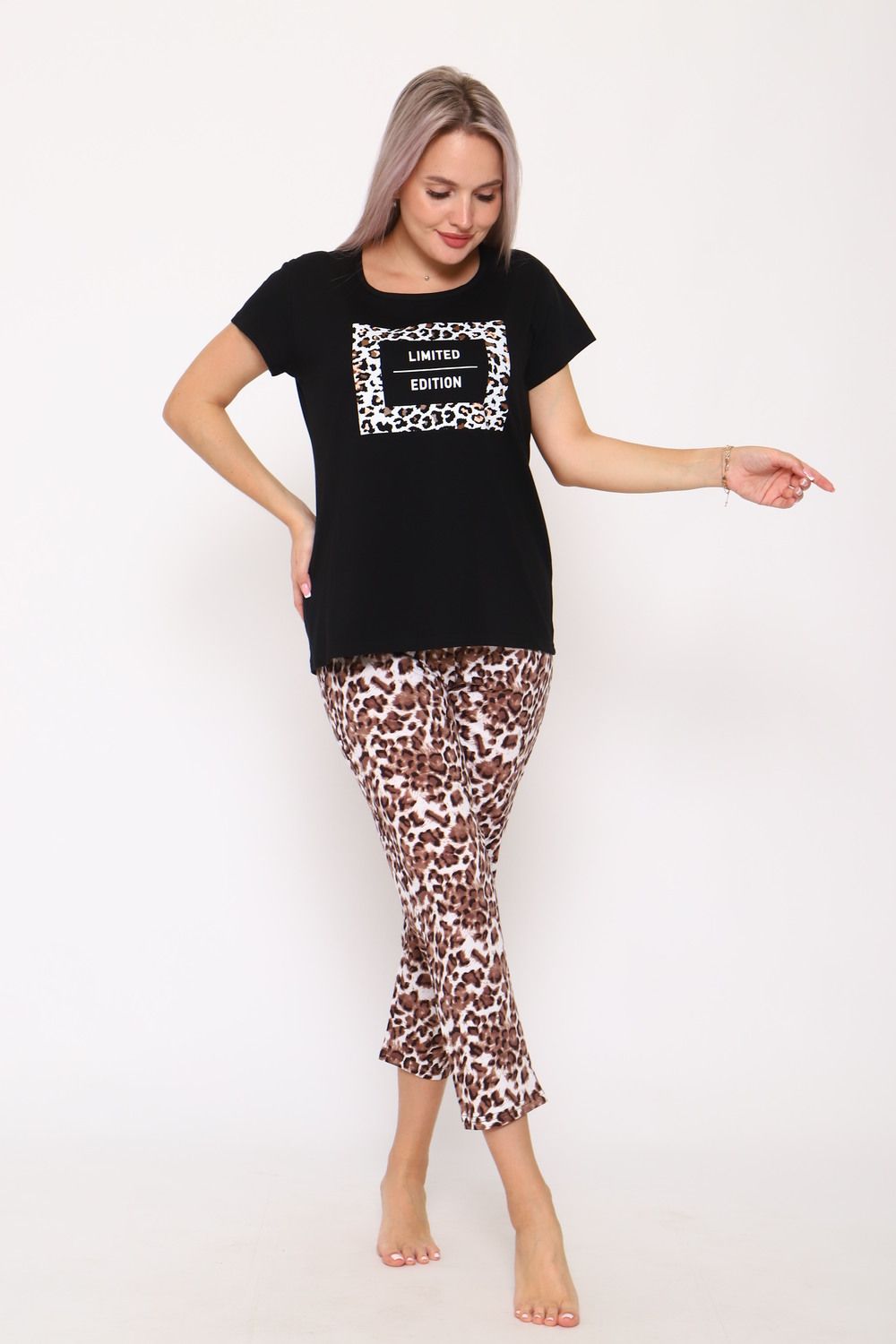Яркая женская пижама. Футболка черного цвета с красивым принтом в виде леопардового квадрата, рукав короткий. Брюки в схожем окрасом леопарда. Пижама отлично подойдет как домашний костюм, так для отдыха и сна.