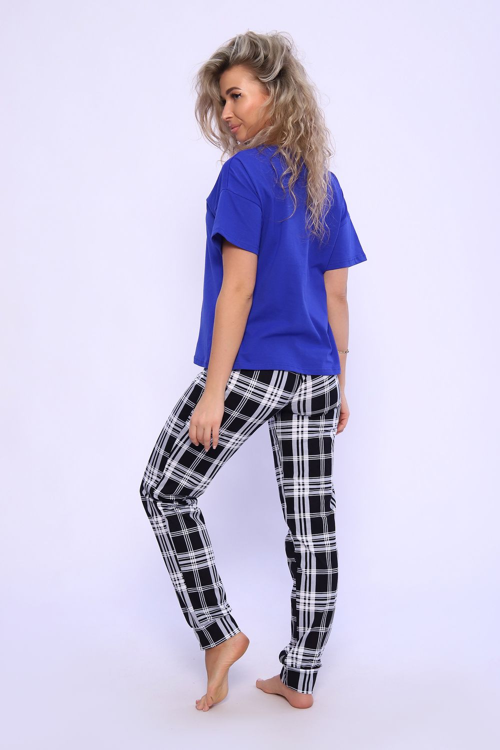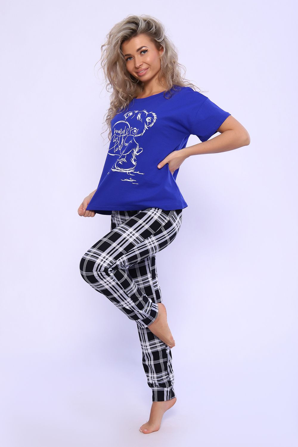 Пижама женская с брюками в клетку. Данная модель выполнена из трикотажного полотна кулирка хлопок 100%. Отличная модель для дома и отдыха. Футболка свободного покроя со спущенным рукавом. На полочке футболки присутствует принт.