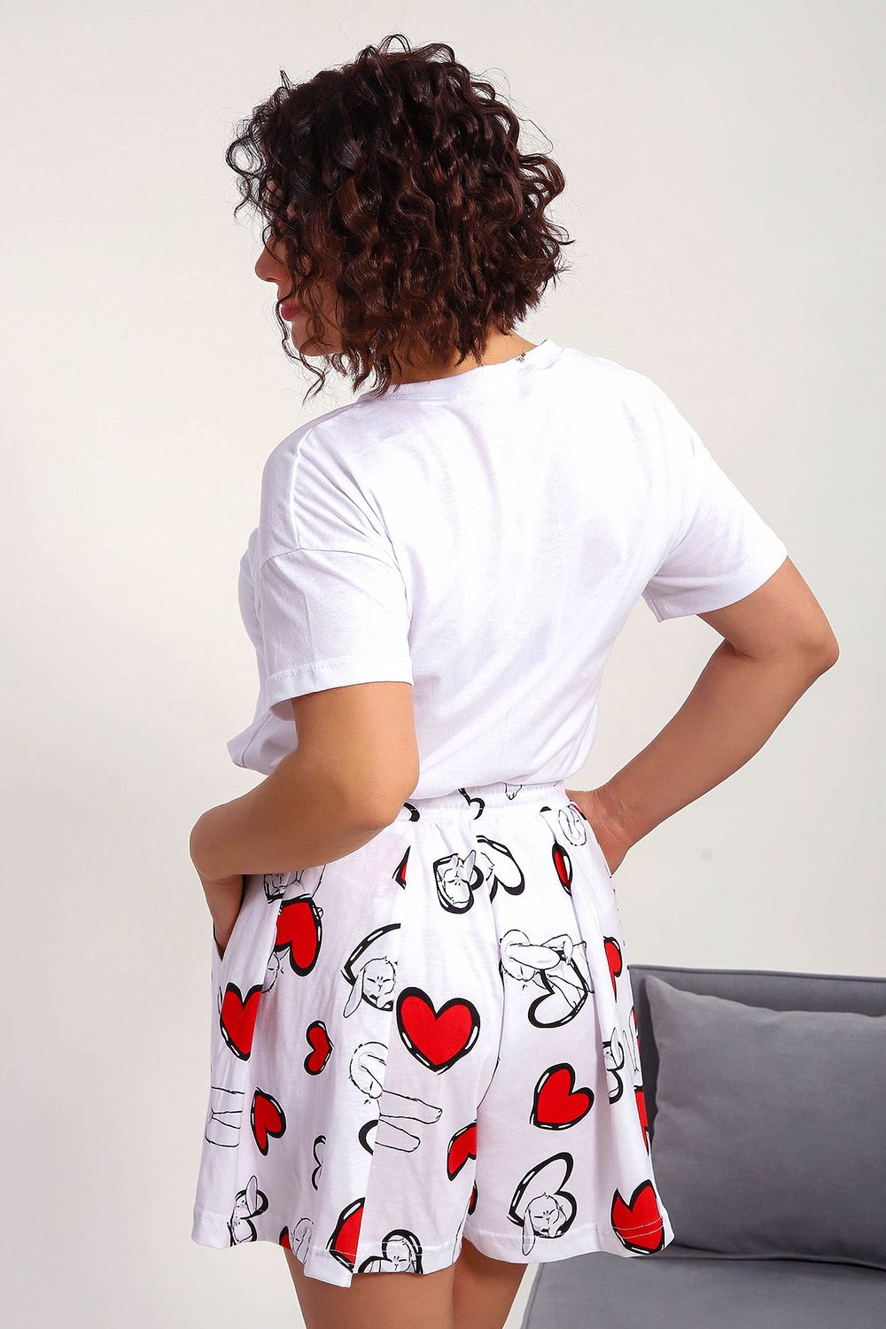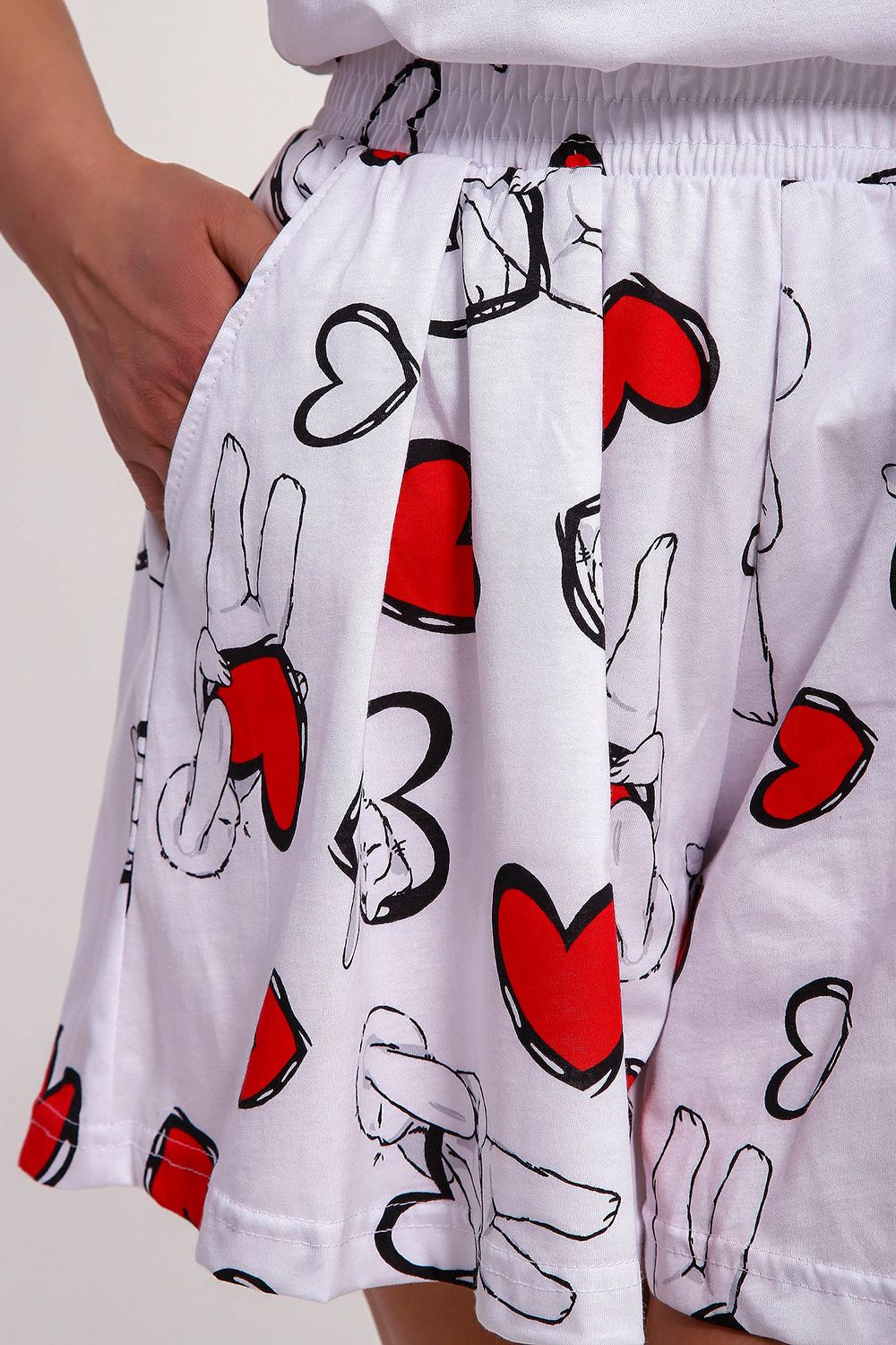 Пижама женская с шортами-юбка и футболкой со спущенным рукавом. Данная модель выполнена из трикотажного полотна кулирка ( хлопок 100%). На футболке присутствует принт. Шорты с поясом и карманами. Складки на шортах придают воздушность и комфорт, свобода в движениях. Пижама порадует вас.