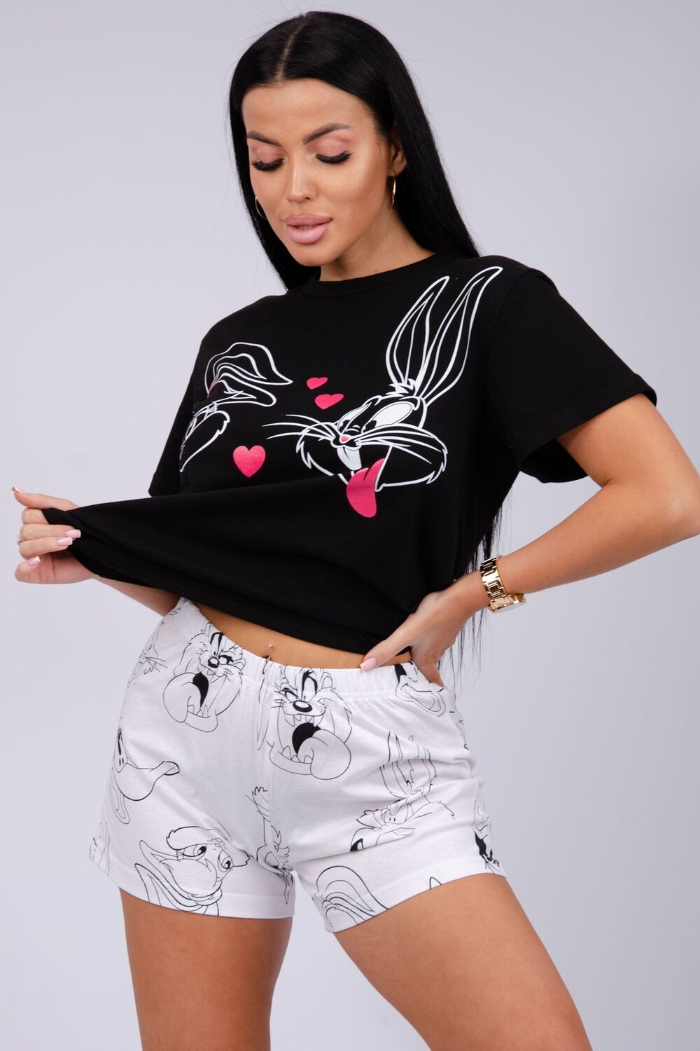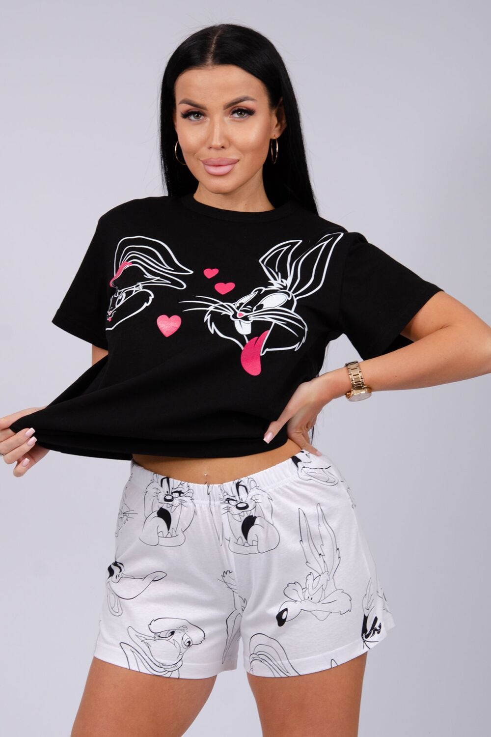 Пижама женская состоит из футболки с коротким рукавом и шортов. Футболка из однотонной кулирки с красивым принтом, шорты свободного покроя из ткани кулирка.