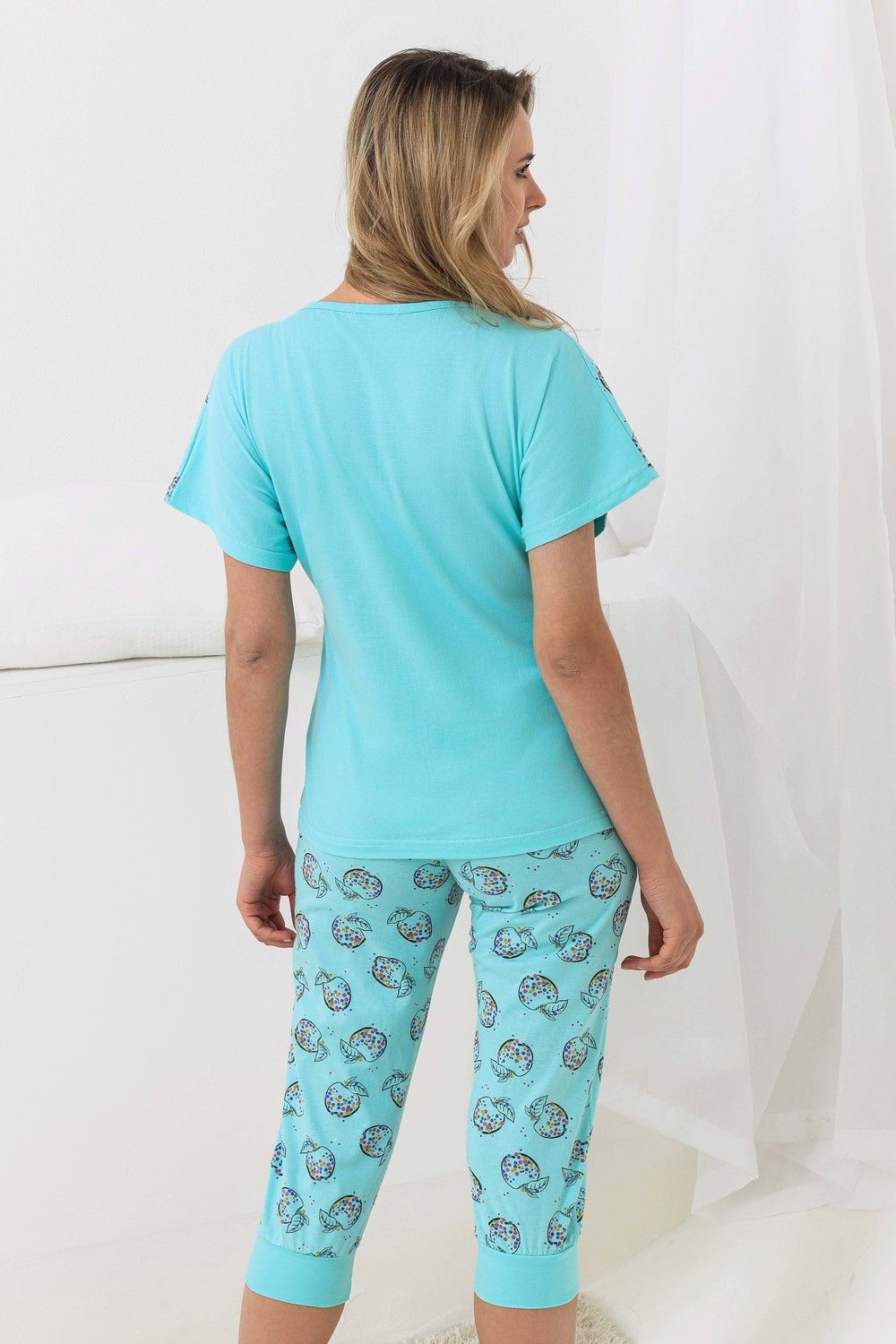 Пижама с цельнокроеным рукавом и контрастной кокеткой с рисунком. Бриджи на плотно прилегающей к ноге манжете. Очень удобный крой. Печать - три яблочка с глитером.