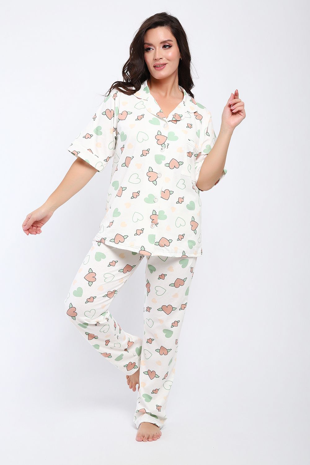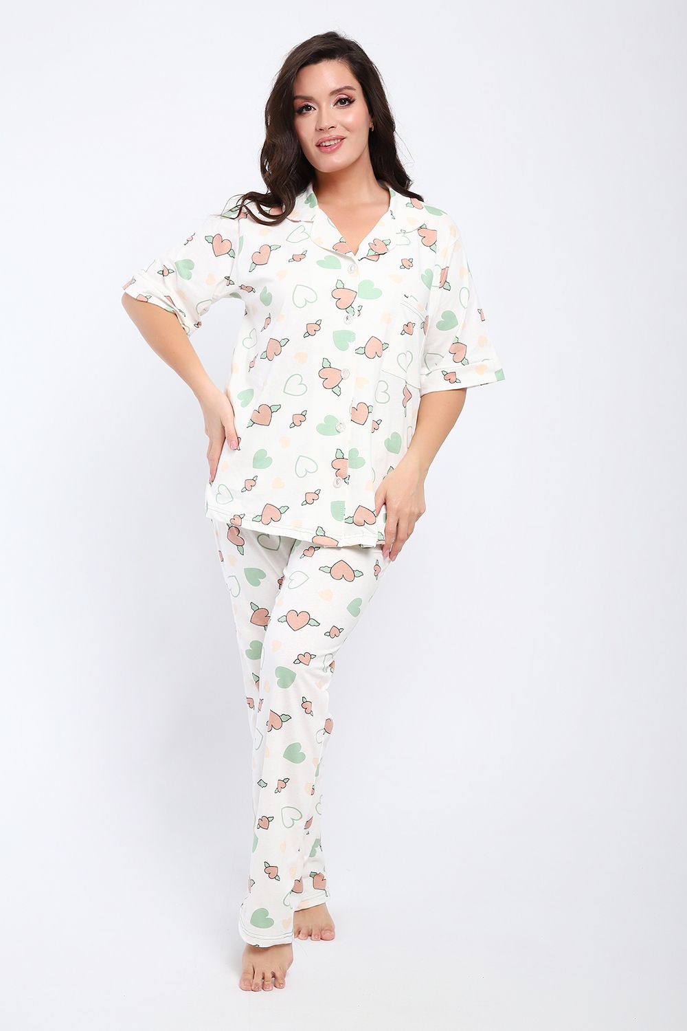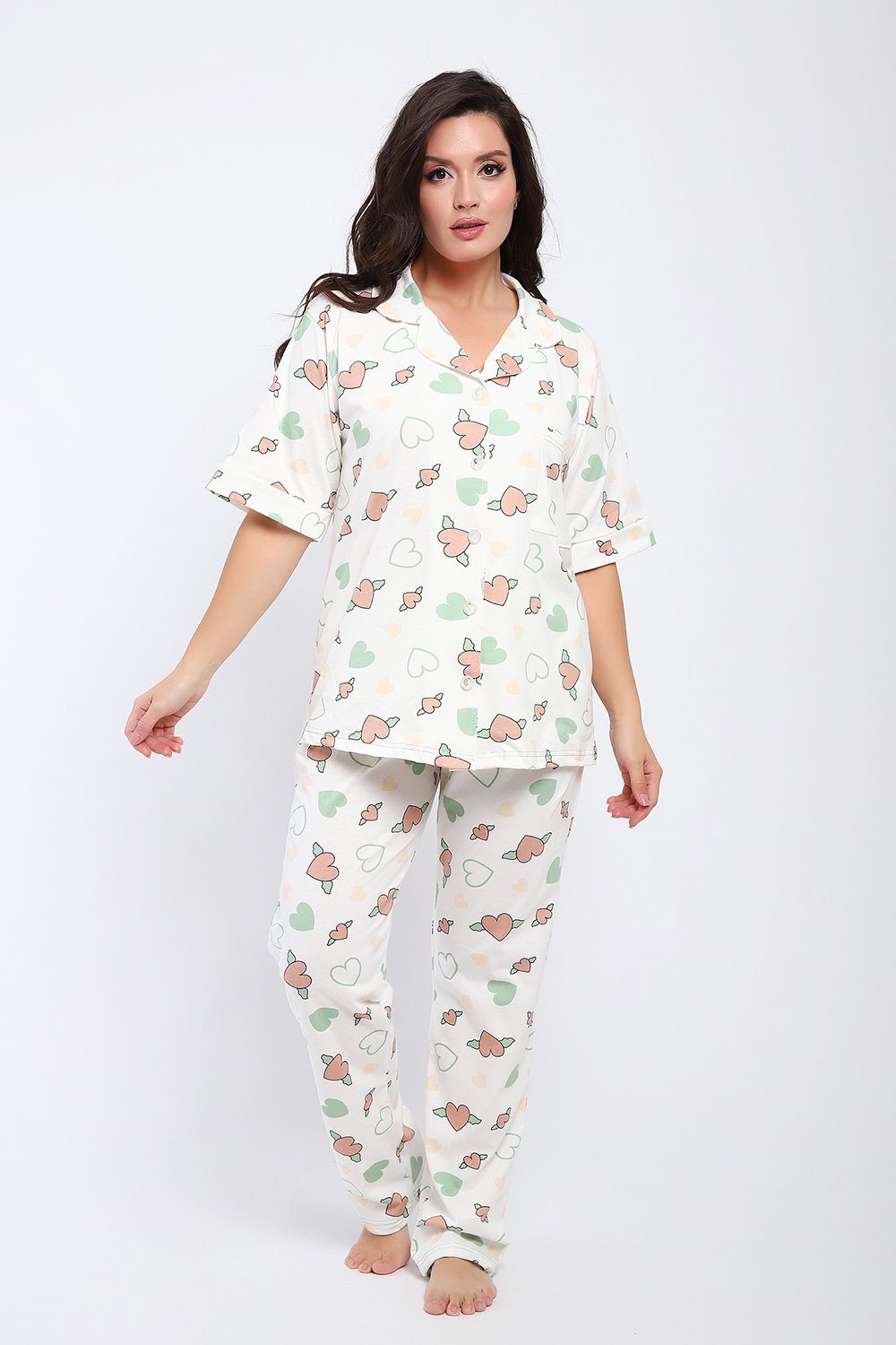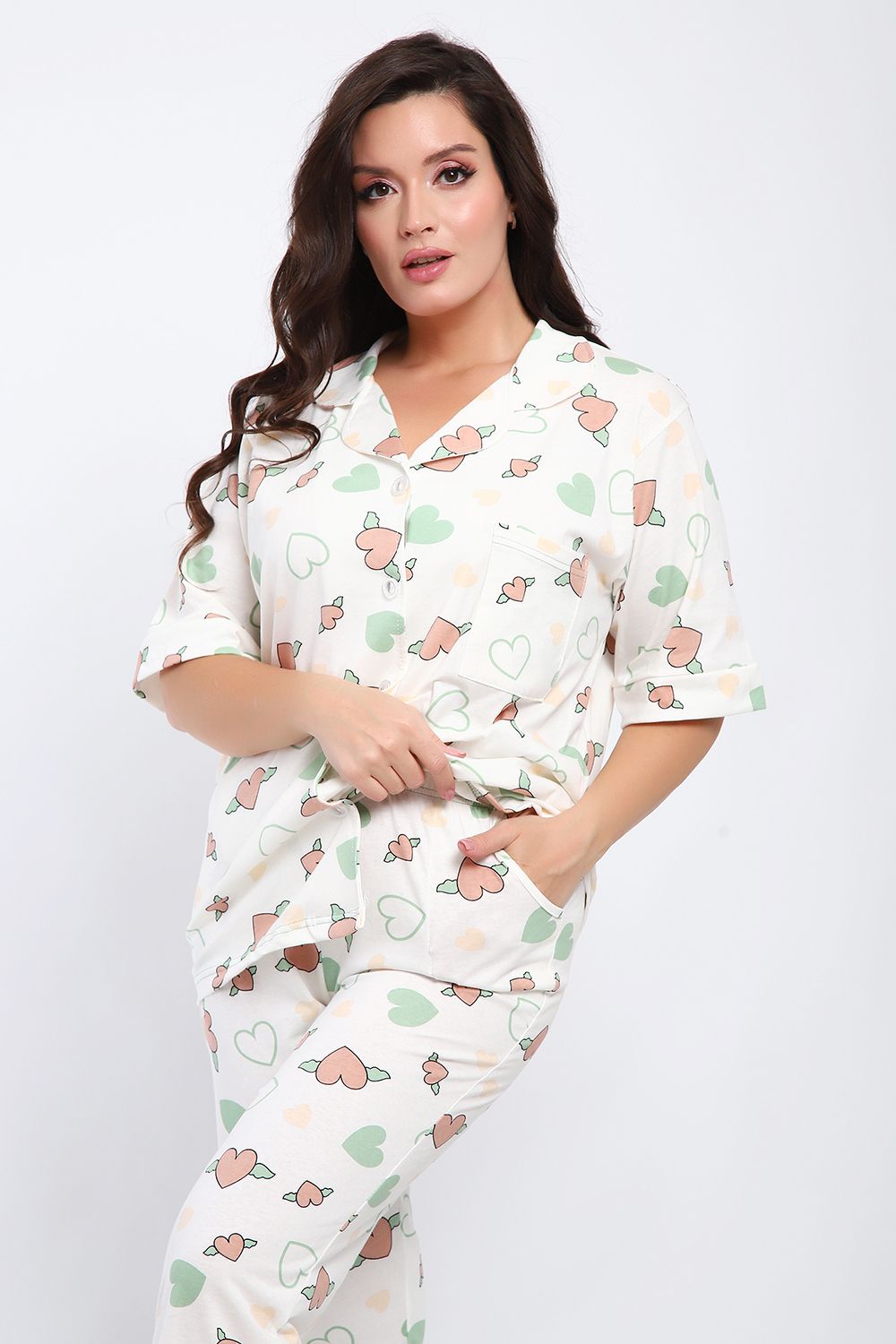 Женская пижама состоит из рубашки и брюк. В этом ансамбле вы найдете все - трендовая расцветка, идеальная посадка, широкий размерный ряд. Рубашка свободного покроя застегивается на 5 пуговиц, на груди накладной карман. Брюки прямого покроя с карманами по бокам. Выглядеть прекрасно дома - это просто.