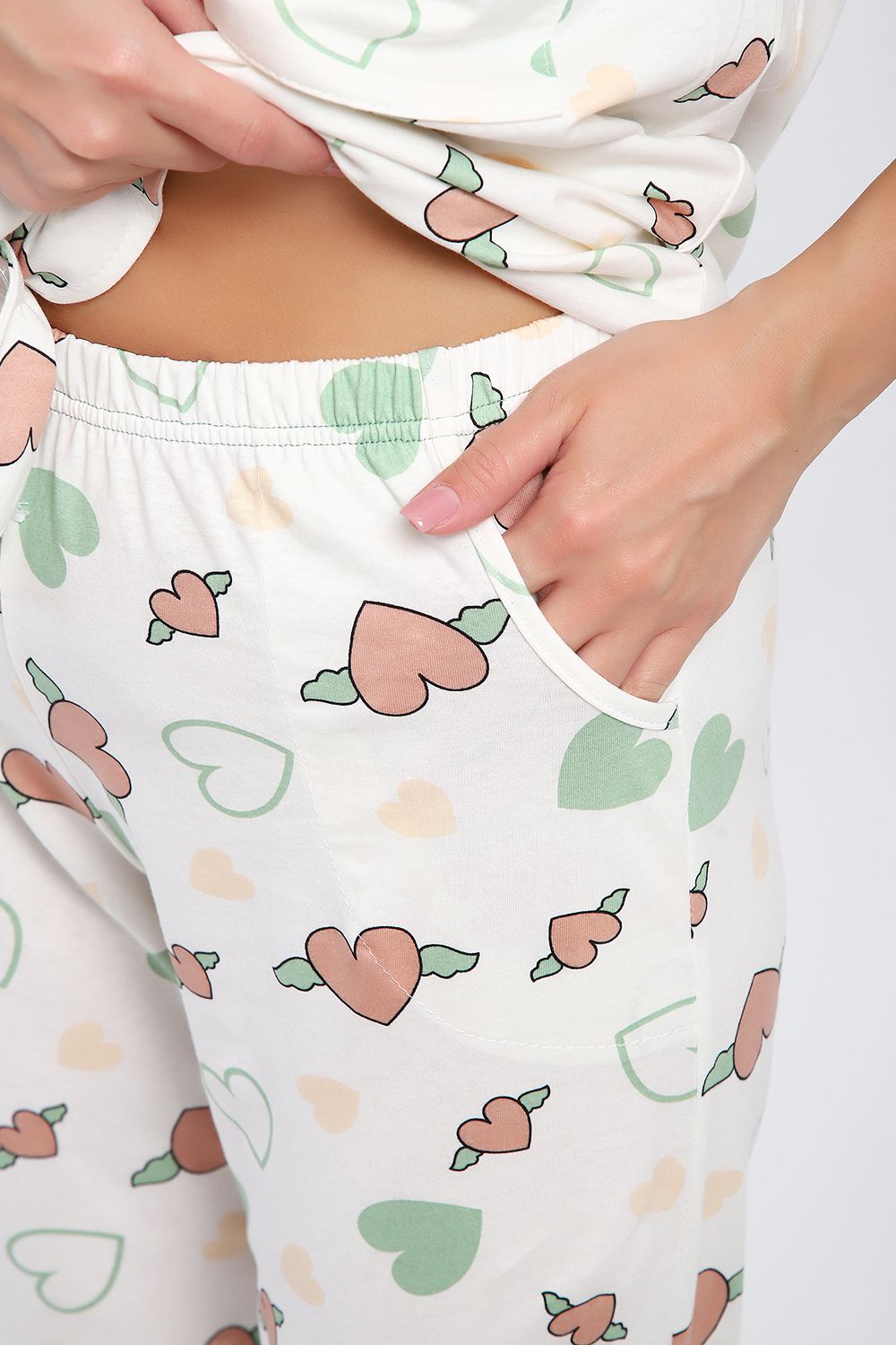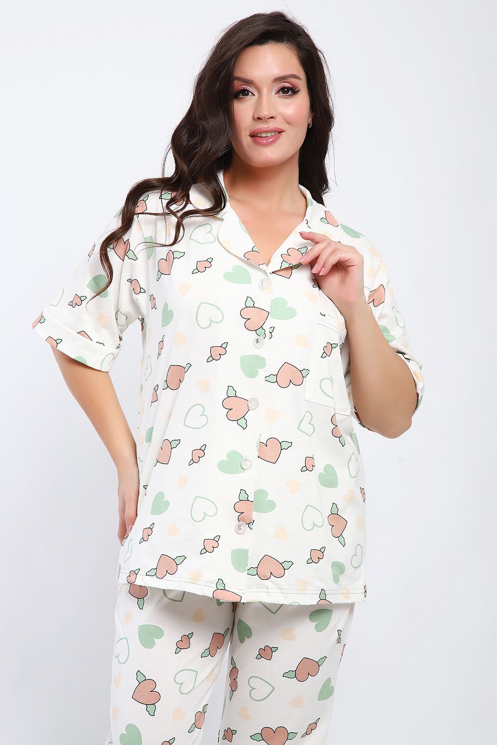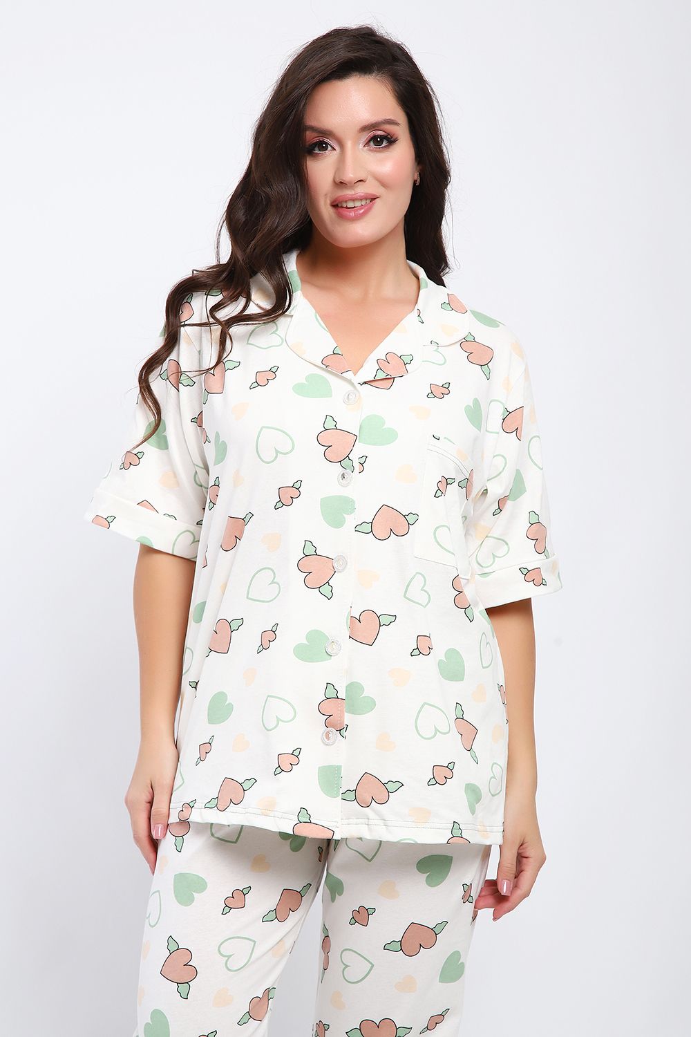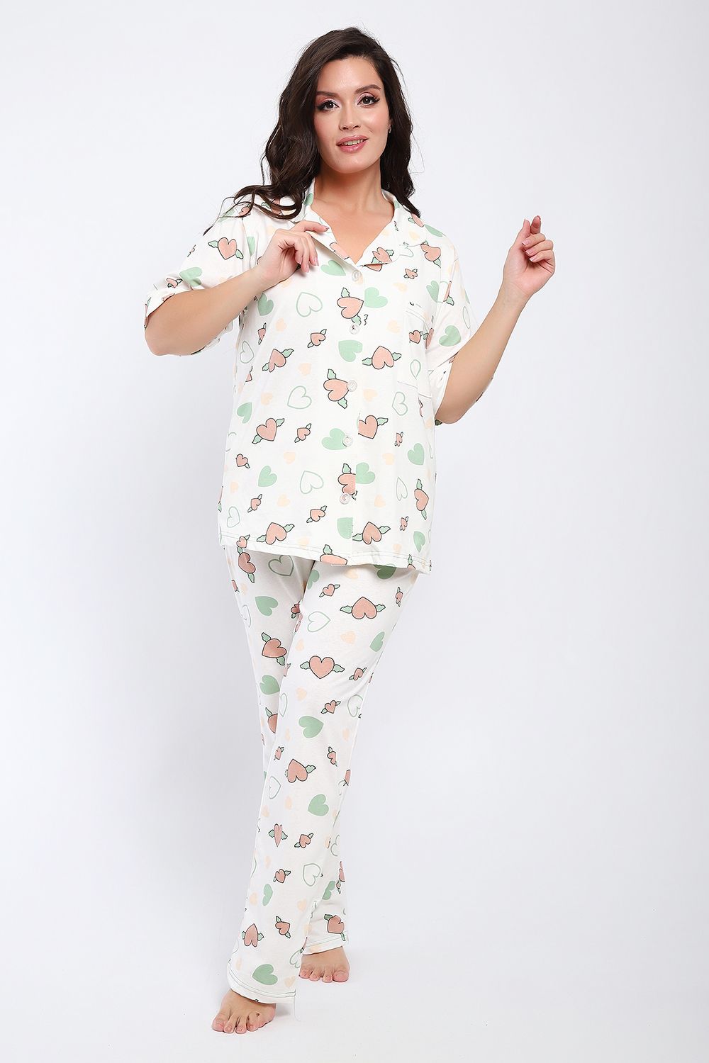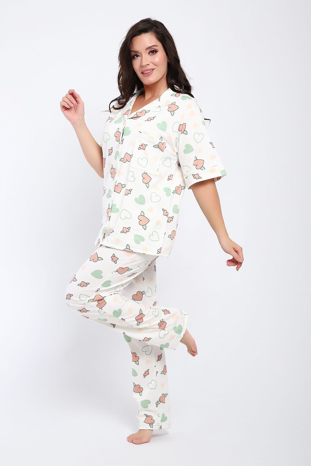 Женская пижама состоит из рубашки и брюк. В этом ансамбле вы найдете все - трендовая расцветка, идеальная посадка, широкий размерный ряд. Рубашка свободного покроя застегивается на 5 пуговиц, на груди накладной карман. Брюки прямого покроя с карманами по бокам. Выглядеть прекрасно дома - это просто.