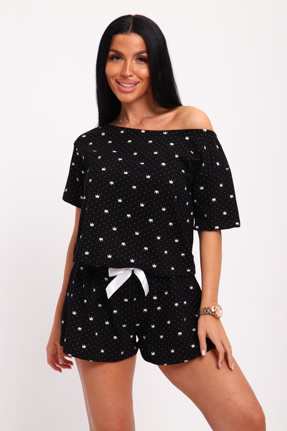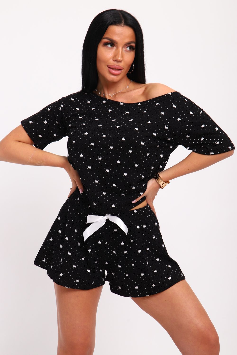 Пижама женская футболка и шорты. Футболка свободного кроя с широким вырезом горловины. Рукав короткий на спущенном плече.