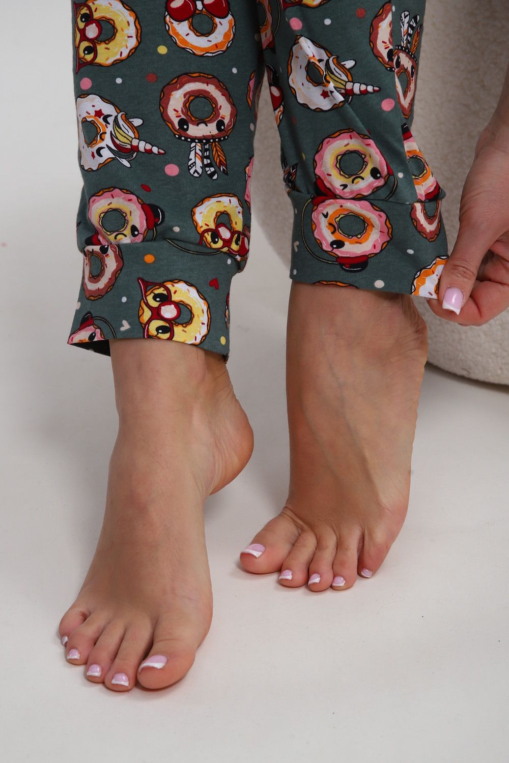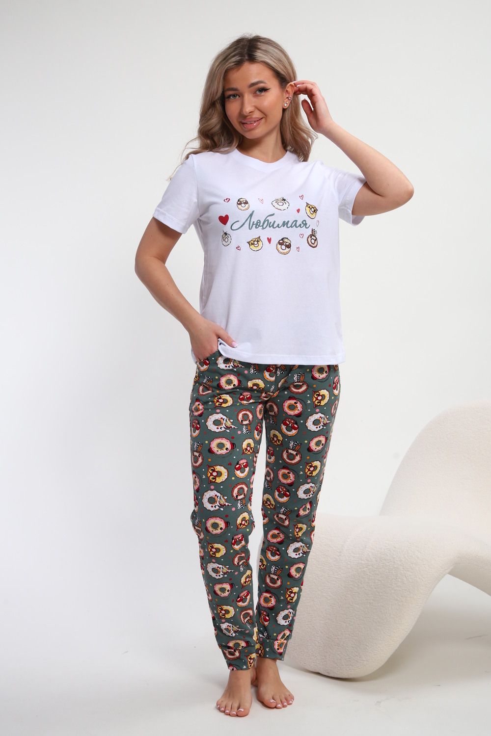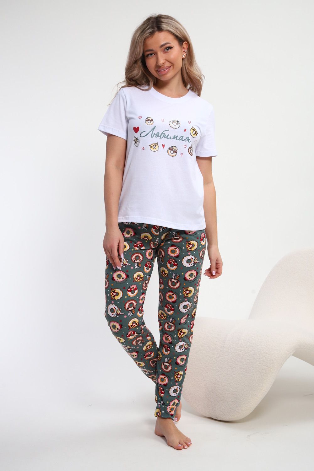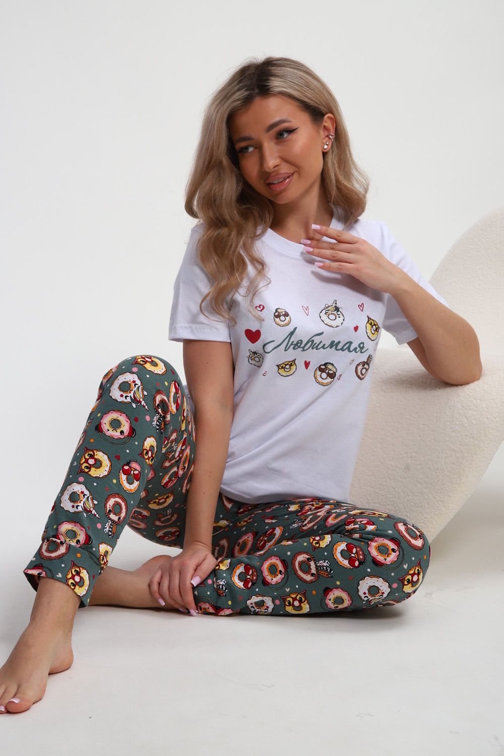Мы рады представить вам милую и уютную натуральную хлопковую одежду для сна и отдыха от бренда JEXY, которая станет неотъемлемой частью твоего домашнего комфорта в День всех влюбленных, самый романтичный день года – День святого Валентина! Комплект состоит из белой футболки с забавным принтом сладостей, единорога, лошадки с надписью "Любимая" и зеленых штанов цвета хаки с прикольным принтом. Этот легкий костюм из мягкого хлопка подарит незабываемое ощущение нежности и уюта в холодные зимние дни, позволяя чувствовать себя комфортно и стильно.